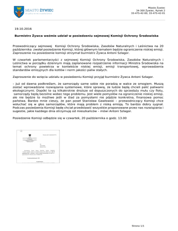 Miasto Żywiec 34-300 Żywiec, Rynek 2 33-475-42-00, 33-475-42-01 19.10.2016 Burmistrz Żywca weźmie udział w posiedzeniu sejmowej Komisji Ochrony Środowiska Przewodniczący sejmowej Komisji Ochrony Środowiska, Zasobów Naturalnych i Leśnictwa na 20 października zwołał posiedzenie Komisji, której głównym tematem będzie ograniczenie niskiej emisji. Zaproszenie na posiedzenie komisji otrzymał burmistrz Żywca Antoni Szlagor. W czwartek parlamentarzyści z sejmowej Komisji Ochrony Środowiska, Zasobów Naturalnych i Leśnictwa w porządku dziennym mają zaplanowane rozpatrzenie informacji Ministra Środowiska na temat ochrony powietrza w kontekście niskiej emisji, emisji transportowej, wprowadzenia standardów emisyjnych dla kotłów i norm jakości paliw stałych. Zaproszenie do wzięcia udziału w posiedzeniu Komisji przyjął burmistrz Żywca Antoni Szlagor. – Już od dawna podkreślam, że samorządy same sobie nie poradzą w walce ze smogiem. Muszą zostać wprowadzone rozwiązania systemowe, które sprawią, że ludzie będą chcieli palić paliwami ekologicznymi. Dopóki te są kilkakrotnie droższe od dopuszczonych do sprzedaży mułu czy flotu, samorządy będą bezsilne wobec tego problemu. Jest wiele pomysłów na ograniczenie niskiej emisji, ale nie będzie to możliwe jeśli w ślad za pomysłami nie pójdzie konkretna, finansowa pomoc państwa. Bardzo mnie cieszy, że pan poseł Stanisław Gawłowski – przewodniczący Komisji chce wsłuchać się w głos samorządów, które mają problem z niską emisją. To bardzo dobry sygnał. Podczas posiedzenia Komisji będę chciał przedstawić wszystkie proponowane przez nas rozwiązania i sugestie, jakie każdego dnia otrzymuję od mieszkańców – mówi Antoni Szlagor. Posiedzenie Komisji odbędzie się w czwartek, 20 października o godz. 13.00 Strona 1/1 Powered by TCPDF (www.tcpdf.org)