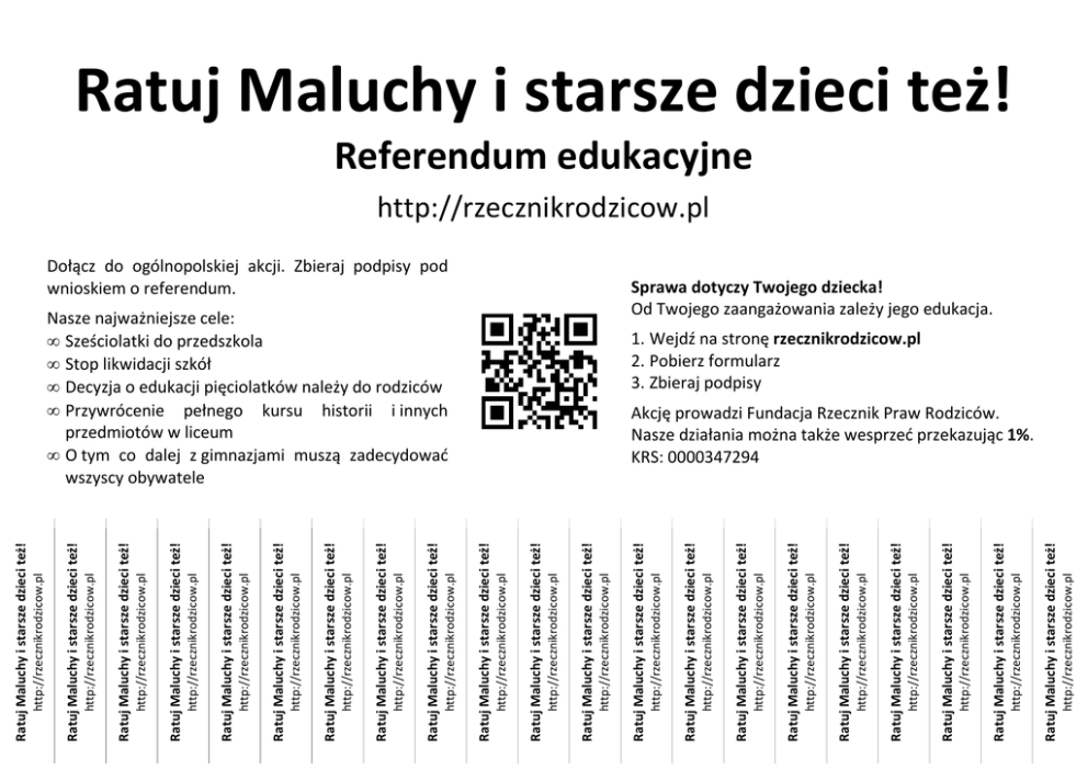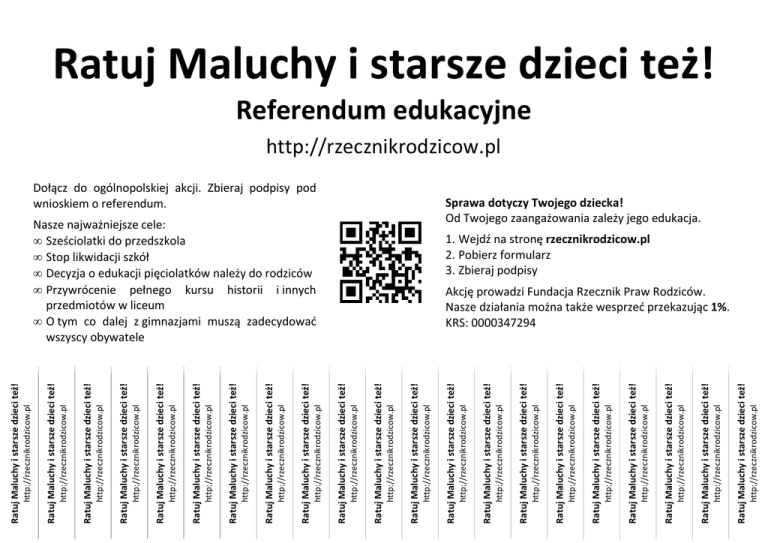 http://rzecznikrodzicow.pl Ratuj Maluchy i starsze dzieci też! http://rzecznikrodzicow.pl Ratuj Maluchy i starsze dzieci też! http://rzecznikrodzicow.pl Ratuj Maluchy i starsze dzieci też! http://rzecznikrodzicow.pl Ratuj Maluchy i starsze dzieci też! http://rzecznikrodzicow.pl Ratuj Maluchy i starsze dzieci też! http://rzecznikrodzicow.pl Ratuj Maluchy i starsze dzieci też! http://rzecznikrodzicow.pl Ratuj Maluchy i starsze dzieci też! http://rzecznikrodzicow.pl Ratuj Maluchy i starsze dzieci też! Nasze najważniejsze cele: • Sześciolatki do przedszkola • Stop likwidacji szkół • Decyzja o edukacji pięciolatków należy do rodziców • Przywrócenie pełnego kursu historii i innych przedmiotów w liceum • O tym co dalej z gimnazjami muszą zadecydować wszyscy obywatele http://rzecznikrodzicow.pl Dołącz do ogólnopolskiej akcji. Zbieraj podpisy pod wnioskiem o referendum. Ratuj Maluchy i starsze dzieci też! http://rzecznikrodzicow.pl Ratuj Maluchy i starsze dzieci też! http://rzecznikrodzicow.pl Ratuj Maluchy i starsze dzieci też! http://rzecznikrodzicow.pl Ratuj Maluchy i starsze dzieci też! http://rzecznikrodzicow.pl Ratuj Maluchy i starsze dzieci też! http://rzecznikrodzicow.pl Ratuj Maluchy i starsze dzieci też! http://rzecznikrodzicow.pl Ratuj Maluchy i starsze dzieci też! http://rzecznikrodzicow.pl Ratuj Maluchy i starsze dzieci też! http://rzecznikrodzicow.pl Ratuj Maluchy i starsze dzieci też! http://rzecznikrodzicow.pl Ratuj Maluchy i starsze dzieci też! http://rzecznikrodzicow.pl Ratuj Maluchy i starsze dzieci też! http://rzecznikrodzicow.pl Ratuj Maluchy i starsze dzieci też! http://rzecznikrodzicow.pl Ratuj Maluchy i starsze dzieci też! Ratuj Maluchy i starsze dzieci też! Referendum edukacyjne http://rzecznikrodzicow.pl Sprawa dotyczy Twojego dziecka! Od Twojego zaangażowania zależy jego edukacja. 1. Wejdź na stronę rzecznikrodzicow.pl 2. Pobierz formularz 3. Zbieraj podpisy Akcję prowadzi Fundacja Rzecznik Praw Rodziców. Nasze działania można także wesprzeć przekazując 1%. KRS: 0000347294