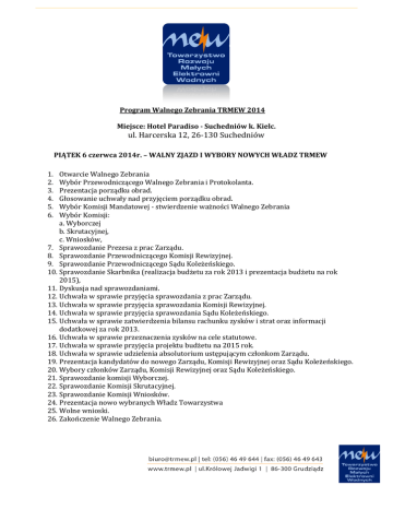 Program Walnego Zebrania TRMEW 2014 Miejsce: Hotel Paradiso - Suchedniów k. Kielc. ul. Harcerska 12, 26-130 Suchedniów PIĄTEK 6 czerwca 2014r. – WALNY ZJAZD I WYBORY NOWYCH WŁADZ TRMEW 1. 2. 3. 4. 5. 6. Otwarcie Walnego Zebrania Wybór Przewodniczącego Walnego Zebrania i Protokolanta. Prezentacja porządku obrad. Głosowanie uchwały nad przyjęciem porządku obrad. Wybór Komisji Mandatowej - stwierdzenie ważności Walnego Zebrania Wybór Komisji: a. Wyborczej b. Skrutacyjnej, c. Wniosków, 7. Sprawozdanie Prezesa z prac Zarządu. 8. Sprawozdanie Przewodniczącego Komisji Rewizyjnej. 9. Sprawozdanie Przewodniczącego Sądu Koleżeńskiego. 10. Sprawozdanie Skarbnika (realizacja budżetu za rok 2013 i prezentacja budżetu na rok 2015), 11. Dyskusja nad sprawozdaniami. 12. Uchwała w sprawie przyjęcia sprawozdania z prac Zarządu. 13. Uchwała w sprawie przyjęcia sprawozdania Komisji Rewizyjnej. 14. Uchwała w sprawie przyjęcia sprawozdania Sądu Koleżeńskiego. 15. Uchwała w sprawie zatwierdzenia bilansu rachunku zysków i strat oraz informacji dodatkowej za rok 2013. 16. Uchwała w sprawie przeznaczenia zysków na cele statutowe. 17. Uchwała w sprawie przyjęcia projektu budżetu na 2015 rok. 18. Uchwała w sprawie udzielenia absolutorium ustępującym członkom Zarządu. 19. Prezentacja kandydatów do nowego Zarządu, Komisji Rewizyjnej oraz Sądu Koleżeńskiego. 20. Wybory członków Zarządu, Komisji Rewizyjnej oraz Sądu Koleżeńskiego. 21. Sprawozdanie komisji Wyborczej. 22. Sprawozdanie Komisji Skrutacyjnej. 23. Sprawozdanie Komisji Wniosków. 24. Prezentacja nowo wybranych Władz Towarzystwa 25. Wolne wnioski. 26. Zakończenie Walnego Zebrania.