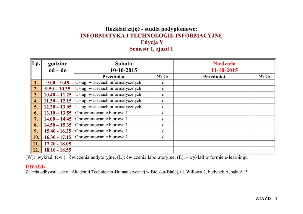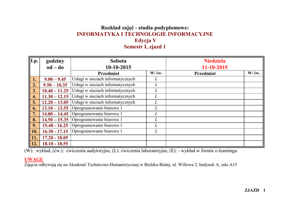 Rozkład zajęć - studia podyplomowe: INFORMATYKA I TECHNOLOGIE INFORMACYJNE Edycja V Semestr I, zjazd 1 Lp. godziny od – do Sobota 10-10-2015 Przedmiot Niedziela 11-10-2015 W/ ćw. Przedmiot W/ ćw. L 1. 9.00 – 9.45 Usługi w sieciach informatycznych L 2. 9.50 – 10.35 Usługi w sieciach informatycznych L 3. 10.40 – 11.25 Usługi w sieciach informatycznych L 4. 11.30 – 12.15 Usługi w sieciach informatycznych L 5. 12.20 – 13.05 Usługi w sieciach informatycznych L 6. 13.10 – 13.55 Oprogramowanie biurowe 1 L 7. 14.00 – 14.45 Oprogramowanie biurowe 1 L 8. 14.50 – 15.35 Oprogramowanie biurowe 1 L 9. 15.40 - 16.25 Oprogramowanie biurowe 1 L 10. 16.30 - 17.15 Oprogramowanie biurowe 1 11. 17.20 - 18.05 12. 18.10 - 18.55 (W): wykład, (ćw.): ćwiczenia audytoryjne, (L): ćwiczenia laboratoryjne, (E): - wykład w formie e-learningu UWAGI: Zajęcia odbywają się na Akademii Techniczno-Humanistycznej w Bielsku-Białej, ul. Willowa 2, budynek A, sala A15 ZJAZD 1 Rozkład zajęć - studia podyplomowe: INFORMATYKA I TECHNOLOGIE INFORMACYJNE Edycja V Semestr I, zjazd 2 Lp. godziny od – do Sobota 24-10-2015 Przedmiot Niedziela 25-10-2015 W/ ćw. Przedmiot W Oprogramowanie biurowe: e-learning 1. 9.00 – 9.45 Podstawy obsługi komputerów W Oprogramowanie biurowe: e-learning 2. 9.50 – 10.35 Podstawy obsługi komputerów W Oprogramowanie biurowe: e-learning 3. 10.40 – 11.25 Podstawy obsługi komputerów W Oprogramowanie biurowe: e-learning 4. 11.30 – 12.15 Podstawy obsługi komputerów W Oprogramowanie biurowe: e-learning 5. 12.20 – 13.05 Podstawy obsługi komputerów W Usługi w sieciach infor.: e-learning 6. 13.10 – 13.55 Podstawy obsługi komputerów L Usługi w sieciach infor.: e-learning 7. 14.00 – 14.45 Podstawy obsługi komputerów L Usługi w sieciach infor.: e-learning 8. 14.50 – 15.35 Podstawy obsługi komputerów L Usługi w sieciach infor.: e-learning 9. 15.40 - 16.25 Podstawy obsługi komputerów L Usługi w sieciach infor.: e-learning 10. 16.30 - 17.15 Podstawy obsługi komputerów 11. 17.20 - 18.05 12. 18.10 - 18.55 (W): wykład, (ćw.): ćwiczenia audytoryjne, (L): ćwiczenia laboratoryjne, (E): - wykład w formie e-learningu W/ ćw. E E E E E E E E E E UWAGI: Zajęcia odbywają się w sali ODZ Publisher-Innowacje w Cieszynie, ul Świeżego 8 ZJAZD 2 Rozkład zajęć - studia podyplomowe: INFORMATYKA I TECHNOLOGIE INFORMACYJNE Edycja V Semestr I, zjazd 3 Lp. godziny od – do Sobota 14-11-2015 Przedmiot Niedziela 15-11-2015 W/ ćw. Przedmiot L Oprogramowanie biurowe 1 1. 9.00 – 9.45 Usługi w sieciach informatycznych L Oprogramowanie biurowe 1 2. 9.50 – 10.35 Usługi w sieciach informatycznych L Oprogramowanie biurowe 1 3. 10.40 – 11.25 Usługi w sieciach informatycznych L Oprogramowanie biurowe 1 4. 11.30 – 12.15 Usługi w sieciach informatycznych L Oprogramowanie biurowe 1 5. 12.20 – 13.05 Usługi w sieciach informatycznych L Usługi w sieciach informatycznych 6. 13.10 – 13.55 Oprogramowanie biurowe 1 L Usługi w sieciach informatycznych 7. 14.00 – 14.45 Oprogramowanie biurowe 1 L Usługi w sieciach informatycznych 8. 14.50 – 15.35 Oprogramowanie biurowe 1 L Usługi w sieciach informatycznych 9. 15.40 - 16.25 Oprogramowanie biurowe 1 L Usługi w sieciach informatycznych 10. 16.30 - 17.15 Oprogramowanie biurowe 1 11. 17.20 - 18.05 12. 18.10 - 18.55 (W): wykład, (ćw.): ćwiczenia audytoryjne, (L): ćwiczenia laboratoryjne, (E): - wykład w formie e-learningu W/ ćw. L L L L L L L L L L UWAGI: Zajęcia odbywają się na Akademii Techniczno-Humanistycznej w Bielsku-Białej, ul. Willowa 2, budynek A, sala A15 ZJAZD 3 Rozkład zajęć - studia podyplomowe: INFORMATYKA I TECHNOLOGIE INFORMACYJNE Edycja V Semestr I, zjazd 4 Lp. godziny od – do Sobota 28-11-2015 Przedmiot Niedziela 29-11-2015 W/ ćw. Przedmiot W Usługi w sieciach infor.: e-learning 1. 9.00 – 9.45 Podstawy obsługi komputerów W Usługi w sieciach infor.: e-learning 2. 9.50 – 10.35 Podstawy obsługi komputerów W Usługi w sieciach infor.: e-learning 3. 10.40 – 11.25 Podstawy obsługi komputerów W Usługi w sieciach infor.: e-learning 4. 11.30 – 12.15 Podstawy obsługi komputerów L Usługi w sieciach infor.: e-learning 5. 12.20 – 13.05 Podstawy obsługi komputerów Usługi w sieciach infor.: e-learning 6. 13.10 – 13.55 Usługi w sieciach infor.: e-learning 7. 14.00 – 14.45 Usługi w sieciach infor.: e-learning 8. 14.50 – 15.35 Usługi w sieciach infor.: e-learning 9. 15.40 - 16.25 Usługi w sieciach infor.: e-learning 10. 16.30 - 17.15 11. 17.20 - 18.05 12. 18.10 - 18.55 (W): wykład, (ćw.): ćwiczenia audytoryjne, (L): ćwiczenia laboratoryjne, (E): - wykład w formie e-learningu W/ ćw. E E E E E E E E E E UWAGI: Zajęcia odbywają się w sali ODZ Publisher-Innowacje w Cieszynie, ul Świeżego 8 ZJAZD 4 Rozkład zajęć - studia podyplomowe: INFORMATYKA I TECHNOLOGIE INFORMACYJNE Edycja V Semestr I, zjazd 5 Lp. godziny od – do Sobota 12-12-2015 Przedmiot Niedziela 13-12-2015 W/ ćw. Przedmiot W/ ćw. L 1. 9.00 – 9.45 Usługi w sieciach informatycznych L 2. 9.50 – 10.35 Usługi w sieciach informatycznych L 3. 10.40 – 11.25 Usługi w sieciach informatycznych L 4. 11.30 – 12.15 Usługi w sieciach informatycznych L 5. 12.20 – 13.05 Usługi w sieciach informatycznych L 6. 13.10 – 13.55 Oprogramowanie biurowe 1 L 7. 14.00 – 14.45 Oprogramowanie biurowe 1 L 8. 14.50 – 15.35 Oprogramowanie biurowe 1 L 9. 15.40 - 16.25 Oprogramowanie biurowe 1 L 10. 16.30 - 17.15 Oprogramowanie biurowe 1 11. 17.20 - 18.05 12. 18.10 - 18.55 (W): wykład, (ćw.): ćwiczenia audytoryjne, (L): ćwiczenia laboratoryjne, (E): - wykład w formie e-learningu UWAGI: Zajęcia odbywają się na Akademii Techniczno-Humanistycznej w Bielsku-Białej, ul. Willowa 2, budynek A, sala A15 ZJAZD 5 Rozkład zajęć - studia podyplomowe: INFORMATYKA I TECHNOLOGIE INFORMACYJNE Edycja V Semestr I, zjazd 6 Lp. godziny od – do Sobota 09-01-2016 Przedmiot Niedziela 10-01-2016 W/ ćw.