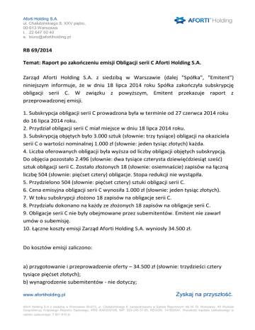 Aforti Holding S.A. ul. Chałubińskiego 8, XXV piętro, 00-613 Warszawa t. 22 647 50 40 e. [email protected] RB 69/2014 Temat: Raport po zakończeniu emisji Obligacji serii C Aforti Holding S.A. Zarząd Aforti Holding S.A. z siedzibą w Warszawie (dalej "Spółka", "Emitent") niniejszym informuje, że w dniu 18 lipca 2014 roku Spółka zakończyła subskrypcję obligacji serii C. W związku z powyższym, Emitent przekazuje raport z przeprowadzonej emisji. 1. Subskrypcja obligacji serii C prowadzona była w terminie od 27 czerwca 2014 roku do 16 lipca 2014 roku. 2. Przydział obligacji serii C miał miejsce w dniu 18 lipca 2014 roku. 3. Subskrypcją objętych było 3.000 sztuk (słownie: trzy tysiące) obligacji na okaziciela serii C o wartości nominalnej 1.000 zł (słownie: jeden tysiąc złotych) każda. 4. Liczba oferowanych obligacji była wyższa od liczby obligacji objętych subskrypcją. Do objęcia pozostało 2.496 (słownie: dwa tysiące czterysta dziewięćdziesiąt sześć) sztuk obligacji serii C. Zostało złożonych 18 (słownie: osiemnaście) zapisów na łączną liczbę 504 (słownie: pięćset cztery) obligacje. Stopa redukcji nie wystąpiła. 5. Przydzielono 504 (słownie: pięćset cztery) sztuki obligacji serii C. 6. Cena emisyjna obligacji serii C wynosiła 1.000 zł (słownie: jeden tysiąc złotych). 7. W toku subskrypcji złożono 18 zapisów na obligacje serii C. 8. Przydziału dokonano na każdy ze złożonych 18 zapisów na obligacje serii C. 9. Obligacje serii C nie były obejmowane przez subemitentów. Emitent nie zawarł umów o subemisję. 10. Łączne koszty emisji Zarząd Aforti Holding S.A. wyniosły 34.500 zł. Do kosztów emisji zaliczono: a) przygotowanie i przeprowadzenie oferty – 34.500 zł (słownie: trzydzieści cztery tysiące pięćset złotych); b) wynagrodzenie subemitentów - nie dotyczy; www.afortiholding.pl Zyskaj na przyszłość. Aforti Holding S.A z siedzibą w Warszawie 00-613, ul. Chałubińskiego 8, zarejestrowana w Sądzie Rejonowym dla M. St. Warszawy, XII Wydział Gospodarczy Krajowego Rejestru Sądowego, KRS 0000330108, NIP: 525-245-37-55, REGON: 141800547. Wysokość kapitału zakładowego w całości opłaconego: 7 801 915 zł. Aforti Holding S.A. ul. Chałubińskiego 8, XXV piętro, 00-613 Warszawa t. 22 647 50 40 e. [email protected] c) sporządzenie dokumentu informacyjnego oraz doradztwo przy sporządzaniu tego dokumentu – brak kosztów; d) promocja oferty – brak kosztów. Podstawa prawna: § 4 ust. 1 Załącznika Nr 3 do Regulaminu Alternatywnego Systemu Obrotu "Informacje Bieżące i Okresowe przekazywane w Alternatywnym Systemie Obrotu na rynku NewConnect". Klaudiusz Sytek Prezes Zarządu www.afortiholding.pl Zyskaj na przyszłość. Aforti Holding S.A z siedzibą w Warszawie 00-613, ul. Chałubińskiego 8, zarejestrowana w Sądzie Rejonowym dla M. St. Warszawy, XII Wydział Gospodarczy Krajowego Rejestru Sądowego, KRS 0000330108, NIP: 525-245-37-55, REGON: 141800547. Wysokość kapitału zakładowego w całości opłaconego: 7 801 915 zł.