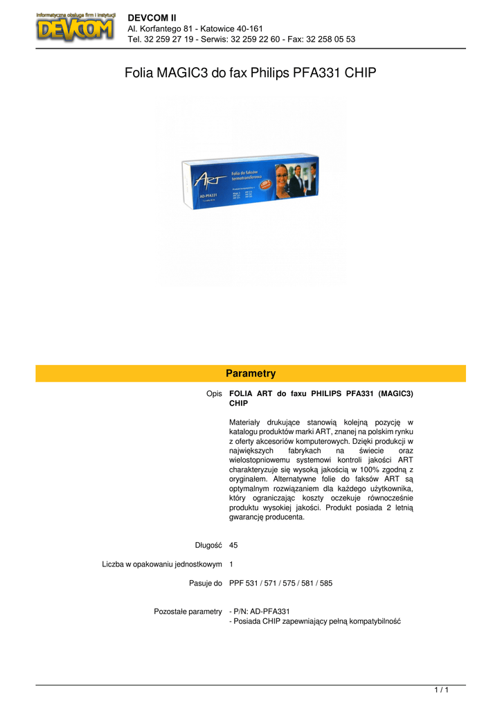 DEVCOM II Al. Korfantego 81 - Katowice 40-161 Tel. 32 259 27 19 - Serwis: 32 259 22 60 - Fax: 32 258 05 53 Folia MAGIC3 do fax Philips PFA331 CHIP Parametry Opis FOLIA ART do faxu PHILIPS PFA331 (MAGIC3) CHIP Materiały drukujące stanowią kolejną pozycję w katalogu produktów marki ART, znanej na polskim rynku z oferty akcesoriów komputerowych. Dzięki produkcji w największych fabrykach na świecie oraz wielostopniowemu systemowi kontroli jakości ART charakteryzuje się wysoką jakością w 100% zgodną z oryginałem. Alternatywne folie do faksów ART są optymalnym rozwiązaniem dla każdego użytkownika, który ograniczając koszty oczekuje równocześnie produktu wysokiej jakości. Produkt posiada 2 letnią gwarancję producenta. Długość 45 Liczba w opakowaniu jednostkowym 1 Pasuje do PPF 531 / 571 / 575 / 581 / 585 Pozostałe parametry - P/N: AD-PFA331 - Posiada CHIP zapewniający pełną kompatybilność 1/1 Powered by TCPDF (www.tcpdf.org)