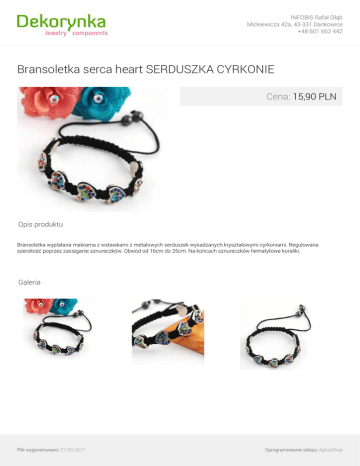 INFOBIS Rafał Głąb Mickiewicza 42a, 43-331 Dankowice +48 601 662 442 Bransoletka serca heart SERDUSZKA CYRKONIE Cena: 15,90 PLN Opis produktu Bransoletka wyplatana makrama z wstawkami z metalowych serduszek wysadzanych kryształowymi cyrkoniami. Regulowana szerokość poprzez zaciaganie sznureczków. Obwód od 16cm do 25cm. Na końcach sznureczków hematytowe koraliki. Galeria Plik wygenerowano: 07-03-2017 Powered by TCPDF (www.tcpdf.org) Oprogramowanie sklepu: AptusShop