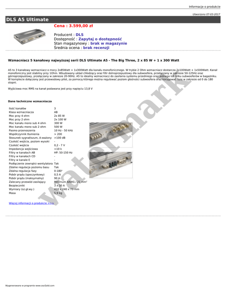 Informacje o produkcie Utworzono 07-03-2017 DLS A5 Ultimate Cena : 3.599,00 zł Producent : DLS Dostępność : Zapytaj o dostępność Stan magazynowy : brak w magazynie Średnia ocena : brak recenzji Wzmacniacz 5 kanałowy najwyższej serii DLS Ultimate A5 - The Big Three, 2 x 85 W + 1 x 300 Watt er m ar k A5 to 3 kanałowy wzmacniacz o mocy 2x85Watt + 1x300Watt dla kanału monofonicznego. W trybie 2 Ohm wzmacniacz dostarcza 2x100Watt + 1x500Watt. Kanał monofoniczny jest stabilny przy 1Ohm. Wbudowany układ chłodzący oraz filtr dolnoprzepustowy dla subwoofera, przełączany w zakresie 50-125Hz oraz górnoprzepustowy, przełączany w zakresie 20-90Hz. A5 to idealny wzmacniacz do zasilania systemu przedniego oraz jednego lub kilku subwooferów w bagażniku. W komplecie dołączony jest przewodowy pilot, za pomocą którego można regulować poziom głośności subwoofera oraz korygować fazę w zakresie od 0 do 180 stopni. Wyjściowa moc RMS na kanał podawana jest przy napięciu 13,8 V Dane techniczne wzmacniacza 3 AB 2x 85 W 2x 100 W 300 W 500 W 10 Hz - 50 kHz > 200 >100 dB 0,2 - 7 V >10 k HP: 50-150 Hz Tak Tak 0-180o 0,5 A 90 A Minimum 4AWG / 21 mm2 3 x 30 A 410 x 240 x 73 mm 5,9 kg w at Ilość kanałów Klasa wzmacniacza Moc przy 4 ohm Moc przy 2 ohm Moc kanału mono sub 4 ohm Moc kanału mono sub 2 ohm Pasmo przenoszenia Współczynnik tłumienia Stosunek sygnał/szum, A-ważony Czułość wejścia, poziom wysoki Czułość wejścia Impedancja wejściowa Filtry w kanałach AB Filtry w kanałach CD Filtry w kanale E Podłączenie zewnątrz wentylatora Zdalne regulacja poziomu basu Zdalna regulacja fazy Pobór prądu (spoczynkowy) Pobór prądu (maksymalny) Zalecany przewód zasilający Bezpieczniki Wymiary (sz.gł.wy.) Masa Więcej informacji o produkcie >>> Wygenerowano w programie www.oscGold.com