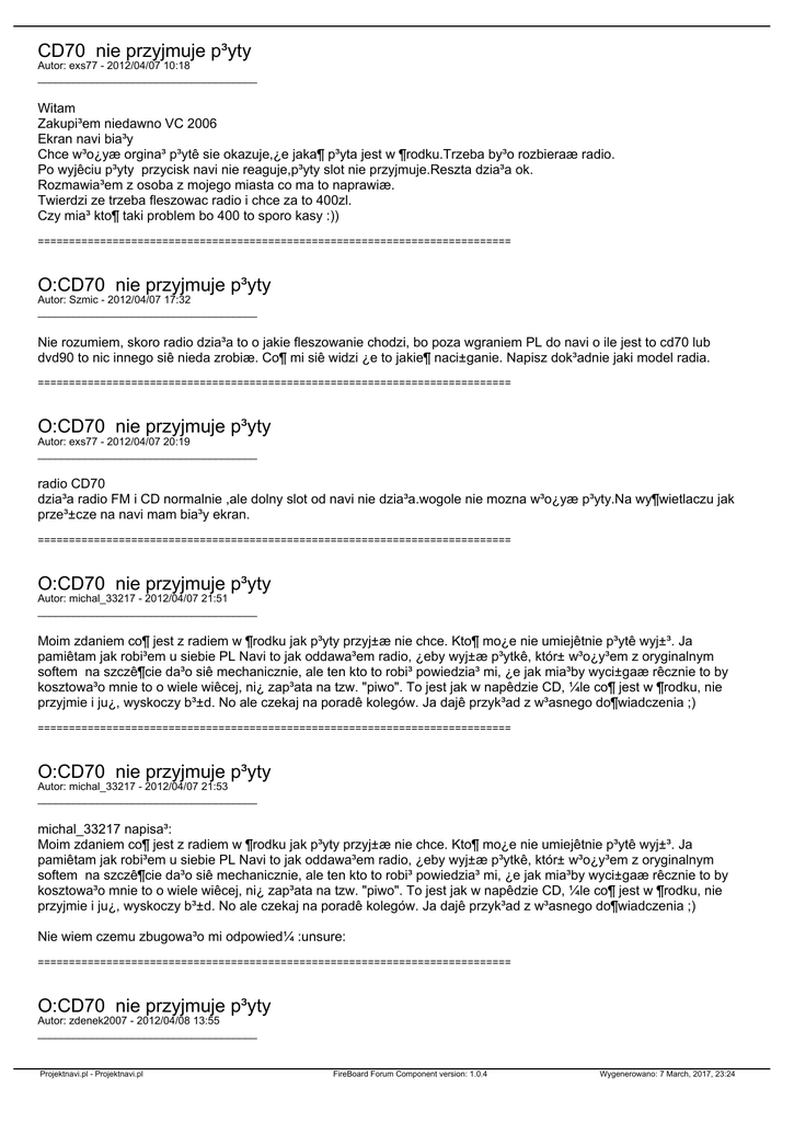 CD70 nie przyjmuje p³yty Autor: exs77 - 2012/04/07 10:18 _____________________________________ Witam Zakupi³em niedawno VC 2006 Ekran navi bia³y Chce w³o¿yæ orgina³ p³ytê sie okazuje,¿e jaka¶ p³yta jest w ¶rodku.Trzeba by³o rozbieraæ radio. Po wyjêciu p³yty przycisk navi nie reaguje,p³yty slot nie przyjmuje.Reszta dzia³a ok. Rozmawia³em z osoba z mojego miasta co ma to naprawiæ. Twierdzi ze trzeba fleszowac radio i chce za to 400zl. Czy mia³ kto¶ taki problem bo 400 to sporo kasy :)) ============================================================================ O:CD70 nie przyjmuje p³yty Autor: Szmic - 2012/04/07 17:32 _____________________________________ Nie rozumiem, skoro radio dzia³a to o jakie fleszowanie chodzi, bo poza wgraniem PL do navi o ile jest to cd70 lub dvd90 to nic innego siê nieda zrobiæ. Co¶ mi siê widzi ¿e to jakie¶ naci±ganie. Napisz dok³adnie jaki model radia. ============================================================================ O:CD70 nie przyjmuje p³yty Autor: exs77 - 2012/04/07 20:19 _____________________________________ radio CD70 dzia³a radio FM i CD normalnie ,ale dolny slot od navi nie dzia³a.wogole nie mozna w³o¿yæ p³yty.Na wy¶wietlaczu jak prze³±cze na navi mam bia³y ekran. ============================================================================ O:CD70 nie przyjmuje p³yty Autor: michal_33217 - 2012/04/07 21:51 _____________________________________ Moim zdaniem co¶ jest z radiem w ¶rodku jak p³yty przyj±æ nie chce. Kto¶ mo¿e nie umiejêtnie p³ytê wyj±³. Ja pamiêtam jak robi³em u siebie PL Navi to jak oddawa³em radio, ¿eby wyj±æ p³ytkê, któr± w³o¿y³em z oryginalnym softem na szczê¶cie da³o siê mechanicznie, ale ten kto to robi³ powiedzia³ mi, ¿e jak mia³by wyci±gaæ rêcznie to by kosztowa³o mnie to o wiele wiêcej, ni¿ zap³ata na tzw. "piwo". To jest jak w napêdzie CD, ¼le co¶ jest w ¶rodku, nie przyjmie i ju¿, wyskoczy b³±d. No ale czekaj na poradê kolegów. Ja dajê przyk³ad z w³asnego do¶wiadczenia ;) ============================================================================ O:CD70 nie przyjmuje p³yty Autor: michal_33217 - 2012/04/07 21:53 _____________________________________ michal_33217 napisa³: Moim zdaniem co¶ jest z radiem w ¶rodku jak p³yty przyj±æ nie chce. Kto¶ mo¿e nie umiejêtnie p³ytê wyj±³. Ja pamiêtam jak robi³em u siebie PL Navi to jak oddawa³em radio, ¿eby wyj±æ p³ytkê, któr± w³o¿y³em z oryginalnym softem na szczê¶cie da³o siê mechanicznie, ale ten kto to robi³ powiedzia³ mi, ¿e jak mia³by wyci±gaæ rêcznie to by kosztowa³o mnie to o wiele wiêcej, ni¿ zap³ata na tzw. "piwo". To jest jak w napêdzie CD, ¼le co¶ jest w ¶rodku, nie przyjmie i ju¿, wyskoczy b³±d. No ale czekaj na poradê kolegów. Ja dajê przyk³ad z w³asnego do¶wiadczenia ;) Nie wiem czemu zbugowa³o mi odpowied¼ :unsure: ============================================================================ O:CD70 nie przyjmuje p³yty Autor: zdenek2007 - 2012/04/08 13:55 _____________________________________ Projektnavi.pl - Projektnavi.pl FireBoard Forum Component version: 1.0.4 Wygenerowano: 7 March, 2017, 23:24 Hmmm! Wystarczy³o edytowaæ wcze¶niejsz±, a tak wysz³o za¶miecanie :blush: ============================================================================ O:CD70 nie przyjmuje p³yty Autor: exs77 - 2012/04/08 18:50 _____________________________________ od³aczy³em ako reset eeprom i doopa nie dzia³a slot navi.Nic oddam do naprawy bo sam to nic nie wymy¶le. ============================================================================ O:CD70 nie przyjmuje p³yty Autor: exs77 - 2012/05/12 11:11 _____________________________________ uszkodzenie by³o mechaniczne (pewnie kto¶ na si³ê wyci±ga³ p³ytê) jakie¶ zêbatki wymienili i dodatkowo wysypany soft po nieudanej próbie aktualizacji. Po kieszeni uderzy³o ale wszystko dzia³a Temat do zamkniêcia. ============================================================================ O:CD70 nie przyjmuje p³yty Autor: Wo³ek - 2012/05/13 11:50 _____________________________________ Ja powiem tak, p³ytê trzeba by³o wyci±gn±æ - ok, dalej: nagraæ na nowo menu pl i tak wypalon± cd w³o¿yæ do radia i z³o¿yæ radio ponownie. Rozpoczê³a by siê ponownie aktualizacja i po wykonaniu update'a wszystko zaczê³o by normalnie funkcjonowaæ. Mia³em sporo takich przypadków. Tak jak koledzy s³usznie zauwa¿yli prawdopodobnie zosta³e¶ naci±gniêty i to zdrowo:( zapadki siê blokuj± je¶li aktualizacja siê zatnie - potem to ju¿ mo¿na tylko pogorszyæ sytuacjê je¶li kto¶ to do¶æ nieumiejêtnie wcze¶niej zrobi³ aaa no i CIEKAWOSTKA - zapadki odblokowuj± siê samoczynnie je¶li soft zostanie wgrany poprawnie. Trzeba by³o poprosiæ o pokazanie tych "zepsutych" czê¶ci. ============================================================================ O:CD70 nie przyjmuje p³yty Autor: matador35 - 2012/05/17 19:49 _____________________________________ Powiedzcie mi jedn± rzecz , jezeli radio CD70 jest w aucie z 2008 roku i chce wrzucic p³ytkê z PL menu tym od wo³ka 2007 to wyrzyca j± , czy to normalne? Cel byl moj zeby sprawdzic wersjê softu , ale wyrzuca plyte, wiem ze w tych autach soft nie wchodzi. ============================================================================ O:CD70 nie przyjmuje p³yty Autor: slavio79 - 2012/05/17 20:09 _____________________________________ To jak wiesz ¿e w tych autach soft nie wchodzi to nie wchodzi i ju¿ wiesz ¿e w roczniku 2008 soft nie wchodzi... ============================================================================ O:CD70 nie przyjmuje p³yty Autor: matador35 - 2012/05/17 20:13 _____________________________________ Rozumiem ¿e nie wchodzi ale czy to normalne ¿e wyrzuca p³ytkê bo sie martwie ze cos nie tak z czytnikiem. ============================================================================ O:CD70 nie przyjmuj
