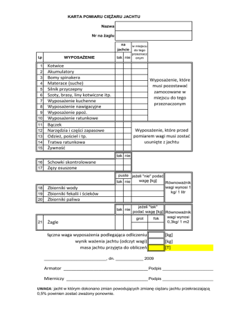 KARTA POMIARU CIĘŻARU JACHTU Nazwa Nr na żaglu na w miejscu jachcie do tego WYPOSAŻENIE Lp 1 2 3 4 5 6 7 8 9 10 11 12 13 14 15 tak nie Kotwice Akumulatory Bomy spinakera Materace (suche) Silnik przyczepny Szoty, brasy, liny kotwiczne itp. Wyposażenie kuchenne Wyposażenie nawigacyjne Wyposażenie ppoż. Wyposażenie ratunkowe Bączek Narzędzia i części zapasowe Odzież, pościel i tp. Tratwa ratunkowa Żywnośd przeznacz onym Wyposażenie, które musi pozostawad zamocowane w miejscu do tego przeznaczonym Wyposażenie, które przed pomiarem wagi musi zostad usunięte z jachtu tak nie 16 17 18 19 20 Schowki skontrolowane Zęzy osuszone Zbiorniki wody Zbiorniki fekalii i ścieków Zbiorniki paliwa puste jeżeli "nie" podać wagę [kg] tak nie Równoważnik wagi wynosi 1 kg/ 1 litr tak nie 21 Żagle jeżeli "tak" podać wagę [kg] Równoważnik wagi wynosi grot fok 0,3kg/ 1 m2 łączna waga wyposażenia podlegająca odliczeniu wynik ważenia jachtu (odczyt wagi) masa jachtu przyjęta do obliczeo [kg] [kg] [T] ___________________________, dn. ____________ 2009 Armator __________________________________________ Podpis ________________________ Mierniczy _________________________________________ Podpis ________________________ UWAGA: jacht w którym dokonano zmian powodujących zmianę ciężaru jachtu przekraczającą 0,5% powinien zostać zważony ponownie.