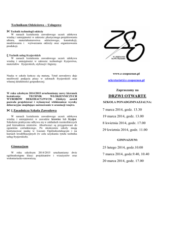 Technikum Odzieżowo – Usługowe Technik technologii odzieży W ramach kształcenia zawodowego uczeń zdobywa wiedzę i umiejętności w zakresie: plastycznego projektowania ubioru, materiałoznawstwa odzieżowego, konstrukcji, modelowania i wytwarzania odzieży oraz organizowania produkcji. Technik usług fryzjerskich W ramach kształcenia zawodowego uczeń zdobywa wiedzę i umiejętności w zakresie: technologii fryzjerstwa, materiałów fryzjerskich, stylizacji i higieny. Nauka w szkole kończy się maturą. Tytuł zawodowy daje możliwość podjęcia pracy w salonach fryzjerskich oraz własnej działalności gospodarczej. www.e-zsopoznan.pl [email protected] Zapraszamy na W roku szkolnym 2014/2015 uruchamiamy nowy kierunek kształcenia: TECHNIK WŁÓKIENNICZYCH WYROBÓW DEKORACYJNYCH. Zdobyty zawód pozwala projektować i wykonywać włókiennicze wyroby dekoracyjne znajdujące zastosowanie w aranżacji wnętrz. DRZWI OTWARTE SZKOŁA PONADGIMNAZJALNA: Zasadnicza Szkoła Zawodowa 7 marca 2014, godz. 13.30 W ramach kształcenia zawodowego uczeń zdobywa wiedzę i umiejętności w zawodzie krawiec lub fryzjer. Szkolenie praktyczne odbywa się w zakładach rzemieślniczych pod kierunkiem mistrzów. Absolwenci są przygotowani do egzaminu czeladniczego. Po ukończeniu szkoły mogą kontynuować naukę w Liceum Ogólnokształcącym i na kursach kwalifikacyjnych (w celu uzyskania tytułu technika usług fryzjerskich). 19 marca 2014, godz. 13.00 8 kwietnia 2014, godz. 17.00 29 kwietnia 2014, godz. 11.00 GIMNAZJUM: Gimnazjum W roku szkolnym 2014/2015 uruchamiamy dwie ogólnodostępne klasy: projektantów i wizażystów oraz wolontariacko-ratowniczą. 25 lutego 2014, godz.10.00 7 marca 2014, godz.9.40, 10.40 20 marca 2014, godz. 17.00 Rok szkolny 2014/2015 Lp. 1 2 3 Nazwa szkoły Technikum Odzieżowo Usługowe Zasadnicza Szkoła Zawodowa Nr 23 Gimnazjum nr 1 Symbol oddziału Przedmioty wiodące / nazwa zawodu Język obcy Przedmiot wskazany przez szkolną komisję rekrutacyjną IaT technik usług fryzjerskich j. angielski j. niemiecki matematyka, j. angielski, chemia IbT technik technologii odzieży j. angielski j. niemiecki matematyka, j. angielski, informatyka IcT technik włókienniczych wyrobów dekoracyjnych j. angielski j. niemiecki matematyka, j. angielski, informatyka I1 fryzjer j. niemiecki * I 2, I 3 fryzjer j. angielski * Cykl kształcenia 4 lata 3 lata I4 krawiec j. angielski ----------- I5 rękodzielnik wyrobów włókienniczych j. angielski ----------- Ia projektant, wizażysta j. angielski j. niemiecki ----------- Ib wolontariacko-ratownicza j. angielski j. niemiecki ----------- 3 lata * - do ZSZ zostają przyjęci wszyscy uczniowie, którzy mają zapewnioną praktyczną naukę zawodu