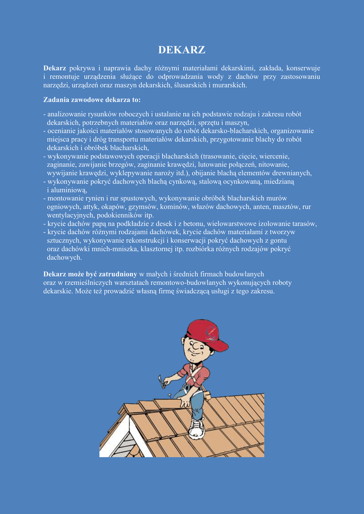 DEKARZ Dekarz pokrywa i naprawia dachy różnymi materiałami dekarskimi, zakłada, konserwuje i remontuje urządzenia służące do odprowadzania wody z dachów przy zastosowaniu narzędzi, urządzeń oraz maszyn dekarskich, ślusarskich i murarskich. Zadania zawodowe dekarza to: - analizowanie rysunków roboczych i ustalanie na ich podstawie rodzaju i zakresu robót dekarskich, potrzebnych materiałów oraz narzędzi, sprzętu i maszyn, - ocenianie jakości materiałów stosowanych do robót dekarsko-blacharskich, organizowanie miejsca pracy i dróg transportu materiałów dekarskich, przygotowanie blachy do robót dekarskich i obróbek blacharskich, - wykonywanie podstawowych operacji blacharskich (trasowanie, cięcie, wiercenie, zaginanie, zawijanie brzegów, zaginanie krawędzi, lutowanie połączeń, nitowanie, wywijanie krawędzi, wyklepywanie naroży itd.), obijanie blachą elementów drewnianych, - wykonywanie pokryć dachowych blachą cynkową, stalową ocynkowaną, miedzianą i aluminiową, - montowanie rynien i rur spustowych, wykonywanie obróbek blacharskich murów ogniowych, attyk, okapów, gzymsów, kominów, włazów dachowych, anten, masztów, rur wentylacyjnych, podokienników itp. - krycie dachów papą na podkładzie z desek i z betonu, wielowarstwowe izolowanie tarasów, - krycie dachów różnymi rodzajami dachówek, krycie dachów materiałami z tworzyw sztucznych, wykonywanie rekonstrukcji i konserwacji pokryć dachowych z gontu oraz dachówki mnich-mniszka, klasztornej itp. rozbiórka różnych rodzajów pokryć dachowych. Dekarz może być zatrudniony w małych i średnich firmach budowlanych oraz w rzemieślniczych warsztatach remontowo-budowlanych wykonujących roboty dekarskie. Może też prowadzić własną firmę świadczącą usługi z tego zakresu.