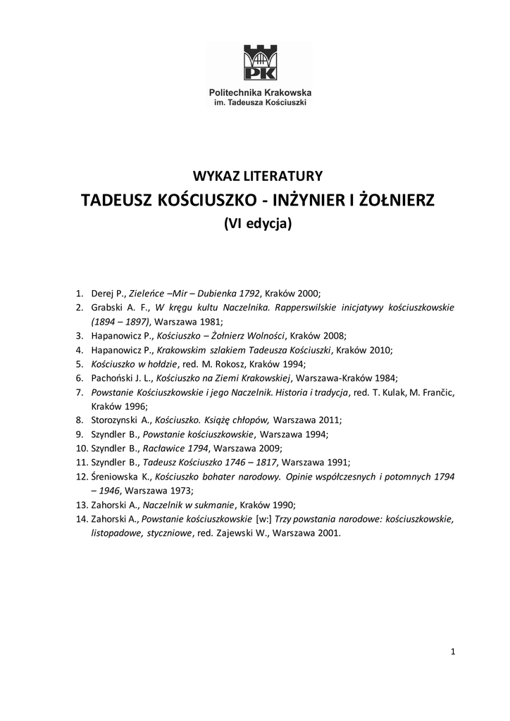 WYKAZ LITERATURY TADEUSZ KOŚCIUSZKO - INŻYNIER I ŻOŁNIERZ (VI edycja) 1. Derej P., Zieleńce –Mir – Dubienka 1792, Kraków 2000; 2. Grabski A. F., W kręgu kultu Naczelnika. Rapperswilskie inicjatywy kościuszkowskie (1894 – 1897), Warszawa 1981; 3. Hapanowicz P., Kościuszko – Żołnierz Wolności, Kraków 2008; 4. Hapanowicz P., Krakowskim szlakiem Tadeusza Kościuszki, Kraków 2010; 5. Kościuszko w hołdzie, red. M. Rokosz, Kraków 1994; 6. Pachoński J. L., Kościuszko na Ziemi Krakowskiej, Warszawa-Kraków 1984; 7. Powstanie Kościuszkowskie i jego Naczelnik. Historia i tradycja, red. T. Kulak, M. Frančic, Kraków 1996; 8. Storozynski A., Kościuszko. Książę chłopów, Warszawa 2011; 9. Szyndler B., Powstanie kościuszkowskie, Warszawa 1994; 10. Szyndler B., Racławice 1794, Warszawa 2009; 11. Szyndler B., Tadeusz Kościuszko 1746 – 1817, Warszawa 1991; 12. Śreniowska K., Kościuszko bohater narodowy. Opinie współczesnych i potomnych 1794 – 1946, Warszawa 1973; 13. Zahorski A., Naczelnik w sukmanie, Kraków 1990; 14. Zahorski A., Powstanie kościuszkowskie [w:] Trzy powstania narodowe: kościuszkowskie, listopadowe, styczniowe, red. Zajewski W., Warszawa 2001. 1