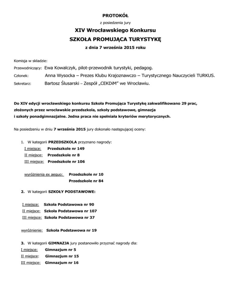 PROTOKÓŁ z posiedzenia jury XIV Wrocławskiego Konkursu SZKOŁA PROMUJĄCA TURYSTYKĘ z dnia 7 września 2015 roku Komisja w składzie: Przewodniczący: Ewa Kowalczyk, pilot-przewodnik turystyki, pedagog. Członek: Anna Wysocka – Prezes Klubu Krajoznawczo – Turystycznego Nauczycieli TURKUS. Sekretarz: Bartosz Ślusarski – Zespół „CEKDiM” we Wrocławiu. Do XIV edycji wrocławskiego konkursu Szkoła Promująca Turystykę zakwalifikowano 29 prac, złożonych przez wrocławskie przedszkola, szkoły podstawowe, gimnazja i szkoły ponadgimnazjalne. Jedna praca nie spełniała kryteriów merytorycznych. Na posiedzeniu w dniu 7 września 2015 jury dokonało następującej oceny: 1. W kategorii PRZEDSZKOLA przyznano nagrody: I miejsce: Przedszkole nr 149 II miejsce: Przedszkole nr 8 III miejsce: Przedszkole nr 106 wyróżnienia ex aequo: Przedszkole nr 10 Przedszkole nr 84 2. W kategorii SZKOŁY PODSTAWOWE: I miejsce: Szkoła Podstawowa nr 90 II miejsce: Szkoła Podstawowa nr 107 III miejsce: Szkoła Podstawowa nr 37 wyróżnienie: Szkoła Podstawowa nr 19 3. W kategorii GIMNAZJA jury postanowiło przyznać nagrody dla: I miejsce: Gimnazjum nr 5 II miejsce: Gimnazjum nr 15 III miejsce: Gimnazjum nr 16 4. W kategorii SZKOŁY PONADGIMNAZJALNE przyznano nagrody w konkursie na najlepszy folder turystyczny o Wrocławiu (w ramach Wrocławskiego Konkursu „Szkoła Promująca Turystykę”) dla następujących zespołów redakcyjnych: NAGRODA: Karolina Ziemińska, Tomasz Kapuścik, Jakub Sokołowski, Jacqueline Kempka, Justyna Pajda; opiekun Marta Helt z Liceum Ogólnokształcącego nr III we Wrocławiu WYRÓŻNIENIA ex equo: Krzysztof Przybyłek, Tomasz Migdał, Marcin Przylakowski opiekun Agnieszka Idczak z Zespołu Szkół Teleinformatycznych i Elektronicznych we Wrocławiu Mateusz Iwańczak, Marcin Szelachowski opiekun Agnieszka Duda z X Liceum Ogólnokształcącego we Wrocławiu W wyniku decyzji komisji w składzie: Jacek T. Marek – Przewodniczący Komitetu Organizacyjnego Konkursu Maciej Stawiński – artysta fotografik, członek ZPAF Natalia Kołodziej – grafik Puchar Prezydenta Wrocławia – Rafała Dutkiewicza otrzymały - w kategorii SZKOŁY PODSTAWOWE Szkoła Podstawowa nr 19 we Wrocławiu w składzie – Martyna Pluta, Natalia Bąkowska, Beata Jaworska, pod opieką Pani Aleksandry Dominik - w kategorii GIMNAZJA Gimnazjum nr 16 we Wrocławiu w składzie – Adrian Prokopczyk, Stanisław Felczyński, Paweł Walkowiak, pod opieką Pani Aliny Nowak i Pani Izabelli Hauke - w kategorii SZKOŁY PONADGIMNAZJALNE Liceum Ogólnokształcącego nr III we Wrocławiu w składzie – Karolina Ziemińska, Tomasz Kapuścik, Jakub Sokołowski, Jacqueline Kempka, Justyna Pajda, pod opieką Pani Marty Helt 5. Ekipy nagrodzone w konkursie ze szkół podstawowych i gimnazjalnych rozegrają w dniu 16.09.2015 roku, finał zespołowy o Puchar Prezydenta Wrocławia – Rafała Dutkiewicza, podczas Warsztatów Turystycznych w Zespole „ Centrum Edukacji Kulturalnej Dzieci i Młodzieży” we Wrocławiu przy ul. Kołłątaja 20. Zbiórka o godzinie 9.00 w sali 56 CEKDiM. 6. Uroczyste zakończenie XIV edycji konkursu odbędzie się 28.09.2015 roku, o godzinie 12.00 w Sali Teatralnej Zespołu „ Centrum Edukacji Kulturalnej Dzieci i Młodzieży” we Wrocławiu przy ul. Kołłątaja 20. 7. Wykaz szkół i przedszkoli, które zakwalifikowały się do XIV edycji konkursu – w załączniku. JURY:
