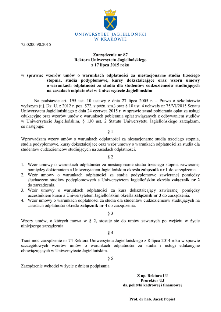 Zarządzenie nr 87 Rektora UJ z 17 lipca 2015 roku