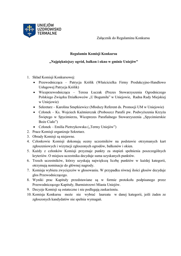 Załącznik do Regulaminu Konkursu Regulamin Komisji Konkursu „Najpiękniejszy ogród, balkon i okno w gminie Uniejów” 1. Skład Komisji Konkursowej: Przewodnicząca – Patrycja Królik (Właścicielka Firmy Produkcyjno-Handlowo Usługowej Patrycja Królik) Wiceprzewodnicząca – Teresa Łuczak (Prezes Stowarzyszenia Ogrodniczego Polskiego Związku Działkowców „U Bogumiła” w Uniejowie, Radna Rady Miejskiej w Uniejowie) Sekretarz – Karolina Smętkiewicz (Młodszy Referent ds. Promocji UM w Uniejowie) Członek – Ks. Wojciech Kaźmierczak (Proboszcz Parafii pw. Podwyższenia Krzyża Świętego w Spycimierzu, Wiceprezes Parafialnego Stowarzyszenia „Spycimierskie Boże Ciało”) Członek – Emilia Pietrzykowska („Termy Uniejów”) 2. Prace Komisji organizuje Sekretarz. 3. Obrady Komisji są niejawne. 4. Członkowie Komisji dokonują oceny uczestników na podstawie otrzymanych kart zgłoszeniowych i wizytacji zgłoszonych ogrodów, balkonów i okien. 5. Każdy z członków Komisji przyznaje punkty za stopień spełnienia poszczególnych kryteriów. O miejscu uczestnika decyduje suma uzyskanych punktów. 6. Trzech uczestników, którzy uzyskają największą liczbę punktów w każdej kategorii, otrzymują nominacje do głównej nagrody. 7. Komisja wybiera zwycięzców w głosowaniu. W przypadku równej ilości głosów decyduje głos Przewodniczącego. 8. Wyniki prac Kapituły przedstawiane są w formie protokołu podpisanego przez Przewodniczącego Kapituły, Burmistrzowi Miasta Uniejów. 9. Decyzje Komisji są ostateczne i nie podlegają zaskarżeniu. 10. Komisja Konkursu może nie wybrać laureata w danej kategorii, jeśli żaden ze zgłoszonych kandydatów nie spełnia wymagań.