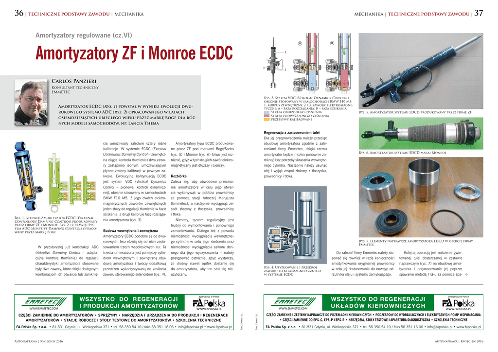 36 | TECHNICZNE PODSTAWY ZAWODU | MECHANIKA MECHANIKA | TECHNICZNE PODSTAWY ZAWODU | 37 Amortyzatory regulowane (cz.VI) B A Amortyzatory ZF i Monroe ECDC 1 3 2 Carlos Panzieri Konsultant techniczny EMMETEC Rys. 3. System VDC (Vertical Dynamics Control) obecnie stosowany w samochodach BMW F10 M5: 1. korpus zewnętrzny, 2 i 3. zawory elektromagnetyczne; A – faza rozciągania, B – faza ściskania; strefa obniżonego ciśnienia strefa podwyższonego ciśnienia przepływy kalibrowane Amortyzator ECDC (rys. 1) powstał w wyniku ewolucji dwururowego systemu ADC (rys. 2) opracowanego w latach osiemdziesiątych ubiegłego wieku przez markę Boge dla różnych modeli samochodów, np. Lancia Thema WSZYSTKO DO REGENERACJI .WWW.FAPOLSKA.PL . I PRODUKCJI AMORTYZATORÓW WWW.EMMETEC.COM dystrybucja w Polsce WWW.EMMETEC.COM Rozbiórka Zaleca się, aby obwodowe przecinanie amortyzatora w celu jego otwarcia wykonywać w pobliżu prowadnicy za pomocą stacji roboczej Mangusta (Emmetec), a następnie wyciągnąć zespół złożony z tłoczyska, prowadnicy i tłoka. Niestety, system regulacyjny jest trudny do wymontowania i ponownego zamontowania. Dlatego też z powodu niemożności wyciągnięcia wewnętrznego cylindra w celu jego skrócenia oraz niemożności wyciągnięcia zaworu dennego dla jego wyczyszczenia – należy postępować ostrożnie, gdyż wystarczy, że drobny nawet opiłek dostanie się do amortyzatora, aby ten stał się nie użyteczny. FAP lska Rys. 4. Usytuowanie i przekrój zaworu elektromagnetycznego w systemie ECDC F.AP . lska WWW.EMMETEC.COM WWW.FAPOLSKA.PL CZĘŚCI ZAMIENNE STOŁY TESTOWE CZĘŚCI STOŁY TESTOWE FA Polska Sp. z o.o. • 81-531 Gdynia, ul. Wielkopolska 371 • tel. 58 350 54 10 / faks 58 351ZAMIENNE 16 06 • [email protected] • www.fapolska.pl Do zaleceń firmy Emmetec należy stosować się również w razie konieczności zmodyfikowania oryginalnej prowadnicy w celu jej dostosowania do nowego odrzutnika oleju i systemu zamykającego. Kolejną operacją jest nałożenie gwintowanej tulei dostarczanej w zestawie naprawczym (rys. 7) na obudowę amortyzatora i przymocowanie jej poprzez spawanie metodą TIG-u za pomocą spa- WSZYSTKO DO REGENERACJI .WWW.FAPOLSKA.PL U. K Ł A D Ó W K I E R O W NWWW.EMMETEC.COM ICZYCH dystrybucja w Polsce dystrybucja w Polsce CZĘŚCI ZAMIENNE DO AMORTYZATORÓW • SPRĘŻYNY • NARZĘDZIA I URZĄDZENIA DO PRODUKCJI I REGENERACJI PRZEKŁADNIE KIEROWNICZE, PRZEKŁADNIE KIEROWNICZE, AMORTYZATORÓW • STACJE ROBOCZE I STOŁY TESTOWE DO AMORTYZATORÓW • SZKOLENIA TECHNICZNE POMPY WSPOMAGANIA, EPS POMPY WSPOMAGANIA, EPS Rys. 6. Amortyzator systemu EDCD marki Monroe Rys. 7. Elementy naprawcze amortyzatora EDCD w ofercie firmy Emmetec Fot. Emmetec W przestarzałej już konstrukcji ADC (Adaptive Damping Control – adaptacyjna kontrola tłumienia) do regulacji charakterystyki amortyzatora stosowane były dwa zawory, które dzięki dostępnym kombinacjom ich otwarcia lub zamknię- Budowa wewnętrzna i zewnętrzna Amortyzatory ECDC podobne są do dwururowych, lecz różnią się od nich zastosowaniem trzech współosiowych rur. Ta trzecia umieszczona jest pomiędzy cylindrem wewnętrznym i zewnętrzną obudową amortyzatora i tworzy dodatkową przestrzeń wykorzystywaną do zasilania zaworu sterowanego solenoidem (rys. 4). Amortyzatory typu ECDC produkowane przez ZF pod markami Boge/Sachs (rys. 5) i Monroe (rys. 6) łatwo jest rozróżnić, gdyż w tych drugich zawór elektro magnetyczny jest dłuższy i cieńszy. Fot. Emmetec Rys. 1. (z lewej) Amortyzator ECDC (External Continuous Damping Control) produkowany przez firmy ZF i Monroe; Rys. 2. (z prawej) System ADC (Adaptive Damping Control) opracowany przez markę Boge cia umożliwiały zaledwie cztery różne kalibracje. W systemie ECDC (External Continuous Damping Control – zewnętrzna ciągła kontrola tłumienia) dwa zawory zastąpiono jednym, umożliwiającym płynne zmiany kalibracji w pewnym zakresie. Ewolucyjną kontynuacją ECDC jest system VDC (Vertical Dynamics Control – pionowej kontroli dynamicznej), obecnie stosowany w samochodach BMW F10 M5. Z jego dwóch elektromagnetycznych zaworów zewnętrznych jeden służy do regulacji tłumienia w fazie ściskania, a drugi kalibruje fazę rozciągania amortyzatora (rys. 3). Regeneracja z zastosowaniem tulei Dla jej przeprowadzenia należy przeciąć obudowę amortyzatora zgodnie z zaleceniami firmy Emmetec, dzięki czemu amortyzator będzie można ponownie zamknąć bez potrzeby skracania wewnętrznego cylindra. Następnie należy usunąć olej i wyjąć zespół złożony z tłoczyska, prowadnicy i tłoka. Rys. 5. Amortyzator systemu EDCD produkowany przez firmę ZF FAP lska dystrybucja w Polsce F.AP . lska WWW.FAPOLSKA.PL CZĘŚCI ZAMIENNE I ZESTAWY NAPRAWCZE DO PRZEKŁADNI KIEROWNICZYCH • PODZESPOŁY DO HYDRAULICZNYCH I ELEKTRYCZNYCH POMP WSPOMAGANIA PRZEKŁADNIE KIEROWNICZE, PRZEKŁADNIE KIEROWNICZE, • CZĘŚCI ZAMIENNE DO EPS-C, EPS-P I EPS-R • NARZĘDZIA, STOŁY TESTOWE I APARATURA DIAGNOSTYCZNA • SZKOLENIA TECHNICZNE POMPY WSPOMAGANIA, EPS POMPY WSPOMAGANIA, EPS CZĘŚCI ZAMIENNE STOŁY TESTOWE CZĘŚCI STOŁY TESTOWE FA Polska Sp. z o.o. • 81-531 Gdynia, ul. Wielkopolska 371 • tel. 58 350 54 10 / faks 58 351ZAMIENNE 16 06 • [email protected] • www.fapolska.pl Części zamienne i zestawy naprawcze do układów kierowniczych Części zamienne i zestawy naprawcze do układów kierowniczych Części zamienne i zestawy naprawcze do układów kierowniczych Części zamienne i zestawy naprawcze do układów kierowniczych Podzespoły do hydraulicznych i elektrycznych pomp wspomagania Podzespoły do hydraulicznych i elektrycznych pomp wspomagania Podzespoły do hydraulicznych i elektrycznych pomp wspomagania Podzespoły do hydraulicznych i elektrycznych pomp wspomagania Części zamienne do EPS-C, EPS-P i EPS-R Części zamienne do EPS-C, EPS-P i EPS-R Części zamienne do EPS-C, EPS-P i EPS-R Części zamienne do