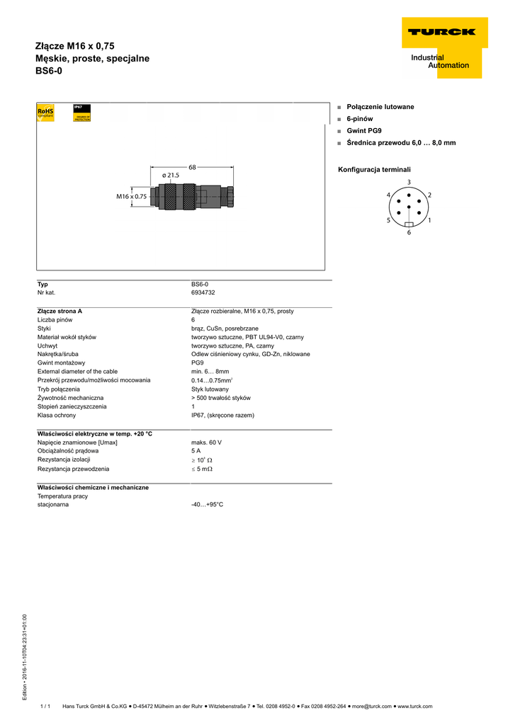 Złącze M16 x 0,75 Męskie, proste, specjalne BS6-0 ■ Połączenie lutowane ■ 6-pinów ■ Gwint PG9 ■ Średnica przewodu 6,0 … 8,0 mm Konfiguracja terminali Typ Nr kat. BS6-0 6934732 Złącze strona A Liczba pinów Styki Materiał wokół styków Uchwyt Nakrętka/śruba Gwint montażowy External diameter of the cable Przekrój przewodu/możliwości mocowania Złącze rozbieralne, M16 x 0,75, prosty 6 brąz, CuSn, posrebrzane tworzywo sztuczne, PBT UL94-V0, czarny tworzywo sztuczne, PA, czarny Odlew ciśnieniowy cynku, GD-Zn, niklowane PG9 min. 6… 8mm Tryb połączenia Żywotność mechaniczna Stopień zanieczyszczenia Klasa ochrony Właściwości elektryczne w temp. +20 °C Napięcie znamionowe [Umax] Obciążalność prądowa Rezystancja izolacji 0.14…0.75mm Styk lutowany > 500 trwałość styków 1 IP67, (skręcone razem) 2 maks. 60 V 5A Rezystancja przewodzenia ï 10 ò ð 5 mò Właściwości chemiczne i mechaniczne Temperatura pracy stacjonarna -40…+95°C Edition • 2016-11-10T04:23:31+01:00 8 1/1 Hans Turck GmbH & Co.KG ñ D-45472 Mülheim an der Ruhr ñ Witzlebenstraße 7 ñ Tel. 0208 4952-0 ñ Fax 0208 4952-264 ñ [email protected] ñ www.turck.com
