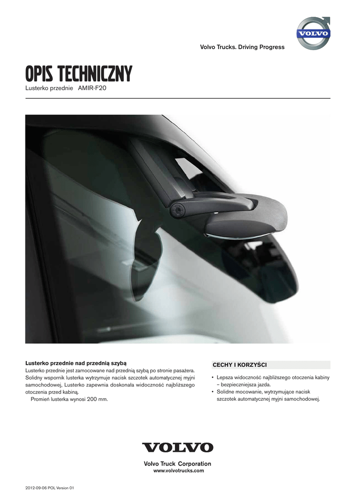 Volvo Trucks. Driving Progress OPIS TECHNICZNY Lusterko przednie AMIR-F20 Lusterko przednie nad przednią szybą Lusterko przednie jest zamocowane nad przednią szybą po stronie pasażera. Solidny wspornik lusterka wytrzymuje nacisk szczotek automatycznej myjni samochodowej, Lusterko zapewnia doskonała widoczność najbliższego otoczenia przed kabiną. Promień lusterka wynosi 200 mm. 2012-09-06 POL Version 01 Cechy i korzyści • Lepsza widoczność najbliższego otoczenia kabiny – bezpieczniejsza jazda. • Solidne mocowanie, wytrzymujące nacisk szczotek automatycznej myjni samochodowej.