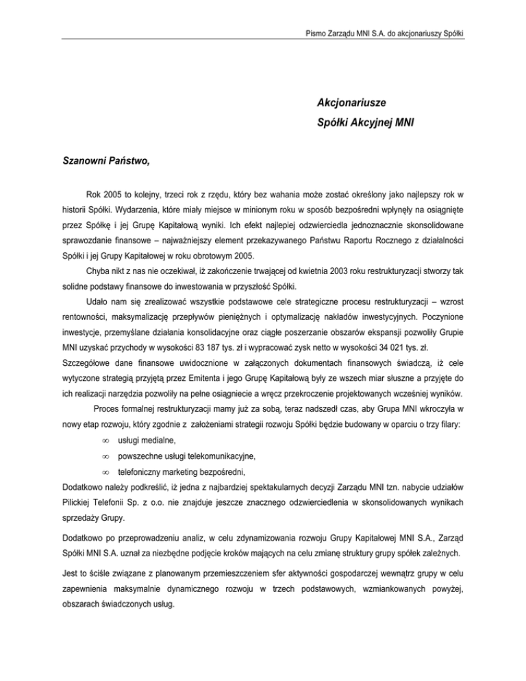 Pismo Zarządu MNI S.A. do akcjonariuszy Spółki Akcjonariusze Spółki Akcyjnej MNI Szanowni Państwo, Rok 2005 to kolejny, trzeci rok z rzędu, który bez wahania moŜe zostać określony jako najlepszy rok w historii Spółki. Wydarzenia, które miały miejsce w minionym roku w sposób bezpośredni wpłynęły na osiągnięte przez Spółkę i jej Grupę Kapitałową wyniki. Ich efekt najlepiej odzwierciedla jednoznacznie skonsolidowane sprawozdanie finansowe – najwaŜniejszy element przekazywanego Państwu Raportu Rocznego z działalności Spółki i jej Grupy Kapitałowej w roku obrotowym 2005. Chyba nikt z nas nie oczekiwał, iŜ zakończenie trwającej od kwietnia 2003 roku restrukturyzacji stworzy tak solidne podstawy finansowe do inwestowania w przyszłość Spółki. Udało nam się zrealizować wszystkie podstawowe cele strategiczne procesu restrukturyzacji – wzrost rentowności, maksymalizację przepływów pienięŜnych i optymalizację nakładów inwestycyjnych. Poczynione inwestycje, przemyślane działania konsolidacyjne oraz ciągłe poszerzanie obszarów ekspansji pozwoliły Grupie MNI uzyskać przychody w wysokości 83 187 tys. zł i wypracować zysk netto w wysokości 34 021 tys. zł. Szczegółowe dane finansowe uwidocznione w załączonych dokumentach finansowych świadczą, iŜ cele wytyczone strategią przyjętą przez Emitenta i jego Grupę Kapitałową były ze wszech miar słuszne a przyjęte do ich realizacji narzędzia pozwoliły na pełne osiągniecie a wręcz przekroczenie projektowanych wcześniej wyników. Proces formalnej restrukturyzacji mamy juŜ za sobą, teraz nadszedł czas, aby Grupa MNI wkroczyła w nowy etap rozwoju, który zgodnie z załoŜeniami strategii rozwoju Spółki będzie budowany w oparciu o trzy filary: • usługi medialne, • powszechne usługi telekomunikacyjne, • telefoniczny marketing bezpośredni, Dodatkowo naleŜy podkreślić, iŜ jedna z najbardziej spektakularnych decyzji Zarządu MNI tzn. nabycie udziałów Pilickiej Telefonii Sp. z o.o. nie znajduje jeszcze znacznego odzwierciedlenia w skonsolidowanych wynikach sprzedaŜy Grupy. Dodatkowo po przeprowadzeniu analiz, w celu zdynamizowania rozwoju Grupy Kapitałowej MNI S.A., Zarząd Spółki MNI S.A. uznał za niezbędne podjęcie kroków mających na celu zmianę struktury grupy spółek zaleŜnych. Jest to ściśle związane z planowanym przemieszczeniem sfer aktywności gospodarczej wewnątrz grupy w celu zapewnienia maksymalnie dynamicznego rozwoju w trzech podstawowych, wzmiankowanych powyŜej, obszarach świadczonych usług. Pismo Zarządu MNI S.A. do akcjonariuszy Spółki Zgodnie z przyjętą strategią rozwoju Zarząd MNI S.A. postanowił, iŜ : • w Spółce dominującej MNI S.A. skupiona będzie działalność medialna telekomunikacyjna w ramach telefonii mobilnej oraz działalność telemarketingowa, • Spółka Telefonia Pilicka Sp. z o.o. będzie odpowiedzialna za standardowe usługi telekomunikacyjne świadczone dla abonentów we wszystkich obszarach numeracyjnych, • Legion Polska Sp. z o.o. pozostaje natomiast odpowiedzialna za usługi medialne realizowane poprzez stacjonarną sieć telekomunikacyjną. Uzyskane w roku 2005 wyniki to efekt kilkuletniej pracy i zaangaŜowania osób zatrudnionych w Spółkach Grupy, konsekwencji we wdraŜaniu projektów na dynamicznie rozwijającym się rynku multimedialnych usług telekomunikacyjnych oraz sprawnej integracją z usługami nabytej w sierpniu Spółki Legion Polska. Reasumując, oceniamy, Ŝe zarówno działania bieŜące, ich pozytywny przebieg i odbiór na rynku jak teŜ kontynuacja zapoczątkowanej konsolidacji z innymi podmiotami, zgodnie z przyjętym w czerwcu 2004 roku programem rozwoju przełoŜą się na dalszą poprawę wyników finansowych Spółki i jej Grupy Kapitałowej na koniec 2006 roku oraz dynamiczny wzrost sprzedaŜy i generowanie zysków w latach następnych. Z wyrazami szacunku, .................................................................... Mariusz Piotr Pilewski Prezes Zarządu ................................................................... Leszek Kułak Wiceprezes Zarządu .................................................................... Zdzisław Wójcik Członek Zarządu Warszawa, 31 maja 2005 Grupa Kapitałowa MNI S.A. Oświadczenia Członków Zarządu GRUPA KAPITAŁOWA MNI S.A. OŚWIADCZENIA CZŁONKÓW ZARZĄDU 1. Oświadczenie ws. rocznego skonsolidowanego sprawozdania finansowego Grupy Kapitałowej MNI S.A („Grupa MNI”) i sprawozdania z działalności Grupy MNI . Zarząd MNI S.A oświadcza, Ŝe zgodnie z jego najlepszą wiedzą, roczne skonsolidowane sprawozdanie finansowe Grupy Kapitałowej MNI S.A. i dane porównywalne zostały sporządzone zgodnie z obowiązującymi zasadami rachunkowości oraz Ŝe odzwierciedlają w sposób prawdziwy, rzetelny i jasny sytuację majątkową i finansową grupy kapitałowej Emitenta oraz jej wynik finansowy. Sprawozdanie z działalności Grupy MNI zawiera prawdziwy obraz rozwoju i osiągnięć oraz sytuacji grupy kapitałowej Emitenta w roku obrotowym 2005, w tym opis podstawowych zagroŜeń i ryzyka. 2. Oświadczenie ws. podmiotu uprawnionego do badania sprawozdań finansowych. Zarząd MNI S.A. oświadcza, Ŝe MGI Akcept Audyt Sp. z o.o., podmiot uprawniony do badania sprawozdań finansowych, dokonujący badania rocznego skonsolidowanego sprawozdania finansowego Grupy Kapitałowej MNI S.A., został wybrany zgodnie z przepisami prawa oraz Ŝe podmiot ten oraz biegli rewidenci, dokonujący badania tego sprawozdania, spełniali warunki do wyraŜenia bezstronnej i niezaleŜnej opinii o badaniu, zgodnie z właściwymi przepisami prawa krajowego. .................................................................... Mariusz Piotr Pilewski Prezes Zarządu ................................................................... Leszek Kułak Wiceprezes Zarządu .................................................................... Zdzisł