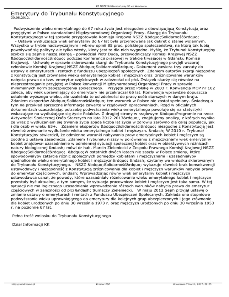 KZ NSZZ Solidarność przy IC we Wrocławiu Emerytury do Trybunału Konstytucyjnego 30.08.2012. Podwyższenie wieku emerytalnego do 67 roku życia jest niezgodne z obowiązującą Konstytucją oraz przyjętymi w Polsce standardami Międzynarodowej Organizacji Pracy. Skargę do Trybunału Konstytucyjnego w tej sprawie przygotowała Komisja Krajowa NSZZ „Solidarność” - Ustawa wydłużająca wiek emerytalny do 67 lat była przyjmowana jak dekret o stanie wojennym. Wszystko w trybie nadzwyczajnym i wbrew opinii 85 proc. polskiego społeczeństwa, na którą tak lubią powoływać się politycy ale tylko wtedy, kiedy jest to dla nich wygodne. Myślę, że Trybunał Konstytucyjny szybko się zajmie naszą skargą - powiedział Piotr Duda, przewodniczący Komisji Krajowej NSZZ „Solidarność” podczas konferencji prasowej w trakcie trwającej w Gdańsku Komisji Krajowej. Uchwałę w sprawie skierowania skargi do Trybunału Konstytucyjnego przyjęli wczoraj członkowie Komisji Krajowej NSZZ „Solidarność”. Dokument zawiera trzy zarzuty do ustawy o emeryturach i rentach z funduszu ubezpieczeń społecznych. Zdaniem autorów skargi niezgodne z Konstytucją jest zrównanie wieku emerytalnego kobiet i mężczyzn oraz zróżnicowanie warunków nabycia prawa do tzw. emerytur częściowych w zależności od płci. Związek skarży się również na nieprzestrzeganie przyjętej w Polsce konwencji Międzynarodowej Organizacji Pracy w sprawie minimalnych norm zabezpieczenia społecznego. Przyjęta przez Polskę w 2003 r. Konwencja MOP nr 102 zaleca, aby wiek uprawniający do emerytury nie przekraczał 65 lat. Konwencja wprawdzie dopuszcza ustalenie wyższego wieku, ale uzależnia to od zdolności do pracy osób starszych w danym kraju. Zdaniem ekspertów „Solidarności” ten warunek w Polsce nie został spełniony. Świadczą o tym na przykład sprzeczne informacje zawarte w rządowych opracowaniach. Rząd w oficjalnych dokumentach uzasadniając potrzebę podwyższenia wieku emerytalnego powołuje się na statystyki wskazujące na wydłużające się życie Polaków. Z drugiej strony w rządowym „Programie na rzecz Aktywności Społecznej Osób Starszych na lata 2012-2013”, znajdujemy analizy, z których wynika że wraz z wydłużaniem się trwania życia spada liczba lat życia w zdrowiu zarówno dla całej populacji, jak i dla osób w wieku 65+. Zdaniem ekspertów „Solidarności” niezgodne z Konstytucją jest również zrównanie wydłużenie wieku emerytalnego kobiet i mężczyzn. – W 2010 r. Trybunał Konstytucyjny stwierdził, że odmienne warunki nabywania praw emerytalnych kobiet i mężczyzn są zgodne z ustawą zasadniczą. Zdaniem Trybunału niższy w porównaniu z mężczyznami wiek emerytalny kobiet znajdował uzasadnienie w odmiennej sytuacji społecznej kobiet oraz w obiektywnych różnicach natury biologicznej – mówi dr hab. Marcin Zieleniecki z Zespołu Prawnego Komisji Krajowej NSZZ „Solidarność”. „W ostatnich dwóch latach nie zaszły w Polsce zmiany, które spowodowałyby zatarcie różnic społecznych pomiędzy kobietami i mężczyznami i uzasadniałyby ujednolicenie wieku emerytalnego kobiet i mężczyzn” – czytamy we wniosku skierowanym do Trybunału Konstytucyjnego. NSZZ „Solidarność” wykazuje również brak konsekwencji ustawodawcy i niezgodność z Konstytucją zróżnicowania dla kobiet i mężczyzn warunków nabycia prawa do emerytur częściowych. – Wprowadzając równy wiek emerytalny kobiet i mężczyzn ustawodawca uznał, że powody, które uzasadniały różnicowanie wieku emerytalnego kobiet i mężczyzn przestały być aktualne, a tym samym, że sytuacja pracownicza kobiet i mężczyzn jest taka sama. W tej sytuacji nie ma logicznego uzasadnienia wprowadzenie różnych warunków nabycia prawa do emerytur częściowych w zależności od płci – tłumaczy Zieleniecki. W maju 2012 Sejm przyjął ustawę o zmianie ustawy o emeryturach i rentach z Funduszu Ubezpieczeń Społecznych. Zakłada ona stopniowe podwyższanie wieku uprawniającego do emerytury dla kolejnych grup ubezpieczonych i jego zrównanie dla kobiet urodzonych po dniu 30 września 1973 r. oraz mężczyzn urodzonych po dniu 30 września 1953 r. na poziomie 67 lat. Pełna treść wniosku do Trybunału Konstytucyjnego Dział Informacji KK http://solid.home.pl Kreator PDF Utworzono 7 March, 2017, 22:25