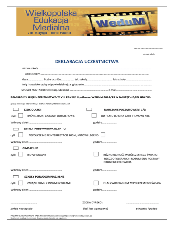 ..………………………………. pieczęć szkoły DEKLARACJA UCZESTNICTWA nazwa szkoły…………………………………………………………………………………………………………….......................................... adres szkoły.................................................................................................................................................... klasa……………........ liczba uczniów………....…… tel. szkoły……...………………......…. faks szkoły………..…………………….... imię i nazwisko osoby odpowiedzialnej za zgłoszenie………………………………………………………………………................... SPOSÓB KONTAKTU: tel.(stacj. lub kom).....................…………………………….. e-mail……………………..………………………. ZGŁASZAMY CHĘĆ UCZESTNICTWA W VIII EDYCJI/ II półrocze WEDUM 2014/15 W NASTĘPUJĄCEJ GRUPIE: (proszę zaznaczyć odpowiednio): WERSJA POLSKA/WERSJA ANGIELSKA SZEŚCIOLATKI: cykl: …… NAUCZANIE POCZĄTKOWE kl. 1/3: BAŚNIE, BAJKI, BAJKOWI BOHATEROWIE OD FILMU DO KINA CZYLI FILMOWE ABC Wybrany dzień:…………………………………………. godzina…………………. SZKOŁA PODSTAWOWA KL. IV – VI cykl : WSPÓŁCZESNE REINTERPRETACJE BAŚNI, MITÓW I LEGEND Wybrany dzień:…………………………………………. godzina…………………. GIMNAZJUM cykl: INDYWIDUALNY RÓŻNORODNOŚĆ WSPÓŁCZESNEGO ŚWIATA: RZECZ O TOLERANCJI I ROZUMIENIU POSTAWY DRUGIEGO CZŁOWIEKA. Wybrany dzień:…………………………………………. godzina…………………. SZKOŁY PONADGIMNAZJALNE cykl: ZWIĄZKI FILMU Z INNYMI SZTUKAMI FILM ZWIERCIADŁEM WSPÓŁCZESNEGO ŚWIATA Wybrany dzień:…………………………………………. godzina…………………. ………………………………… ZGODA DYREKCJI: podpis nauczyciela (jeśli jest wymagana) PROSIMY O ZOSTAWIENIE W KASIE KINA LUB PRZESŁANIE MAILEM ([email protected]) Na odwrocie znajdują się informacje dotyczące zasad płatności oraz regulamin. ..……………………………………….. pieczątka i podpis PŁATNOŚCI: Klasa płaci za seans na każdym spotkaniu (przed wejściem na salę kinową) lub wykupuje karnet na wszystkie spotkania (do dnia poprzedzającego pierwsze spotkanie). Cena biletu dla 1 osoby na seans: 10 zł; Bilety w miarę wolnych miejsc można kupić przed seansem (prosimy o kontakt z kasą kina). Cena karnetu ( na 4 spotkania) dla 1 osoby – 36 zł Karnety można kupić do dnia poprzedzającego pierwsze spotkanie. Niewykorzystane karnety nie podlegają zwrotowi. Opiekunowie uczestniczą w spotkaniach nieodpłatnie. W razie konieczności stosujemy znaczne ulgi dla max 2 uczestników (w ramach każdej klasy) znajdujących się w trudnej sytuacji finansowej. Prosimy o zaznaczenie takiej konieczności w formularzu zgłoszeniowym i złożenie odpowiedniego wniosku. REGULAMIN WeduM: 1. Opiekunowie grupy biorą odpowiedzialność za jej zachowanie w kinie. 2. Opiekun zapisując klasę do programu, podaje preferowany przez siebie sposób komunikacji z nim. Organizator nie ponosi odpowiedzialności, jeśli informacja wysłana we wskazany sposób nie dotrze do adresata. 3. Organizator zastrzega sobie prawo do zmian w programie z przyczyn od niego niezależnych. 4. Organizator zastrzega sobie prawo do zmiany terminów spotkań (o czym poinformuje z co najmniej 7 - dniowym wyprzedzeniem). 5. Organizator zastrzega sobie prawo do odwołania cyklu spotkań, jeśli nie zapiszą się na niego co najmniej cztery klasy. 6. Nauczyciel, który zgłasza klasę do programu, jest jego szkolnym koordynatorem i odpowiada za przepływ informacji wśród innych opiekunów danej grupy. 7. Na sali kinowej obowiązuje zakaz jedzenia: popcornu, chipsów, dań z restauracji McDonald’s itp. oraz używania telefonów komórkowych , aparatów fotograficznych i nagrywania. Zapoznałam/em się z warunkami regulaminu i sposobem płatności............………………………………