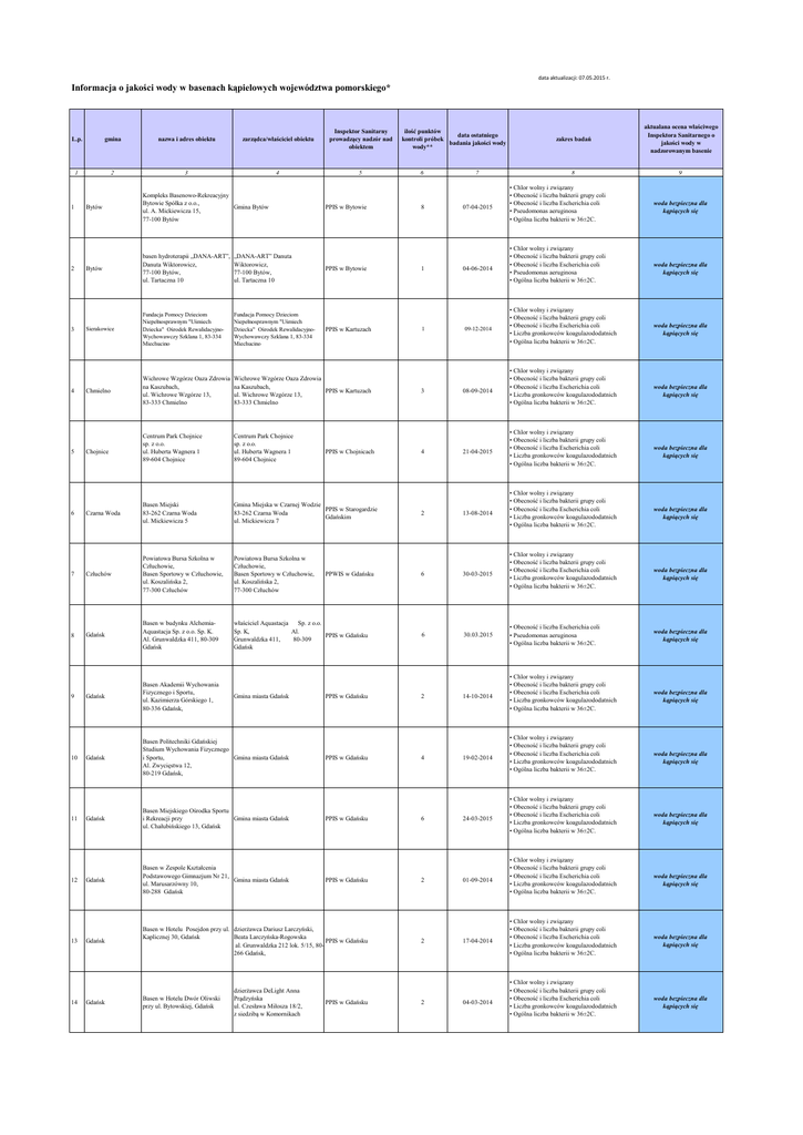 data aktualizacji: 07.05.2015 r. Informacja o jakości wody w basenach kąpielowych województwa pomorskiego* L.p. gmina nazwa i adres obiektu zarządca/właściciel obiektu Inspektor Sanitarny prowadzący nadzór nad obiektem 1 2 3 4 5 ilość punktów data ostatniego kontroli próbek badania jakości wody wody** 6 7 Bytów Kompleks Basenowo-Rekreacyjny Bytowie Spółka z o.o., Gmina Bytów ul. A. Mickiewicza 15, 77-100 Bytów Bytów basen hydroterapii „DANA-ART”, Danuta Wiktorowicz, 77-100 Bytów, ul. Tartaczna 10 „DANA-ART” Danuta Wiktorowicz, 77-100 Bytów, ul. Tartaczna 10 3 Sierakowice Fundacja Pomocy Dzieciom Niepełnosprawnym "Uśmiech Dziecka" Ośrodek RewalidacyjnoWychowawczy Szklana 1, 83-334 Miechucino Fundacja Pomocy Dzieciom Niepełnosprawnym "Uśmiech Dziecka" Ośrodek RewalidacyjnoWychowawczy Szklana 1, 83-334 Miechucino PPIS w Kartuzach 1 09-12-2014 4 Chmielno Wichrowe Wzgórze Oaza Zdrowia na Kaszubach, ul. Wichrowe Wzgórze 13, 83-333 Chmielno Wichrowe Wzgórze Oaza Zdrowia na Kaszubach, PPIS w Kartuzach ul. Wichrowe Wzgórze 13, 83-333 Chmielno 3 08-09-2014 Centrum Park Chojnice sp. z o.o. ul. Huberta Wagnera 1 89-604 Chojnice Centrum Park Chojnice sp. z o.o. ul. Huberta Wagnera 1 89-604 Chojnice Gmina Miejska w Czarnej Wodzie PPIS w Starogardzie 83-262 Czarna Woda Gdańskim ul. Mickiewicza 7 2 13-08-2014 6 30-03-2015 6 30.03.2015 1 2 5 Chojnice PPIS w Bytowie PPIS w Bytowie PPIS w Chojnicach 8 1 4 07-04-2015 04-06-2014 21-04-2015 6 Czarna Woda Basen Miejski 83-262 Czarna Woda ul. Mickiewicza 5 7 Człuchów Powiatowa Bursa Szkolna w Człuchowie, Basen Sportowy w Człuchowie, ul. Koszalińska 2, 77-300 Człuchów Powiatowa Bursa Szkolna w Człuchowie, Basen Sportowy w Człuchowie, ul. Koszalińska 2, 77-300 Człuchów 8 Gdańsk Basen w budynku AlchemiaAquastacja Sp. z o.o. Sp. K. Al. Grunwaldzka 411, 80-309 Gdańsk właściciel Aquastacja Sp. z o.o. Sp. K, Al. PPIS w Gdańsku Grunwaldzka 411, 80-309 Gdańsk 9 Gdańsk Basen Akademii Wychowania Fizycznego i Sportu, ul. Kazimierza Górskiego 1, 80-336 Gdańsk, Gmina miasta Gdańsk PPIS w Gdańsku 2 14-10-2014 10 Gdańsk Basen Politechniki Gdańskiej Studium Wychowania Fizycznego i Sportu, Gmina miasta Gdańsk Al. Zwycięstwa 12, 80-219 Gdańsk, PPIS w Gdańsku 4 19-02-2014 Gdańsk Basen Miejskiego Ośrodka Sportu i Rekreacji przy Gmina miasta Gdańsk ul. Chałubińskiego 13, Gdańsk 12 Gdańsk Basen w Zespole Kształcenia Podstawowego Gimnazjum Nr 21, Gmina miasta Gdańsk ul. Marusarzówny 10, 80-288 Gdańsk PPIS w Gdańsku 2 01-09-2014 13 Gdańsk Basen w Hotelu Posejdon przy ul. dzierżawca Dariusz Larczyński, Kaplicznej 30, Gdańsk Beata Larczyńska-Rogowska PPIS w Gdańsku al. Grunwaldzka 212 lok. 5/15, 80266 Gdańsk, 2 17-04-2014 Gdańsk Basen w Hotelu Dwór Oliwski przy ul. Bytowskiej, Gdańsk 11 14 dzierżawca DeLight Anna Prądzyńska ul. Czesława Miłosza 18/2, z siedzibą w Komornikach PPWIS w Gdańsku PPIS w Gdańsku PPIS w Gdańsku 6 2 24-03-2015 04-03-2014 zakres badań aktualana ocena właściwego Inspektora Sanitarnego o jakości wody w nadzorowanym basenie 8 9 • Chlor wolny i związany • Obecność i liczba bakterii grupy coli • Obecność i liczba Escherichia coli • Pseudomonas aeruginosa • Ogólna liczba bakterii w 36±2C. • Chlor wolny i związany • Obecność i liczba bakterii grupy coli • Obecność i liczba Escherichia coli • Pseudomonas aeruginosa • Ogólna liczba bakterii w 36±2C. • Chlor wolny i związany • Obecność i liczba bakterii grupy coli • Obecność i liczba Escherichia coli • Liczba gronkowców koagulazododatnich • Ogólna liczba bakterii w 36±2C. • Chlor wolny i związany • Obecność i liczba bakterii grupy coli • Obecność i liczba Escherichia coli • Liczba gronkowców koagulazododatnich • Ogólna liczba bakterii w 36±2C. • Chlor wolny i związany • Obecność i liczba bakterii grupy coli • Obecność i liczba Escherichia coli • Liczba gronkowców koagulazododatnich • Ogólna liczba bakterii w 36±2C. • Chlor wolny i związany • Obecność i liczba bakterii grupy coli • Obecność i liczba Escherichia coli • Liczba gronkowców koagulazododatnich • Ogólna liczba bakterii w 36±2C. • Chlor wolny i związany • Obecność i liczba bakterii grupy coli • Obecność i liczba Escherichia coli • Liczba gronkowców koagulazododatnich • Ogólna liczba bakterii w 36±2C. • Obecność i liczba Escherichia coli • Pseudomonas aeruginosa • Ogólna liczba bakterii w 36±2C. • Chlor wolny i związany • Obecność i liczba bakterii grupy coli • Obecność i liczba Escherichia coli • Liczba gronkowców koagulazododatnich • Ogólna liczba bakterii w 36±2C. • Chlor wolny i związany • Obecność i liczba bakterii grupy coli • Obecność i liczba Escherichia coli • Liczba gronkowców koagulazododatnich • Ogólna liczba bakterii w 36±2C. • Chlor wolny i związany • Obecność i liczba bakterii grupy coli • Obecność i liczba Escherichia coli • Liczba gronkowców koagulazododatnich • Ogólna liczba bakterii w 36±2C. • Chlor wolny i związany • Obecność i liczba bakterii grupy coli • Obecność i liczba Escherichia coli • Liczba gronkowców koagulazododatnich • Ogólna liczba bakterii w 36±2C. • Chlor wolny i związany • Obecność i liczba bakterii grupy coli • Obecność i liczba Escherichia coli • Liczba gronkowców koagulazododatnich • Ogólna liczba bakterii w 36±2C. • Chlor wolny i związany • Obecność i liczba bakterii grupy coli • Obecność i liczba Escherichia coli • Liczba gronkowców koagulazododatnich • Ogólna liczba bakterii w 36±2C. woda bezpieczna dla kąpiących się woda bezpieczna dla kąpiących się woda bezpieczna dla kąpiących się woda bezpieczna dla kąpiących się woda bezpieczna dla kąpiących się woda bezpieczna dla kąpiących się woda bezpieczna dla kąpiących się woda bezpieczna dla kąpiących się woda bezpiec