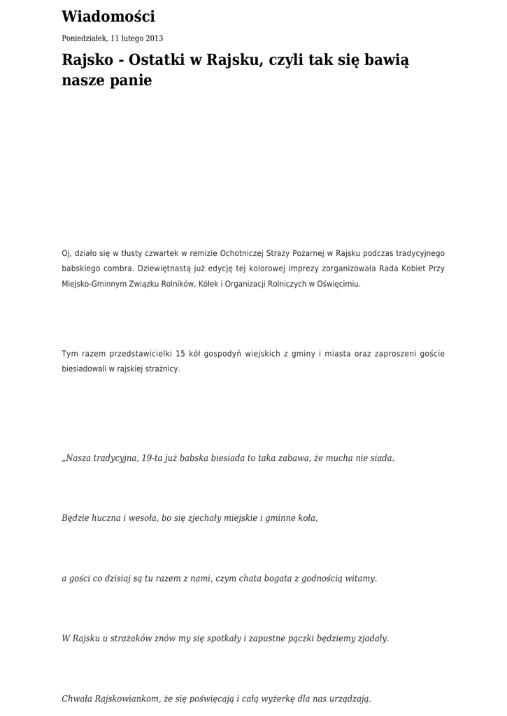 Wiadomości Poniedziałek, 11 lutego 2013 Rajsko - Ostatki w Rajsku, czyli tak się bawią nasze panie Oj, działo się w tłusty czwartek w remizie Ochotniczej Straży Pożarnej w Rajsku podczas tradycyjnego babskiego combra. Dziewiętnastą już edycję tej kolorowej imprezy zorganizowała Rada Kobiet Przy Miejsko-Gminnym Związku Rolników, Kółek i Organizacji Rolniczych w Oświęcimiu. Tym razem przedstawicielki 15 kół gospodyń wiejskich z gminy i miasta oraz zaproszeni goście biesiadowali w rajskiej strażnicy. „Nasza tradycyjna, 19-ta już babska biesiada to taka zabawa, że mucha nie siada. Będzie huczna i wesoła, bo się zjechały miejskie i gminne koła, a gości co dzisiaj są tu razem z nami, czym chata bogata z godnością witamy. W Rajsku u strażaków znów my się spotkały i zapustne pączki będziemy zjadały. Chwała Rajskowiankom, że się poświęcają i całą wyżerkę dla nas urządzają. Będą śpiewy, żarty, tańce, toast wypijemy i razem wspólnie poszalejemy. Do szalonych tych wyczynów niech się dołączą nasze wójciny. Więc się bawmy, zapomnijmy bóle, troski, bo już kończy się karnawał, bo to są zapusty i nasz coroczny babski comber” – tymi zgrabnym wierszykiem wszystkich zebranych przywitała Halina Skrzypczyk, przewodnicząca Rady Kobiet, której towarzyszył Stanisław Chowaniec (prezes MG ZKiOR). To właśnie ten duet przed kilkunastu laty zainicjował babskie combry w naszej gminie. Fantazyjnie poprzebierane panie, chóralne śpiewy, tańce, dobre jedzenie – tak pokrótce można by scharakteryzować czwartkowy babski comber w Rajsku. Zabawa udała się znakomicie. Wójt Małgorzata Grzywa przypomniała, iż ten wieczór należy się kobietom za ich całoroczną pracę i zaangażowanie w życie lokalnej społeczności. W dowód wdzięczności dla aktywności kół gospodyń, na ręce przewodniczących pani wójt wręczyła książki kucharskie – dla każdego koła innego autora. Podarunki przekazała także zastępca prezydenta Oświęcimia Maria Pędrak. Gospodynie z poszczególnych sołectw podczas żywiołowych występów na rajskiej scenie pokazały, że bawić potrafią się znakomicie i nie brakuje im poczucia humoru. Nieliczni na sali panowie, wśród nich m.in. przewodniczący rady gminy Piotr Śreniawski, otrzymali kotyliony. Prezes Ochotniczej Straży Pożarnej w Rajsku Zygmunt Stanclik wraz z sołtysem Maciejem Majerskim odegrali skecz, który raz na zawsze przekonał niedowiarków, że obu panom nieobcy jest bakcyl aktorski. Już dziś z niecierpliwością czekamy na to, co się zdarzy podczas przyszłorocznego, jubileuszowego, 20. combra babskiego.