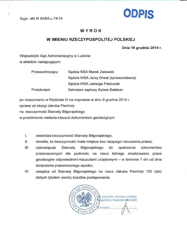 zobowiązał Starostę Biłgorajskiego do opatrzenia d o k u m e n t ó w przeznaczonych