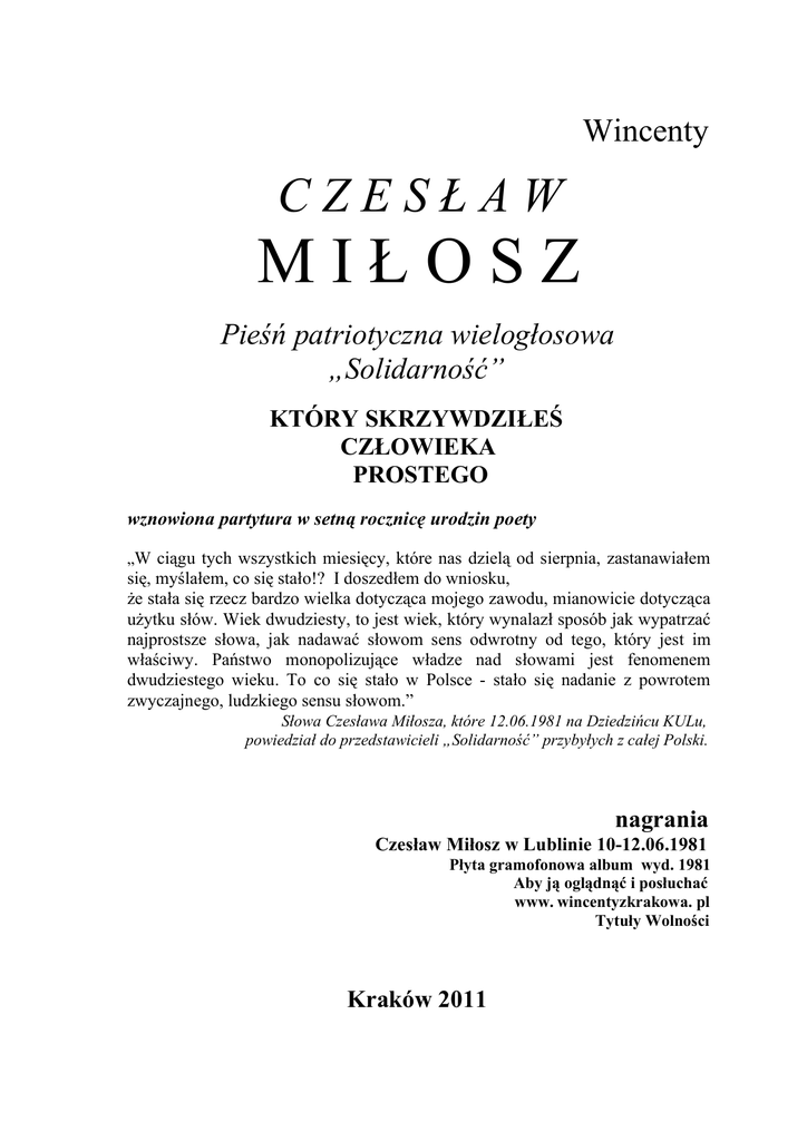 Wincenty CZESŁAW MIŁOSZ Pieśń patriotyczna wielogłosowa „Solidarność” KTÓRY SKRZYWDZIŁEŚ CZŁOWIEKA PROSTEGO wznowiona partytura w setną rocznicę urodzin poety „W ciągu tych wszystkich miesięcy, które nas dzielą od sierpnia, zastanawiałem się, myślałem, co się stało!? I doszedłem do wniosku, że stała się rzecz bardzo wielka dotycząca mojego zawodu, mianowicie dotycząca użytku słów. Wiek dwudziesty, to jest wiek, który wynalazł sposób jak wypatrzać najprostsze słowa, jak nadawać słowom sens odwrotny od tego, który jest im właściwy. Państwo monopolizujące władze nad słowami jest fenomenem dwudziestego wieku. To co się stało w Polsce - stało się nadanie z powrotem zwyczajnego, ludzkiego sensu słowom.” Słowa Czesława Miłosza, które 12.06.1981 na Dziedzińcu KULu, powiedział do przedstawicieli „Solidarność” przybyłych z całej Polski. nagrania Czesław Miłosz w Lublinie 10-12.06.1981 Płyta gramofonowa album wyd. 1981 Aby ją oglądnąć i posłuchać www. wincentyzkrakowa. pl Tytuły Wolności Kraków 2011 2 Który skrzywdziłeś - Czesław Miłosz - komp. Wincenty www. wincentyzkrakowa. pl Tytuły Wolności Copyright 1981 Wincenty Kraków 2011 Który skrzywdziłeś - Czesław Miłosz - komp. Wincenty 3 Wincenty Opis partytury 1/ partytura in C 2/ Dynamika i agogika " ad libitum " 3/ Wykonawcy a/ Osoba czytająca teksty / aktor / b/ Zespół wokalny: Soliści: sopran, baryton Chór mieszany c/ Zespół instrumentalny Dwa flety Dwa fagoty Perkusja /trzy osoby/ Kwintet smyczkowy 4/ Względny czas trwania kompozycji około siedmiu minut Kraków 2011 4 Który skrzywdziłeś - Czesław Miłosz - komp. Wincenty Który skrzywdziłeś - Czesław Miłosz - komp. Wincenty Spis treści /Na wstępie recytacja całego wiersza "Który skrzywdziłeś….."/ Muzyka - wstęp A / recytacja............................................................................................................. str. 9 Który skrzywdziłeś człowieka prostego Śmiechem nad krzywdą jego wybuchając, Gromadę błaznów koło siebie mając Na pomieszanie dobrego i złego, Opr. muzyczne: Który skrzywdziłeś człowieka prostego, B / recytacja......................................................................................................... str. 14 Który skrzywdziłeś człowieka prostego Śmiechem nad krzywdą jego wybuchając, Gromadę błaznów koło siebie mając Na pomieszanie dobrego i złego, Choćby przed tobą wszyscy się skłonili Cnotę i mądrość tobie przypisując, Złote medale na twoją cześć kując, Radzi że jeszcze jeden dzień przeżyli, Opr. muzyczne: Który skrzywdziłeś człowieka prostego, C / recytacja.......................................................................................................... str. 20 Który skrzywdziłeś człowieka prostego Śmiechem nad krzywdą jego wybuchając, Gromadę błaznów koło siebie mając Na pomieszanie dobrego i złego, Choćby przed tobą wszyscy się skłonili Cnotę i mądrość tobie przypisując, Złote medale na twoją cześć kując, Radzi że jeszcze jeden dzień przeżyli, Nie bądź bezpieczny. Poeta pamięta Możesz go zabić - narodzi się nowy. Spisane będą czyny i rozmowy. Lepszy dla ciebie byłby świt zimowy I sznur i gałąź pod ciężarem zgięta. Opr. muzyczne: Który skrzywdziłeś człowieka prostego, 5 6 Który skrzywdziłeś - Czesław Miłosz - komp. Wincenty Który skrzywdziłeś - Czesław Miłosz - komp. Wincenty 2 1 Flet I Flet II Fagot I Fagot II Trójkąt Talerz wiszący Bęben mały Solo Sopran Sopran Alt Tenor CHÓR Bas Solo Baryton Skrzypce I Skrzypce II Altówka Wiolonczela Kontrabas Nie bądź bezpieczny. Poeta pamięta Możesz go zabić - narodzi się nowy. Spisane będą czyny i rozmowy. Lepszy dla ciebie byłby świt zimowy I sznur i gałąź pod ciężarem zgięta. 5 Choćby przed tobą wszyscy się skłonili Cnotę i mądrość tobie przypisując, Złote medale na twoją cześć kując, Radzi że jeszcze jeden dzień przeżyli, 4 Który skrzywdziłeś człowieka prostego Śmiechem nad krzywdą jego wybuchając, Gromadę błaznów koło siebie mając Na pomieszanie dobrego i złego, 7 3 1 Któ - - - ry skrzyw- Który skrzywdziłeś - Czesław Miłosz - komp. Wincenty 8 6 Fl. I Fl. II Fg. I Fg. II Trgl. Ptto Tmb. Solo S. S A CORO T B Solo Bar. 8 9 10 11 Vno II Vla dzi 2 - Śmie - Śmie - chem łeś Śmie - chem czło- wie - - 5 3 Śmie - chem Cb. Vno I Vc. 7 - Śmie - - Śmie - ka 13 12 Fl. I Fl. II Fg. I Fg. II Trgl. Ptto Tmb. Solo S. S A CORO T B Solo Bar. chem A Który skrzywdziłeś człowieka prostego Śmiechem nad krzywdą jego wybuchając, Gromadę błaznów koło siebie mając Na pomieszanie dobrego i złego, 3 Któ Śmie - chem Któ Śmie - chem 9 16 15 Śmie - chem chem Vno II Cb. chem 14 Vc. Vno I Vla Który skrzywdziłeś - Czesław Miłosz - komp. Wincenty - Który skrzywdziłeś - Czesław Miłosz - komp. Wincenty 10 17 Fl. I Fl. II Fg. I Fg. II Trgl. Ptto Tmb. 18 A - - - Vno I Vno II Vla Vc. Cb. Solo Bar. B S T - ry skrzyw - dzi łeś 4 łeś - skrzyw - dzi ry 21 20 CORO 19 Solo S. Któ -