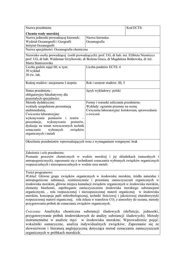 Nazwa przedmiotu Kod ECTS: Chemia wody morskiej Nazwa jednostki prowadzącej kierunek: Nazwa kierunku: Wydział Oceanografii i Geografii Oceanografia Instytut Oceanografii Nazwa specjalności: Oceanografia chemiczna Nazwisko osoby prowadzącej (osób prowadzących): prof. UG, dr hab. inŜ. ElŜbieta Niemirycz prof. UG, dr hab. Waldemar Grzybowski, dr BoŜena Graca, dr Magdalena Bełdowska, dr inŜ. Marta Staniszewska Liczba godzin zajęć 60, w tym: Liczba punktów ECTS: 4 30 wykład 30 ćw. lab. Rodzaj studiów: stacjonarne I stopnia Rok i semestr studiów: III, 5 Status przedmiotu : obligatoryjny/fakultatywny dla pozostałych specjalności Metody dydaktyczne: wykłady uzupełnione prezentacją multimedialną Ćwiczenia laboratoryjne: wykonywanie pomiarów i testów – prezentacje, wykonywanie posterów, dyskusje na temat nowoczesnych technik oznaczania wybranych związków organicznych i metali Język wykładowy: polski Formy i warunki zaliczania przedmiotu: Wykłady: egzamin pisemny na ocenę Ćwiczenia laboratoryjne: kolokwium, sprawozdanie z ćwiczeń Określenie przedmiotów wprowadzających wraz z wymaganiami wstępnymi: brak ZałoŜenia i cele przedmiotu: Poznanie procesów chemicznych w wodzie morskiej i jej składnikach (naturalnych i antropogenicznych); zapoznanie się z technikami oznaczania wybranych związków organicznych rozpuszczalnych i nierozpuszczalnych w wodzie oraz metali. Treści programowe: Wykład: Główne grupy związków organicznych w środowisku morskim, źródła naturalne i antropogeniczne substancji, rozmieszczenie i przemiany zanieczyszczeń organicznych w środowisku morskim, główne miejsca kumulacji związków organicznych w środowisku morskim, elementy biochemii, zapobieganie zanieczyszczeniu środowiska morskiego substancjami organicznymi, , rola rozpuszczonej i nierozpuszczonej materii organicznej w środowisku morskim, koncepcja pętli mikrobiologicznej, techniki ilościowej i jakościowej charakterystyki rozpuszczonej materii organicznej, rola Ŝelaza w transferze CO2 z atmosfery do oceanu, metody przygotowania próbek do oznaczania związków organicznych. Analityka chemiczna substancji śladowych (definicje, jednostki, przygotowywanie próbek środowiskowych do analizy substancji śladowych); Metody instrumentalne w analizie rtęci w środowisku morskim; Wprowadzenie pojęć: wskaźniki sumaryczne, analiza indywidualnych związków; Zapoznanie się ze słownictwem i literaturą anglojęzyczną dotycząca metod oznaczania zanieczyszczeń organicznych w próbkach morskich. Ćwiczenia: Umiejętności i kompetencje: znajomość specyfiki przemian chemicznych wynikającej ze składu wody morskiej; analizowanie wody morskiej przy uŜyciu wybranych metod instrumentalnych. Wykaz literatury -podstawowej: 1. Biogeochemistry of marine dissolved matter, Academic Press, Amsterdam, 2002 2. Niemirycz E., 2006, Halogenowane związki organiczne w ekosystemach rzecznych i odpływ tych związków do Morza Bałtyckiego, Wyd. IMGW, 121 3. Principles and applications of aquatic chemistry, F. Morel i J. Hering, John Wiley & Sons, New York, 1993 4. Jones L., Atkins P., 2006, Chemia ogólna: cząsteczki, materia, reakcje, Wyd. PWN,1056 5. Dojlido J., Zerbe J.,1997, Instrumentalne metody badania wody i ścieków, Wyd. Arkady, 271 - uzupełniająca: 1. Dudzińska, Występowanie i przemiany PCDD/Fs w układach osady ściekowegleba, 2003, Wyd. PAN Lublin, 175 2. Pobieranie próbek środowiskowych do analizy, J. Namieśnik, J. Łukasiak, Z. Jamrógiewicz, PWN, Warszawa 1995,278 3. Pestycydy, występowanie, oznaczanie i unieszkodliwianie, praca zbiorowa pod red. M. Biziuka, WNT, Warszawa 2001
