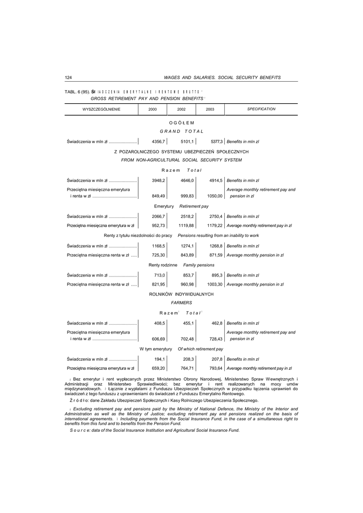 124 WAGES AND SALARIES. SOCIAL SECURITY BENEFITS TABL. 6 (95). WIADCZENIA EMERYTALNE I RENTOWE BRUTTO a GROSS RETIREMENT PAY AND PENSION BENEFITS WYSZCZEGÓLNIENIE 2000 2002 OGÓ GRAND wiadczenia w mln z ........................ 4356,7 a SPECIFICATION 2003 EM TOTAL 5101,1 5377,3 Benefits in mln zl Z POZAROLNICZEGO SYSTEMU UBEZPIECZE SPO ECZNYCH FROM NON-AGRICULTURAL SOCIAL SECURITY SYSTEM Razem wiadczenia w mln z ........................ Total 3948,2 4646,0 849,49 999,83 4914,5 Benefits in mln zl Przeci tna miesi czna emerytura i renta w z ...................................... Average monthly retirement pay and Emerytury wiadczenia w mln z ........................ Przeci tna miesi czna emerytura w z pension in zl Retirement pay 2066,7 2518,2 952,73 1119,88 Renty z tytu u niezdolno ci do pracy 1050,00 2750,4 Benefits in mln zl 1179,22 Average monthly retirement pay in zl Pensions resulting from an inability to work wiadczenia w mln z ........................ 1168,5 1274,1 1268,8 Benefits in mln zl Przeci tna miesi czna renta w z ..... 725,30 843,89 871,59 Average monthly pension in zl Renty rodzinne Family pensions wiadczenia w mln z ........................ 713,0 853,7 Przeci tna miesi czna renta w z ..... 821,95 960,98 895,3 Benefits in mln zl 1003,30 Average monthly pension in zl ROLNIKÓW INDYWIDUALNYCH FARMERS R a z e mb wiadczenia w mln z ........................ Total 408,5 455,1 606,69 702,48 b 462,8 Benefits in mln zl Przeci tna miesi czna emerytura i renta w z ...................................... Average monthly retirement pay and W tym emerytury wiadczenia w mln z ........................ Przeci tna miesi czna emerytura w z 728,43 pension in zl Of which retirement pay 194,1 208,3 659,20 764,71 207,8 Benefits in mln zl 793,64 Average monthly retirement pay in zl a Bez emerytur i rent wyp acanych przez Ministerstwo Obrony Narodowej, Ministerstwo Spraw W ewn trznych i Administracji oraz Ministerstwo Sprawiedliwo ci; bez emerytur i rent realizowanych na mocy umów mi dzynarodowych. b cznie z wyp atami z Funduszu Ubezpiecze Spo ecznych w przypadku czenia uprawnie do wiadcze z tego funduszu z uprawnieniami do wiadcze z Funduszu Emerytalno Rentowego. r ó d o: dane Zak adu Ubezpiecze Spo ecznych i Kasy Rolniczego Ubezpieczenia Spo ecznego. a Excluding retirement pay and pensions paid by the Ministry of National Defence, the Ministry of the Interior and Administration as well as the Ministry of Justice; excluding retirement pay and pensions realized on the basis of international agreements. b Including payments from the Social Insurance Fund, in the case of a simultaneous right to benefits from this fund and to benefits from the Pension Fund. S o u r c e: data of the Social Insurance Institution and Agricultural Social Insurance Fund. WAGES AND SALARIES. SOCIAL SECURITY BENEFITS 125