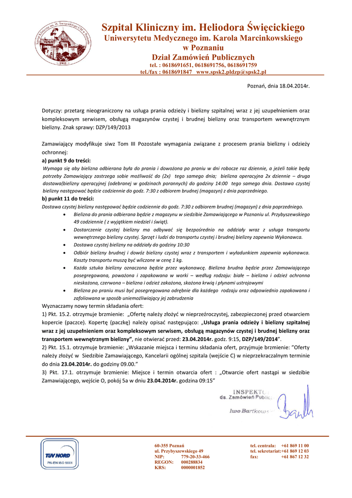Szpital Kliniczny im. Heliodora Święcickiego Uniwersytetu Medycznego im. Karola Marcinkowskiego w Poznaniu Dział Zamówień Publicznych tel. : 0618691651, 0618691756, 0618691759 tel./fax : 0618691847 [email protected] Poznań, dnia 18.04.2014r. Dotyczy: przetarg nieograniczony na usługa prania odzieży i bielizny szpitalnej wraz z jej uzupełnieniem oraz kompleksowym serwisem, obsługą magazynów czystej i brudnej bielizny oraz transportem wewnętrznym bielizny. Znak sprawy: DZP/149/2013 Zamawiający modyfikuje siwz Tom III Pozostałe wymagania związane z procesem prania bielizny i odzieży ochronnej: a) punkt 9 do treści: Wymaga się aby bielizna odbierana była do prania i dowożona po praniu w dni robocze raz dziennie, a jeżeli takie będą potrzeby Zamawiający zastrzega sobie możliwość do (2x) tego samego dnia; bielizna operacyjna 2x dziennie – druga dostawa(bielizny operacyjnej (odebranej w godzinach porannych) do godziny 14:00 tego samego dnia. Dostawa czystej bielizny następować będzie codziennie do godz. 7:30 z odbiorem brudnej (magazyn) z dnia poprzedniego. b) punkt 11 do treści: Dostawa czystej bielizny następować będzie codziennie do godz. 7:30 z odbiorem brudnej (magazyn) z dnia poprzedniego. Bielizna do prania odbierana będzie z magazynu w siedzibie Zamawiającego w Poznaniu ul. Przybyszewskiego 49 codziennie ( z wyjątkiem niedziel i świąt). Dostarczenie czystej bielizny ma odbywać się bezpośrednio na oddziały wraz z usługa transportu wewnętrznego bielizny czystej. Sprzęt i ludzi do transportu czystej i brudnej bielizny zapewnia Wykonawca. Dostawa czystej bielizny na oddziały do godziny 10:30 Odbiór bielizny brudnej i dowóz bielizny czystej wraz z transportem i wyładunkiem zapewnia wykonawca. Koszty transportu muszą być wliczone w cenę 1 kg. Każda sztuka bielizny oznaczona będzie przez wykonawcę. Bielizna brudna będzie przez Zamawiającego posegregowana, poważona i zapakowana w worki – według rodzaju: białe – bielizna i odzież ochronna nieskażona, czerwona – bielizna i odzież zakażona, skażona krwią i płynami ustrojowymi Bielizna po praniu musi być posegregowana odrębnie dla każdego rodzaju oraz odpowiednio zapakowana i zafoliowana w sposób uniemożliwiający jej zabrudzenia Wyznaczamy nowy termin składania ofert: 1) Pkt. 15.2. otrzymuje brzmienie: „Ofertę należy złożyć w nieprzeźroczystej, zabezpieczonej przed otwarciem kopercie (paczce). Kopertę (paczkę) należy opisać następująco: „Usługa prania odzieży i bielizny szpitalnej wraz z jej uzupełnieniem oraz kompleksowym serwisem, obsługą magazynów czystej i brudnej bielizny oraz transportem wewnętrznym bielizny”, nie otwierać przed: 23.04.2014r. godz. 9:15, DZP/149/2014”. 2) Pkt. 15.1. otrzymuje brzmienie: „Wskazanie miejsca i terminu składania ofert, przyjmuje brzmienie: ”Oferty należy złożyć w Siedzibie Zamawiającego, Kancelarii ogólnej szpitala (wejście C) w nieprzekraczalnym terminie do dnia 23.04.2014r. do godziny 09.00.” 3) Pkt. 17.1. otrzymuje brzmienie: Miejsce i termin otwarcia ofert : „Otwarcie ofert nastąpi w siedzibie Zamawiającego, wejście O, pokój 5a w dniu 23.04.2014r. godzina 09:15” 60-355 Poznań ul. Przybyszewskiego 49 NIP: 779-20-33-466 REGON: 000288834 KRS: 0000001852 tel. centrala: +61 869 11 00 tel. sekretariat:+61 869 12 03 fax: +61 867 12 32