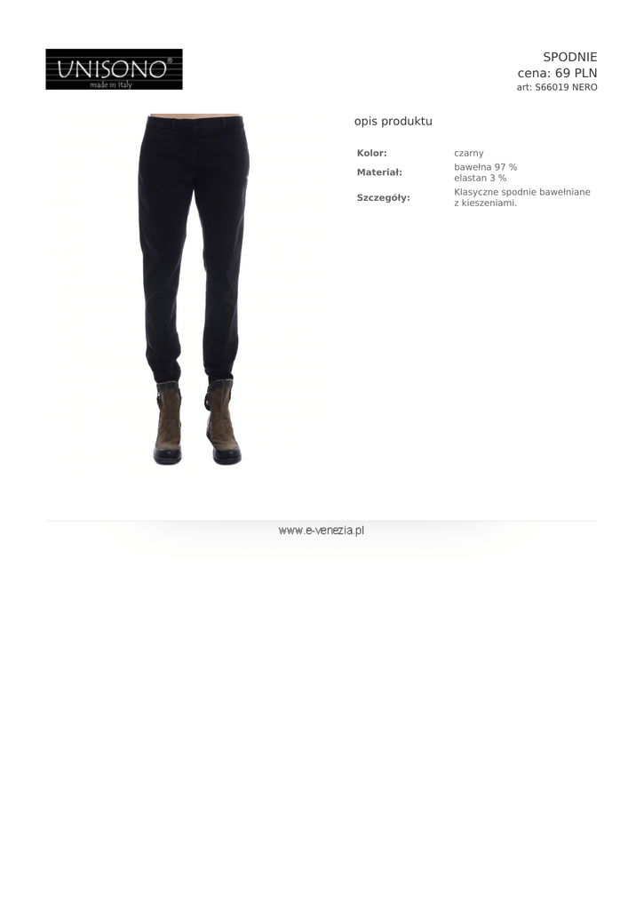 SPODNIE cena: 69 PLN art: S66019 NERO opis produktu Kolor: czarny Materiał: bawełna 97 % elastan 3 % Szczegóły: Klasyczne spodnie bawełniane z kieszeniami.