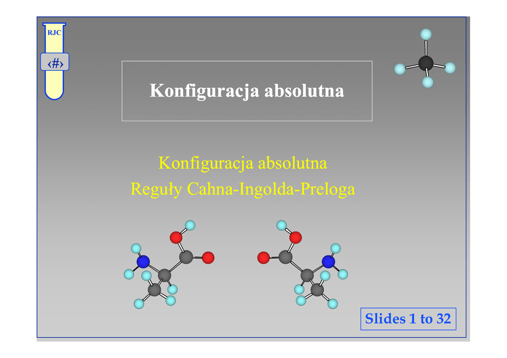 RJC ‹#› Konfiguracja absolutna Konfiguracja absolutna Reguły CahnaCahna-Ingolda Ingolda--Preloga Slides 1 to 32 RJC ‹#› Reguły CahnaCahna-IngoldaIngolda-Preloga Sposób określenia absolutnej konfiguracji (R lub S) centrum asymetrycznego. Reguły 1+2+3 : waŜność podstawników Reguła 4 : z ruchem wskazówek zegara lub przeciwnie do tego ruchu Reguła 5 : określ konfigurację R lub S RJC Reguła Nr 1 ‹#› UłóŜ szereg waŜności podstawników połączonych bezpośrednio z centrum asymetrycznym w oparciu o malejącą liczbę atomową. 1 Br C 2 Cl 4 H CH3 3 RJC Reguła Nr 2 ‹#› JeŜeli taki szereg nie moŜe być ułoŜony wg reguły 1, porównaj waŜność drugich atomów w kaŜdym z podstawników. O O O H H 1 2 C H H H CH3 4 3 H H H RJC Reguła Nr 3 ‹#› Wiązania wielokrotne rozpatruje się tak, jakby stanowiły równowaŜniki atomów połączonych wiązaniem pojedynczym. O C C H 1 2 C H H H CH3 4 3 H H H RJC Reguła Nr 4 ‹#› Ustaw cząsteczkę tak, aby grupa najmniej waŜna znalazła się jak najdalej od obserwatora. 1 Br 2 Cl C 1 Br 4 H CH3 3 C 2 Cl CH3 3 RJC ‹#› Reguła Nr 5 Określ sposób przejścia (1(1-2-3) po grupach wokół centrum asymetrycznego. 1 Br C 2 Cl CH3 3 JeŜeli przejście odbywa się przeciwnie do ruchu wskazówek zegara, to absolutna konfiguracja jest określana jako S. RJC Reguła Nr 5 ‹#› Określ szereg waŜności 1 → 2 → 3 grup wokół centrum asymetrycznego. 1 Br C 3 CH3 Cl 2 JeŜeli ta sekwencja wypada zgodnie z ruchem wskazówek zegara, to absolutna konfiguracja jest określona jako R. RJC Na przykład... alanina ‹#› Alanina jest chiralnym aminokwasem, który występuje w postaci dwóch enancjomerów. H2N CO2H H CH3 HO2C NH2 H3C H RJC (R) oraz (S) alanina ‹#› 1 H2N 2 CO2H 2 HO2C 1 NH2 H CH3 4 3 H3C H 3 4 (R)-alanina (S)-alanina RJC ‹#› Więcej niŜ jedno centrum asymetryczne ? Zastosuj reguły CahnaCahna-IngoldaIngolda-Preloga do kaŜdego z centrów asymetrycznych. Br H H I RJC ‹#› Na przykład... 22-bromobromo-3-jodobutan Określ waŜność podstawników wokół atomu C2. 1 4 Br H 3 H H H 2 H I I C H RJC ‹#› Na przykład... 22-bromobromo-3-jodobutan Spójrz na cząsteczkę z właściwej strony i ustal sekwencję 1 → 2 → 3 wokół C2 jako (R) lub (S). 1 4 Br H 2 3 H I 2R RJC ‹#› Na przykład... 22-bromobromo-3-jodobutan Określ priorytet podstawników wokół C3. Br C H Br H 3 2 H I 4 1 H H H RJC ‹#› Na przykład... 22-bromobromo-3-jodobutan Spójrz na cząsteczkę we właściwy sposób i określ sposób przejścia 1 → 2 → 3 wokół C3 (R) (zgodny z ruchem) lub (S) (przeciwny). Br H 3 2 H I 4 3R 1 RJC Enancjomery ‹#› JeŜeli jeden ze stereoizomerów został określony jako (2R,3R) to drugi (enancjomer) musi być (2S,3S). Br H H I (2R,3R)-2-bromo-3-jodobutan H Br I H (2S,3S)-2-bromo-3-jodobutan RJC Diastereomery ‹#› JeŜeli badany stereoizomer został określony jako (2R,3S) to diastereomery MUSZĄ być opisane jako (2R,3S) i (2S,3R). Br H I H (2R,3S)-2-bromo-3-jodobutan H Br H I (2S,3R)-2-bromo-3-jodobutan RJC Związki mezo... ‹#› mezo--2,3mezo 2,3-dibromobutan Ustal szereg waŜności podstawników wokół C2. 1 4 Br H H H H 3 2 Br H Br C H RJC ‹#› Związki mezo... mezo--2,3mezo 2,3-dibromobutan Spójrz na cząsteczkę z właściwej strony i ustal sposób przejścia 1→ 1→2 → 3 wokół C2; moŜe on być zgodny z ruchem wskazówek zegara (R) lub przeciwny (S). 1 4 Br H 2 3 Br H 2R RJC ‹#› Związki mezo... mezo--2,3mezo 2,3-dibromobutan Określ szereg waŜności podstawników wokół C3. Br H Br C H 3 2 Br H 1 4 H H H RJC ‹#› Związki mezo... 2,32,3-dibromobutan Spójrz na cząsteczkę z właściwej strony i określ szereg waŜności (sekwencję) 1 → 2 → 3 wokół C3; otrzymasz konfigurację absolutną (R) lub (S). Br H H Br 3 2 Br H 1 4 3 180°° 180 2 H Br 4 1 3S RJC ‹#› Związki mezo... Płaszczyzna symetrii Odbicie lustrzane dla stereoizomeru o konfiguracji absolutnej (2R,3S) musi być (2S,3R). Br H H Br Br H H Br (2R,3S)-2,3-dibromobutan (2S,3R)-2,3-dibromobutan RJC Związki mezo... Numeracja ‹#› PoniewaŜ sposób numeracji atomów węgla w łańcuchu jest arbitralny, obydwa stereoizomery (2R,3S) i (2S,3R) są identyczne. Br H Br H 2R 3S Br H (2R,3S)-2,3-dibromobutan = 3R 2S Br H (2S,3R)-2,3-dibromobutan RJC (-)-Karwon ‹#› O C H H • • • 1 C C C C H H RJC (-)-Karwon ‹#› O O C O • C C H • 2 3 1 RJC ‹#› (-)-Karwon O 2 3 1 (R)-karwon RJC (-) vs (+) Karwon ‹#› (-)-karwon (+)-karwon O O 2 3 1 (R)-karwon 3 2 1 (S)-karwon RJC (-) vs (+) Dopamina ‹#› (-)-Dopa (+)-Dopa 2 3 CO2H HO 2 3 HO2C H NH2 H2N H 1 1 4 OH (S)-Dopa OH 4 OH (R)-Dopa RJC (-) vs (+) Talidomid ‹#› (-)-talidomid (+)-talidomid O 1 N O O O 3 2 O N H (S)-talidomid 3 O N H 2 1 N O O (R)-talidomid RJC ‹#› Bardziej złoŜona cząsteczka, np... cholesterol Cholesterol występuje w naturze. H H H HO Ile centrów asymetrycznych oraz stereoizomerów istnieje w cząsteczce? (8 i 28) Jak wiele stereoizomerów występuje w naturze i jak określić w nich absolutną konfigurację centrów asymetrycznych? RJC ‹#› Bardziej skomplikowana cząsteczka... Insulina Insulina (peptyd złoŜony z 51 aminokwasów) reguluje metabolizm cukrów. Z powodu niewydolności organizmu do jej syntezy, diabetycy muszą otrzymywać regularnie określoną dawkę insuliny. Ile centrów asymetrycznych istnieje w cząsteczce insuliny? (47 i 247) Ile stereoizomerów insuliny występuje w naturze ? RJC ‹#› Podsumowanie Konfiguracja absolutna Reguły Cahna-Ingolda-Preloga Konfiguracja R oraz S Stereochemia Związki mezo Enancjomery Diastereomery