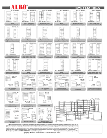 ® SYSTEM IDEA RG +ZP 200x90x34 RG 200x90x34 RGS +ZP 200x90x34 RGS 200x90x34 Rega∏ /zwieƒczenie pó∏okràg∏e RGSD +ZP 200x90x34 RGSD 200x90x34 Rega∏ z szafkà dolnà /zwieƒczenie pó∏okràg∏e RG +ZP 200x60x34 RG 200x60x34 Rega∏ z szafkà dolnà i drzwiczkami szklanymi /ZP RGS +ZP 200x60x34 RGS 200x60x34 Rega∏ /zwieƒczenie pó∏okràg∏e RGSD +ZP 200x60x34 RGSD 200x60x34 Rega∏ z szafkà dolnà /zwieƒczenie pó∏okràg∏e Rega∏ z szafkà dolnà i drzwiczkami szklanymi /ZP RNW 200x70x70 RNZ 200x34x34 RG + ZB 200x90x50 RGS + ZB 200x90x50 RGSD + ZB 200x90x50 RG + ZB 200x60x50 RGS + ZB 200x60x50 Rega∏ naro˝ny zewn´trzny Rega∏ naro˝ny wewn´trzny Rega∏ +zwieƒczenie baldachimowe Rega∏ z szafkà dolnà +zwieƒczenie baldachimowe Rega∏ z szafkà dolnà i drzwiczkami szklanymi +ZB Rega∏ +zwieƒczenie baldachimowe Rega∏ z szafkà dolnà +zwieƒczenie baldachimowe RNW + ZB 200x70x70 RG+ZP 230x90x34 RGS+ZP 230x90x34 RG+ZP 230x60x34 RGS+ZP 230x60x34 RGSD + ZB 200x60x50 RNZ + ZB 200x50x50 Rega∏ z szafkà dolnà i drzwiczkami szklanymi +ZB Rega∏ naro˝ny zewn. +ZB Rega∏ naro˝ny wewn. +ZB RG 230x90x34 RGS 230x90x34 Rega∏ /zwieƒczenie pó∏okràg∏e RG 230x60x34 Rega∏ z szafkà dolnà /zwieƒczenie pó∏okràg∏e RGS 230x60x34 Rega∏ /zwieƒczenie pó∏okràg∏e RNW 230x70x70 Rega∏ z szafkà dolnà /zwieƒczenie pó∏okràg∏e RNW + ZB 230x70x70 RNZ 230x34x34 RG + ZB 230x90x50 RGS + ZB 230x90x50 RG + ZB 230x60x50 RGS + ZB 230x60x50 RNZ + ZB 230x50x50 Rega∏ naro˝ny zewn´trzny Rega∏ naro˝ny wewn´trzny Rega∏ +zwieƒczenie baldachimowe Rega∏ z szafkà dolnà +zwieƒczenie baldachimowe Rega∏ +zwieƒczenie baldachimowe Rega∏ z szafkà dolnà +zwieƒczenie baldachimowe Rega∏ naro˝ny zewn. +ZB Rega∏ naro˝ny wewn. +ZB LPS 1 - 90 90x50x90 LPS 2/3-120 LPS 1/3-120 LPS 1/3-120+SZJ LPP 1-120 90x50x120 90x50x120 90x50x120 90x50x120 LPS 2/3-60 LPS 1/3-60 LPS 1/3-60+SZJ LPP 1-60 90x50x60 90x50x60 90x50x60 90x50x60 LPS 1 - 60 LPS 2/3-90 LPS 1/3-90 LPS 1/3-90 +SZJ LPP 1-90 90x50x60 90x50x90 90x50x90 90x50x90 90x50x90 Lada przeszklona ca∏kowicie Lada przeszklona w 2/3 Lada przeszklona w 1/3 LW 2/3 - 90 LW 1/3 - 90 NS - 90 150x50x90 150x50x90 60x30x90 LW 2/3 - 60 LW 1/3 - 60 150x50x60 150x50x60 Lada witryna przeszklona w 2/3 PC - 90 Lada przeszklona w 1/3 z szufladà jubilerskà Lada pe∏na NS - 60 60x30x60 Lada witryna przeszklona w 1/3 PT-120 Nadstawka na lad´ SZK ZP - 90 PT-60 ZP - 60 PC - 60 PT-90 ZT - 60 Pó∏ka cukiernicza do rega∏u Podpórka pod torby ZT - 90 Szuflada kasowa zwieƒcz. pó∏okràg∏e/trójkàtne IDEA to modu∏owy system mebli przeznaczony do sklepów wielu bran˝. Meble produkowane sà z laminowanej p∏yty wiórowej. Kraw´dzie p∏yt wykoƒczone sà okleinà ABS, co doskonale chroni je przed uszkodzeniami. W ladach zastosowaliÊmy dodatkowo profil aluminiowy, który podnosi walory estetyczne mebla i jednoczeÊnie wzmacnia ca∏à konstrukcj´. Praktycznym udogodnieniem dla klientów jest mo˝liwoÊç zamontowania pó∏ek na zakupy. Sprzedawcom przyda si´ tak˝e szuflada kasowa i w razie potrzeby, jubilerska. Aby polepszyç ekspozycj´ towarów oraz zaprezentowaç meble w pe∏nej oprawie, proponujemy Paƒstwu zamontowanie oÊwietlenia ˝arówkowego lub halogenowego. Szeroki wybór wariantów rega∏ów i lad pozwoli Paƒstwu dopasowaç system do w∏asnych potrzeb. Meble przystosowane sà do samodzielnego monta˝u. Do transportu pakowane sà w kartonowe pud∏a. Mo˝liwe jest wyprodukowanie MEBLI FIRMOWYCH o indywidualnej stylistyce. Kolorystyka systemu wed∏ug oddzielnego wzornika. ˚yczymy Paƒstwu zadowolenia z wyboru naszych mebli. LNZ 90x50x50 LNW 90x50x50 Lada naro˝na zewn´trzna Lada naro˝na wewn´trzna