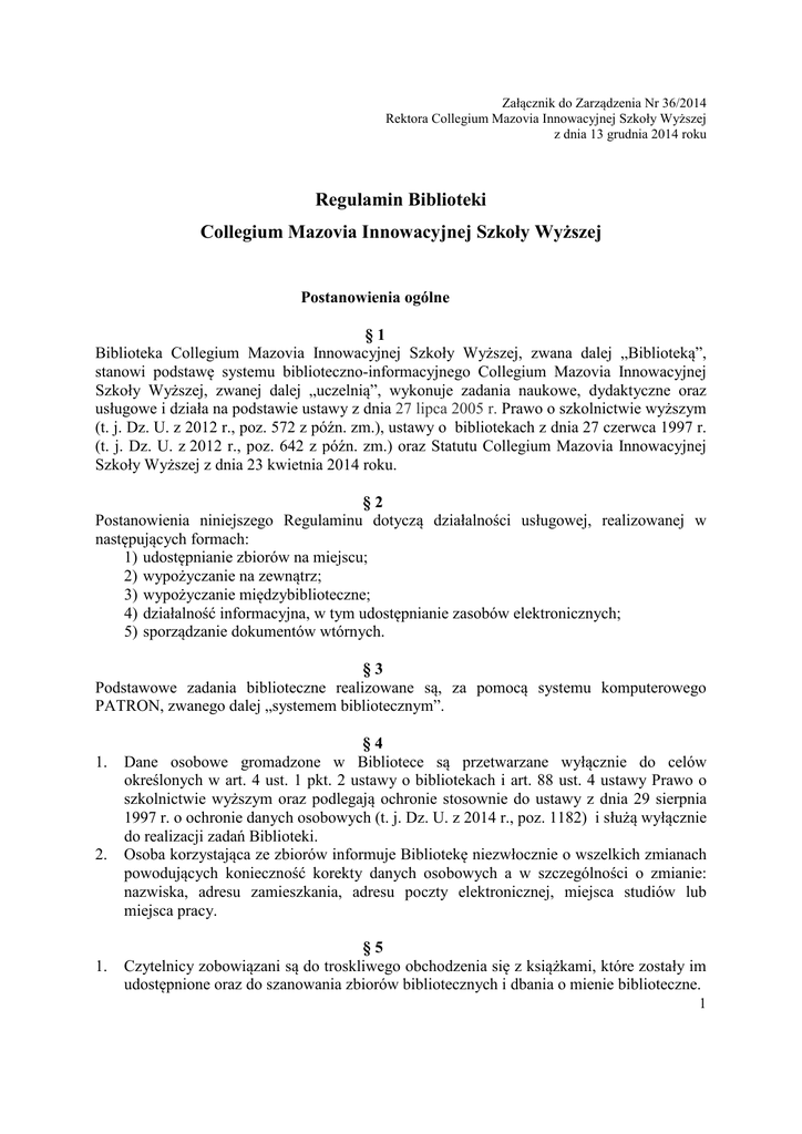 Załącznik do Zarządzenia Nr 36/2014 Rektora Collegium Mazovia Innowacyjnej Szkoły Wyższej z dnia 13 grudnia 2014 roku Regulamin Biblioteki Collegium Mazovia Innowacyjnej Szkoły Wyższej Postanowienia ogólne §1 Biblioteka Collegium Mazovia Innowacyjnej Szkoły Wyższej, zwana dalej „Biblioteką”, stanowi podstawę systemu biblioteczno-informacyjnego Collegium Mazovia Innowacyjnej Szkoły Wyższej, zwanej dalej „uczelnią”, wykonuje zadania naukowe, dydaktyczne oraz usługowe i działa na podstawie ustawy z dnia 27 lipca 2005 r. Prawo o szkolnictwie wyższym (t. j. Dz. U. z 2012 r., poz. 572 z późn. zm.), ustawy o bibliotekach z dnia 27 czerwca 1997 r. (t. j. Dz. U. z 2012 r., poz. 642 z późn. zm.) oraz Statutu Collegium Mazovia Innowacyjnej Szkoły Wyższej z dnia 23 kwietnia 2014 roku. §2 Postanowienia niniejszego Regulaminu dotyczą działalności usługowej, realizowanej w następujących formach: 1) udostępnianie zbiorów na miejscu; 2) wypożyczanie na zewnątrz; 3) wypożyczanie międzybiblioteczne; 4) działalność informacyjna, w tym udostępnianie zasobów elektronicznych; 5) sporządzanie dokumentów wtórnych. §3 Podstawowe zadania biblioteczne realizowane są, za pomocą systemu komputerowego PATRON, zwanego dalej „systemem bibliotecznym”. 1. 2. 1. §4 Dane osobowe gromadzone w Bibliotece są przetwarzane wyłącznie do celów określonych w art. 4 ust. 1 pkt. 2 ustawy o bibliotekach i art. 88 ust. 4 ustawy Prawo o szkolnictwie wyższym oraz podlegają ochronie stosownie do ustawy z dnia 29 sierpnia 1997 r. o ochronie danych osobowych (t. j. Dz. U. z 2014 r., poz. 1182) i służą wyłącznie do realizacji zadań Biblioteki. Osoba korzystająca ze zbiorów informuje Bibliotekę niezwłocznie o wszelkich zmianach powodujących konieczność korekty danych osobowych a w szczególności o zmianie: nazwiska, adresu zamieszkania, adresu poczty elektronicznej, miejsca studiów lub miejsca pracy. §5 Czytelnicy zobowiązani są do troskliwego obchodzenia się z książkami, które zostały im udostępnione oraz do szanowania zbiorów bibliotecznych i dbania o mienie biblioteczne. 1 2. 3. 4. Podstawę do wypożyczenia zbiorów stanowi karta biblioteczna i potwierdzony własnoręcznym podpisem dokument o konieczności ścisłego przestrzegania Regulaminu Biblioteki. Wynoszenie zbiorów i przedmiotów będących własnością Biblioteki poza jej obręb bez dopełnienia obowiązujących formalności jest niedozwolone. Czas pracy Biblioteki, jak też wszelkie zmiany w działalności usługowej podany jest do wiadomości użytkowników. Udostępnianie zbiorów na miejscu §6 Prawo do korzystania z materiałów bibliotecznych w czytelni mają wszystkie osoby pełnoletnie - po przedłożeniu i zdeponowaniu dokumentu tożsamości u dyżurującego bibliotekarza. §7 Z prac dyplomowych przechowywanych w formie papierowej, można korzystać wyłącznie w pomieszczeniu czytelni, natomiast z prac dyplomowych przechowywanych w formie elektronicznej można korzystać na przeznaczonych do tego celu stanowiskach komputerowych również tylko w czytelni. §8 Niedozwolone jest wykonywanie jakichkolwiek kopii pochodzących z prac dyplomowych. Wypożyczanie na zewnątrz 1. 2. 3. 4. 5. 6. 7. 8. 1. §9 Dokumentem uprawniającym do wypożyczania jest ważna karta biblioteczna, która wydawana jest przez pracownika wypożyczalni. Karty bibliotecznej nie wolno udostępniać osobom trzecim. O zagubieniu karty bibliotecznej należy niezwłocznie zawiadomić Bibliotekę. Właściciel karty ponosi wszelkie konsekwencje wynikające z używania jej przez osoby trzecie. Wystawienie duplikatu karty bibliotecznej jest rejestrowane i dopuszczalne tylko w uzasadnionych przypadkach. Po wystawieniu duplikatu karty czytelnik ma obowiązek stawiać się do Biblioteki koniecznie z dodatkowym dokumentem uwiarygodniającym jego osobę (np. legitymacja, dowód osobisty, paszport, prawo jazdy itp.). W indywidualnych sytuacjach istnieje możliwość złożenia pisemnego upoważnienia do korzystania z karty bibliotecznej dla innej osoby. Upoważnienie może być udzielone tylko podczas osobistej wizyty właściciela karty w Bibliotece. § 10 Do bezpłatnego korzystania z wypożyczalni uprawnieni są: 1) studenci uczelni; 2) absolwenci uczelni; 3) pracownicy uczelni; 2 2. 3. 4. 1. 2. 3. 4. 1. 2. 3. 4. 1. 2. 3. 4. 1. 2. 4) słuchacze studiów podyplomowych i kursów organizowanych przez uczelnię. Czytelnik może mieć tylko jedno konto. Osoby niepełnosprawne, korzystające z usług Biblioteki, obsługiwane są poza kolejnością. Do odpłatnego korzystania z wypożyczalni mają prawo osoby pełnoletnie, po dokonaniu niezbędnych formalności i wniesieniu opłaty rocznej, wymienionej w załączniku nr 1. § 11 Książki mogą być udostępniane w następujących liczbach i powinny być zwrócone w następujących terminach: 1) w przypadku pracowników - maksymalnie 10 woluminów na okres 90 dni; 2) w przypadku studentów - maksymalnie 3 woluminy na okres 30 dni; 3) w przypadku pozostałych osób - maksymalnie 3 woluminy na okres 30 dni. Biblioteka może skrócić termin wypożyczenia w szczególnych przypadkach. W razie potrzeby można dokonać prolongaty terminu wypożyczenia książki. Warunkiem uzyskania prolongaty jest: 1) brak zamówienia na określoną książkę, złożonego przez inną osobę do chwili rozpatrywania wniosku o prolongatę; 2) brak zobowiązań i zaległości wobec Biblioteki, zarejestrowanych na koncie czytelnika. § 12 Czytelnik jest zobowiązany do zwrotu wypożyczonych książek i uiszczenia opłaty bez wezwania ze strony Biblioteki. Biblioteka nie ma obowiązku wysyłania powiadomień o zbliżającym się terminie zwrotu książek oraz o kwocie opłat naliczonych z tytułu przetrzymywania książek. Z chwilą przekroczenia terminu zwrotu wypożyczonych książek nalicza się opłatę za każdy wypożyczony wolumin według cennika opłat. Do momentu uregulowania wymagalnych zobo