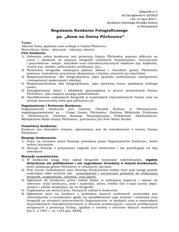 Załącznik nr 1 do Zarządzenia nr 10/2015 z dn. 21 lipca 2015 r. Dyrektora Gminnego Ośrodka Kultury w Pilchowicach Regulamin Konkursu Fotograficznego pn. „Zoom na Gminę Pilchowice” Temat: Aktywne formy spędzania czasu wolnego w Gminie Pilchowice. Słowa klucze: ludzie – aktywność – rekreacja, zdrowie. Cele konkursu: 1) Głównym celem konkursu jest promocja Gminy Pilchowice poprzez odkrycie na nowo i ukazanie za pomocą fotografii ciekawych krajobrazowo, turystycznie i przyrodniczo miejsc, zabytków oraz charakterystycznych obiektów (np. kapliczki, centra wsi, obiekty użyteczności publicznej, itp.). 2) Wykonana fotografia ukazująca piękno, klimat i charakter gminy Pilchowice powinna wywoływać pozytywne skojarzenia z Gminą, stanowić jej wizytówkę. 3) Rozpowszechnienie idei fotografowania, jako sposobu podniesienia umiejętności i kompetencji społeczności lokalnej. 4) Rozpowszechnienie idei fotografowania, jako aktywnej formy spędzania wolnego czasu; 5) Zaangażowanie dzieci i młodzieży gimnazjalnej w proces promowania Gminy Pilchowice, jako miejsca swojego zamieszkania; 6) Opublikowanie najlepszych fotografii w materiałach wizytówkowych Gminy oraz na stronie internetowej www.gok.pilchowice.pl. Organizatorzy i Partnerzy Konkursu: Organizatorem konkursu jest Gminny Ośrodek Kultury w Pilchowicach, współorganizatorami są – Urząd Gminy Pilchowice, Gminna Biblioteka Publiczna w Pilchowicach, Gminna Komisja Rozwiązywania Problemów Alkoholowych, Młodzieżowa Rada Gminy Pilchowice, partnerem jest Foto Sister Studio. Uczestnicy konkursu: Konkurs ma charakter otwarty, adresowany jest do mieszkańców z terenu Gminy Pilchowice. Komisja konkursowa: 1) Prace są oceniane przez Komisję powołaną przez Organizatorów konkursu, która wyłoni laureatów. 2) Decyzja Komisji o przyznaniu nagrody jest ostateczna i nie przysługuje od niej odwołanie. Warunki uczestnictwa: 1) W konkursie mogą brać udział fotografie wykonane indywidualnie, nigdzie dotychczas nie publikowane i nie nagradzane wcześniej w innych konkursach, które pokazują gminę Pilchowice w ciekawych ujęciach. 2) Przy ocenie nadesłanych prac Komisja Konkursowa będzie brać pod uwagę przede wszystkim takie kryteria jak: pomysłowość i artystyczne podejście do wykonanej fotografii, oryginalność, estetyka, oraz jakość. 3) Zgłoszone do konkursu prace należy złożyć w zaklejonej kopercie i opisać na odwrocie: tytuł konkursu, imię i nazwisko, adres, telefon lub e-mail autora zdjęć, miejsce i obiekt znajdujący się na fotografii. 4) Organizator nie zwraca prac, biorących udział w konkursie. 5) Zgłoszenie prac na konkurs z podaniem danych osobowych uczestnika jest równoznaczne z wyrażeniem zgody na opublikowanie jego imienia i nazwiska oraz fotografii na stronach internetowych Organizatorów, w mediach oraz w materiałach wizytówkowych charakterystycznych w albumie promocyjnym i innych publikacjach związanych z promocją Gminy, zgodnie z ustawą o ochronie danych osobowych (Dz.U. z 1997 r. nr 1333 poz. 8830). Załącznik nr 1 do Zarządzenia nr 10/2015 z dn. 21 lipca 2015 r. Dyrektora Gminnego Ośrodka Kultury w Pilchowicach 6) Osoby niepełnoletnie muszą dołączyć pisemną zgodę rodziców lub opiekunów na udział w konkursie. 7) W przypadku prac z wykorzystaniem wizerunku osób prywatnych, potrzebne będzie wraz ze zdjęciem oświadczenie, że osoby znajdujące się na zdjęciu wyrażają zgodę na ich publikację w materiałach i wydawnictwach pokonkursowych. 8) Zdjęcia należy dostarczyć w postaci elektronicznej (na płycie CD lub DVD). Należy dostarczyć fotografie w formacie - JPG lub TIFF, min. rozdzielczość 1900 x 2500, 300 DPI. Każda osoba biorąca udział w konkursie powinna dostarczyć jeden cykl zdjęć (min. 5 zdjęć, max. 10). 9) Udział w konkursie jest bezpłatny i całkowicie dobrowolny. 10) Warunkiem uczestnictwa w konkursie jest załączenie wraz ze zdjęciem wypełnionej „karty zgłoszenia do konkursu” oraz oświadczenia. Formularz karty zgłoszeniowej i oświadczenie są dostępne na stronie internetowej www.gok.pilchowice.pl oraz w Domu Kultury w Wilczy. Nie będą brane pod uwagę prace bez wymaganego oświadczenia i wypełnionej karty uczestnictwa. 11) Organizatorowi będą przysługiwały autorskie prawa majątkowe do wszystkich nadesłanych prac fotograficznych. Miejsce i termin nadsyłania prac 1) Fotografie należy przesyłać pocztą na adres Organizatora: Gminny Ośrodek Kultury w Pilchowicach, ul. K. Miarki 123, 44-189 Wilcza lub dostarczyć osobiście do siedziby Organizatora, z dopiskiem: Konkurs fotograficzny „Zoom na Gminę Pilchowice” w zamkniętej kopercie. 2) Termin składania prac: 22.07.2015 r. - 31.08.2015 r. Liczy się data stempla pocztowego lub potwierdzenia przyjęcia w Domu Kultury w Wilczy lub w Gminnej Bibliotece Publicznej w Pilchowicach. 3) Ogłoszenie wyników, wystawa prac i wręczenie nagród nastąpi 11.09.2015 r. Zostaną one również opublikowane na stronie internetowej Organizatora. Nagrody i wyróżnienia 1) W konkursie zostaną przyznane nagrody rzeczowe dla laureatów najciekawszych fotografii. Przewiduje się: a) I miejsce b) II miejsce c) III miejsce d) wyróżnienia e) nagroda specjalna Młodzieżowej Rady Gminy Pilchowice. 2) Termin i miejsce wręczenia nagród zostanie podany na stronie internetowej Gminnego Ośrodka Kultury w Pilchowicach, a z laureatami skontaktuje się Organizator. 3) Organizator zastrzega sobie prawo nie przyznania nagrody głównej, bez podania przyczyny lub dokonania innego podziału nagród. 4) Nagrodzone prace będą częścią ekspozycji w Domu Kultury w Wilczy. Postanowienia końcowe 1) Organizator zastrzega sobie prawo zaprzestania prowadzenia, zmiany lub przedłużenia konkursu w razie wystąpienia przyczyn od niego niezależnych. 2) Organizator zastrzega sobie prawo do bezpłatnego prezentowania i publikacji fotografii konkursowych w jego celach promocyjnych w p