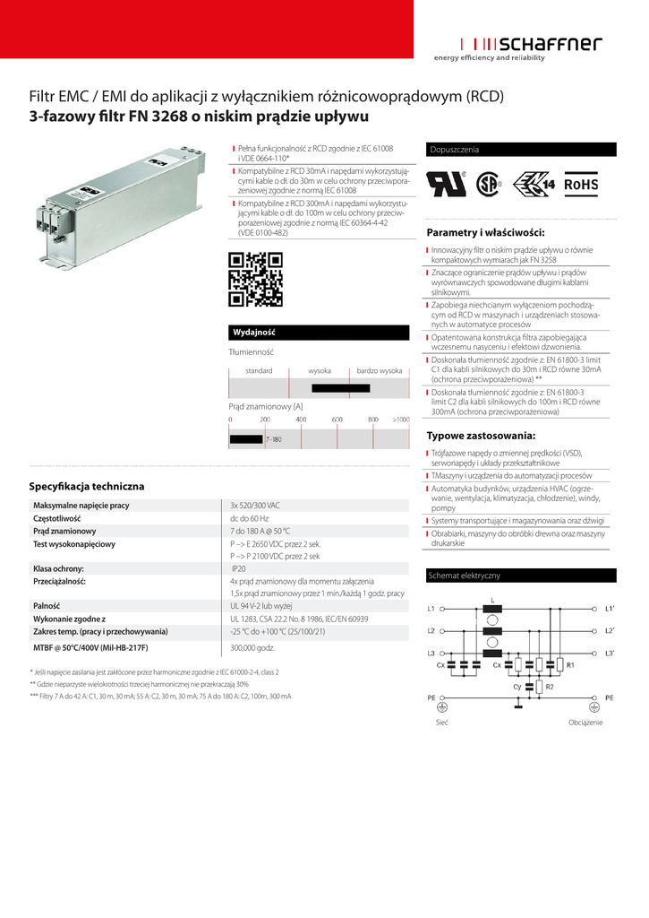 Filtr EMC / EMI do aplikacji z wyłącznikiem różnicowoprądowym (RCD) 3-fazowy filtr FN 3268 o niskim prądzie upływu ┃ P ełna funkcjonalność z RCD zgodnie z IEC 61008 i VDE 0664-110* ┃ K ompatybilne z RCD 30mA i napędami wykorzystującymi kable o dł. do 30m w celu ochrony przeciwporażeniowej zgodnie z normą IEC 61008 ┃ K ompatybilne z RCD 300mA i napędami wykorzystującymi kable o dł. do 100m w celu ochrony przeciwporażeniowej zgodnie z normą IEC 60364-4-42 (VDE 0100-482) Dopuszczenia Parametry i właściwości: ┃ Innowacyjny filtr o niskim prądzie upływu o równie kompaktowych wymiarach jak FN 3258 ┃ Znaczące ograniczenie prądów upływu i prądów ┃ Wydajność ┃ Tłumienność standard ┃ wysoka bardzo wysoka ┃ Prąd znamionowy [A] wyrównawczych spowodowane długimi kablami silnikowymi. Zapobiega niechcianym wyłączeniom pochodzącym od RCD w maszynach i urządzeniach stosowanych w automatyce procesów Opatentowana konstrukcja filtra zapobiegająca wczesnemu nasyceniu i efektowi dzwonienia. Doskonała tłumienność zgodnie z: EN 61800-3 limit C1 dla kabli silnikowych do 30m i RCD równe 30mA (ochrona przeciwporażeniowa) ** Doskonała tłumienność zgodnie z: EN 61800-3 limit C2 dla kabli silnikowych do 100m i RCD równe 300mA (ochrona przeciwporażeniowa) Typowe zastosowania: ┃ Trójfazowe napędy o zmiennej prędkości (VSD), serwonapędy i układy przekształtnikowe ┃ TMaszyny i urządzenia do automatyzacji procesów Specyfikacja techniczna Maksymalne napięcie pracy Częstotliwość Prąd znamionowy Test wysokonapięciowy ┃ Automatyka budynków, urządzenia HVAC (ogrze- Palność Wykonanie zgodne z Zakres temp. (pracy i przechowywania) 3x 520/300 VAC dc do 60 Hz 7 do 180 A @ 50 °C P –> E 2650 VDC przez 2 sek. P –> P 2100 VDC przez 2 sek IP20 4x prąd znamionowy dla momentu załączenia 1,5x prąd znamionowy przez 1 min./każdą 1 godz. pracy UL 94 V-2 lub wyżej UL 1283, CSA 22.2 No. 8 1986, IEC/EN 60939 -25 °C do +100 °C (25/100/21) MTBF @ 50°C/400V (Mil-HB-217F) 300,000 godz. Klasa ochrony: Przeciążalność: wanie, wentylacja, klimatyzacja, chłodzenie), windy, pompy ┃ Systemy transportujące i magazynowania oraz dźwigi ┃ Obrabiarki, maszyny do obróbki drewna oraz maszyny drukarskie Schemat elektryczny Schemat elektryczny * Jeśli napięcie zasilania jest zakłócone przez harmoniczne zgodnie z IEC 61000-2-4, class 2 ** Gdzie nieparzyste wielokrotności trzeciej harmonicznej nie przekraczają 30% *** Filtry 7 A do 42 A: C1, 30 m, 30 mA; 55 A: C2, 30 m, 30 mA; 75 A do 180 A: C2, 100m, 300 mA Sieć Obciążenie 2 Tabela wyboru Filter Filtr Rated current Prąd znamionowy Typical drive Moc napędu* Leakage Prądcurrent** upływu** Powermocy loss Straty Input/Output Złącza @ 50 °C (40 °C) power rating* @ 400 VAC/50 Hz @ 25 °C/50 Hz connections Weight Waga [A] [kW] [mA] [W] 7 (7.7) 4 4.5 4.5 -44 0.5 FN 3268-16-44 16 (17.5) 7.5 4.7 6.1 -44 0.8 FN 3268-30-33 30 (32.9) 18.5 4.6 13.5 -33 1.2 FN 3268-42-33 42 (46.0) 22 4.6 17.4 -33 1.4 FN 3268-55-34 55 (60.2) 37 4.7 18.1 -34 2.2 FN 3268-75-34 75 (82.2) 45 7.8 25.3 -34 2.9 FN 3268-100-35 100 (109.5) 55 20.5 30.0 -35 4.1 FN 3268-130-35 130 (142.4) 75 30.4 38.0 -35 4.6 FN 3268-180-40 180 (197.1) 110 37.0 48.6 -40 6.0 FN 3268-7-44 [kg] *Obliczono przy znamionowym, VAC i cosφ= zależy od upon wydajności napędu, samego silnikathe orazmotor na całejand aplikacji. * Calculated at prądzie rated current, 440 VAC440 and cos phi = 0,8. 0.8.Dokładna The exactwartość value depends the efficiency of the drive, the entire application. ** Maximum leakage under normal operating conditions. Note: if two phases are interrupted, worst case leakage could reach 5.4 **Maksymalny prąd upływu w znamionowych warunkach pracy, w najgorszym przypadku (przerwanie dwóch faz) może wzrosnąć 5.4 razy. times higher levels. Tłumienność wtrąceniowa Wg. Per CISPR 17; A = 50 Ω/50 Ω sym; B = 50 Ω/50 Ω asym; C = 0.1 Ω/100 Ω sym; D = 100 Ω/0.1 Ω sym typ 7 do 42 A typ 55 do 100 A typ 130 i 180 A Instalacja ┃ EMC / EMI filtr FN 3268 Typowa instalacja z RCD, filtrem EMC/EMI i silnikiem ┃ RCD Należy pamiętać, że w przypadku urządzeń elektrycznych z 6-pulsowymi mostkami prostowniczymi na wejściu, takich jak napędy z silnikami trójfazowymi, wymagane są RCD typu B lub B +. RCD z opóźnieniem są potrzebne, aby zapobiec niepożądanym wyłączeniom spowodowanym impulsami napięcia. RCD typu B z opóźnieniem mają często dodaną literę „S” lub „K”, należy skonsultować się z dostawcą w celu dobrania odpowiedniego typu. Uwaga: Należy zweryfikować kompatybilność całego systemu z wybranym RCD aby zagwarantować pełną funkcjonalność. Filtry od 7 do 55 A, są kompatybilne z RCD do 30mA zgodnie z normą IEC 61008 i VDE 0664-110. Filtry od 75 do 180 A są kompatybilne z RCD 300mA. Należy zainstalować filtr możliwie jak najbliżej napędu od strony sieci. W celu prawidłowej instalacji zgodnej z wymogami EMC, należy zapoznać się również z instrukcją dostawcy napędu. ┃ Napęd Proszę ustawić wzór impulsów PWM dla napędów o zmiennej prędkości na 4 kHz. Inne ustawienie może powodować wyższe prądy upływu. Na życzenie możliwe jest wykonanie filtrów pozwalających na ustawienie inne niż 4 kHz. ┃ Przewody silnikowe Długość kabli nie powinna przekraczać 30 metrów przy zastosowaniu filtrów od 7A do 55A aby spełnić wymagania klasy C1 wg. EN 61800-3. Przy zastosowaniu filtrów o prądzie od 75A do 180A, długość przewodów nie powinna przekraczać 100 metrów aby spełnić wymagania klasy C2. ┃ W ewnętrzne elementy EMC/EMI Należy odłączyć wszystkie kondensatory Y w filtrach EMC/EMI w napędzie, ponieważ kondensatory te powodują większe prądy upływu. ┃ H armoniczne w sieci Wysokie harmoniczne mogą powodować dodatkowe prądy upływu. Filtry FN 3268 są testowane w następujących warunkach: Napięcie zasilające jest zakłóco