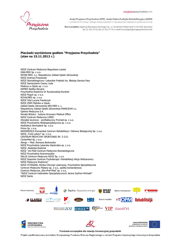 Placówki wyróżnione godłem "Przyjazna Przychodnia" (stan na 15.11.2012 r.) NZOZ Centrum Medyczne Bogusława Lasota DAN-MED Sp. z o.o. INTER-MED. s.c. Niepubliczny Zakład Opieki Zdrowotnej NZOZ Andrzej Proszewski NZOZ Stomatologiczne i Lekarskie Praktyki św. Błażeja Danuta Pasz NZOZ Samarytanin Cezary Juda Medicus w Opolu sp. z o.o. KAMED Spółka Akcyjna Przychodnia Rodzinna Dr Ryczkowskiej-Kurdziel NZOZ Pogoń sp. z o.o. ROYALMED sp. z o.o. NZOZ Vital Lucyna Pawlaczyk NZOZ ZWM Malinka w Opolu Zakład Opieki Zdrowotnej ARS-MED s. c. Niepubliczny Zakład Opieki Zdrowotnej PANACEUM s.c. Optima Medycyna S.A. Renata Blukacz Justyna Grzywacz Medical Office NZOZ Centrum Medyczne LiMED Ośrodek leczniczo - profilaktyczny Promed sp. z o.o. NZOZ Przychodnia Wielospecjalistyczna sp. z o.o. Aesthetica Dermadent Sp. z.o.o. Primo Sp. z o.o. KRIOMEDICA Poznańskie Centrum Rehabilitacji i Odnowy Biologicznej Sp. z o.o. NZOZ „Twój Lekarz” sp. z o.o. CENTRUM MEDYCYNY SPORTOWEJ SP. Z O.O. CenterMed Sp. z o.o. Alergo – Med. Romana Borkowska NZOZ Przychodnia Lekarska Hipokrates sp. z o.o. NZOZ „Nadzieja Rodzinie NZOZ Uni-Med Centrum Medyczno-Stomatologiczne NZOZ Przychodnia Kosmonautów SALUS Centrum Medyczne NZOZ Sp. z o.o NZOZ Sopockie Centrum Fizykoterapii i Rehabilitacji Alicja Welizarowicz NZOZ Medycyna Rodzinna” NZOZ VITASANA, Klinika Chirurgii Laserowej, Przychodnia Specjalistyczna Centrum Medyczne Platany sp. z o.o., spółka komandytowa Centrum Medyczne „Eko-Prof-Med” sp. z o.o. "NZOZ Centrum Gabinetów Specjalistycznych Janina Szafron-Michalik" NZOZ Sante NZOZ BI-MED Grazyna Bichalska NZOZ Artvimed – Chrobry NZOZ Zespół Medyczno-Opiekuńczy Alicja Kluczna Niepubliczny Zakład Opieki Zdrowotnej „VITAMED” Sp. z o.o. Niepubliczny Zakład Opieki Zdrowotnej „helpmed” ZPChr im. dr med. Tadeusza Boczonia Niepubliczny Zakład Opieki Zdrowotnej Centrum Rehabilitacji i Fizykoterapii Niepubliczny Zakład Opieki Zdrowotnej Leszczyńskie Centrum Medyczne „Ventriculus” Sp. z o.o. Niepubliczny Zakład Opieki Zdrowotnej "Medyk" sp. z o.o. "Radix s.c. Ewa i Krzysztof Wyrembelscy 60-143 Poznań " Niepubliczny Zakład Opiei Zdrowotnej ADO-MED 2 Roman Elias NZOZ Konsyliarz Mirosław Moskalewicz Ośrodek Psychoterapii i Szkoleń "Pracowania" mgr Monika Zbisławska Niepuliczny Zakład Opieki Zdrowotnej Poradnia Psychiatryczno - Psychologiczna Katharsis s.c Niepubliczny Zakład Opieki Zdrowotnej Centrum Medyczne ROKITEK sp. z o.o. Centrum Medyczne MEDICOR Tadeusz Mazurek Niepubliczny Zakład Opieki Zdrowotnej "MEDICUS" s.c. Maurycu Jakubiec, Urszula Jakubiec MED.MANAGER sp. z o.o. Komplet Przychodnia Stomatologiczna Jakub Sobański CenterMed Lublin sp. z o.o. PRZYCHODNIA LEKARSKA „POŁUDNIE” SP. Z O.O. Centrum Diagnostyki Medycznej MULTI-MED Hanna Brusikiewicz i spółka – spółka jawna Adax-Med s.c., Katarzyna Wrotek, Joanna Tylżanowska-Kisiel JCM Sp. z o.o. Centrum Medyczne Szpital św. Rodziny sp. z o.o. "Logo-Med Specjalistyczny Ośrodek Diagnozy i Rehabilitacji Dzieci i Młodzieży z Wadą Słuchu s.c. Danuta Olczykowska, Helena Olczykowska" Niepubliczny Zakład Opieki Zdrowotnej DIAGMED sp. z o.o. Medicus Dolnośląskie Centrum Laryngologii spółka z o.o., spółka komandytowo - akcyjna Niepubliczny Zakład Opieki Zdrowotnej Centrum Usług Medycznych Proximum Sp. z o.o. HELIMED Diagnostic Imaging Sp.z o. Sp. komandytowa Przychodnia Specjalistyczna Regina i Walenty Śliwa S.J TFE J.M. Dymkowscy Sp.j. prowadząca przedsiębiorstwo lecznicze NZOZ PRO FAMILIA NZOZ Specjalistyczne Centrum Medyczne lek. Dariusz Wojciech Konior Niepubliczny Zakład Podstawowej i Specjalistycznej Opieki Zdrowotnej "KOL-med" s.c. Urszula Górna, Hanna Włodarczyk Zakład Opieki Medycznej "CER-MEDIC" sp. z o.o. KardioMedical - Poradnie Kardiologiczne sp. z o.o. NZOZ Praktyka Lekarza Rodzinnego Jan Wolańczyk Spektrum sp. z o.o. Centrum Medyczne Puławska sp. z o.o. NZOZ Przychodnia Nowy Dwór sp. z o.o. ARTIMED Niepubliczny Zakład Opieki Zdrowotnej sp. z o.o. Niepubliczny Specjalistyczny Zakład Opieki Zdrowotnej Optimmed Blanka Skrzypkowska-Brancewicz Niepubliczny Zakład Opieki Zdrowotnej ETER-MED sp. z o.o. Centrum Medyczne Promedica NZOZ s.c. Piotr Compała, Halina Compała-Kuśnierz Niepubliczny Zakład Opieki Zdrowotnej „Promed” Sp. z o.o. Prywatna Lecznica Certus Sp. z o.o. P. W. Medina Sp. z o.o. Lekarze Rodzinni ESKULAP Sp. z o.o. Niepubliczny Zakład Rehabilitacji Leczniczej Centrum Rehabilitacji lek. Med. Urszula Hura Marek Sewastianik ABM Rehabilitacja Kuklińska Katarzyna NZOZ Poradnia Rehabilitacji Leczniczej ,,KINETICA’’ Indywidualna Specjalistyczna Praktyka Lekarska dr n. med. Bogusław Kompf NZOZ MEDREM-POLIKLINIKA SPÓŁKA Open Medical Magdalena Soszyńska Niepubliczny Zakład Opieki Zdrowotnej ZBM Zdrowie S.C Niepublicznym Zakładem Opieki Zdrowotnej Anident NZOZ Gabinet Ortodontyczny „Orthos” DENTIS sp. z o.o. Jurajskie Centrum Medyczne Sobas S. J. Barbara Rokicka-Łapuć Specjalistyczny Zakład Opieki Medycznej Familia Medica Przychodnia Stomatologiczna Estima Jacek Iracki Dorota Czuba Zembrzuska DORMED centrum Zdrowia Rodziny Przychodnia Specjalistyczna STOMED Tomasz Nowak "ZDROWIE" P. Dembiński spółka jawna EB Group sp. z o.o. SPORT MEDICA S.A. Kor-Med. s.c. Grażyna Kornecka-Mucha, Marek Mucha, Andrzej Kornecki, Maria Kornecka CENTRUM LECZENIA NERWIC I INNYCH ZABURZEŃ PSYCHICZNYCH Piotr Domaradzki „KLINIKA KRAKOWSKA” - Przychodnia Specjalistyczna Sp. Z o.o. Niepubliczny Zakład Opieki Zdrowotnej „Fizjoterapia” Zakład Rehabilitacji Medycznej Ruchowej i Medycyny Fizykalnej s.c. Niepubliczny Zakład Opieki Zdrowotnej Centrum Pediatryczno-Internistycznym Sp. z o.o. Niepubliczny Zakład Opieki zdrowotnej „Przychodnia Morena” Sp. z o.o. Centrum Nadzoru Kardiologicznego KARDIOFON Sp. z o. o. DietoCentrum Jadwiga Skierska Niepubliczny Zakład Opieki Zdrowotnej Euro-Med Sp. z. o. o LIFT-MED II sp. z o.o. NZOZ „SKOMED” Józef i Łukasz Skorupski 
