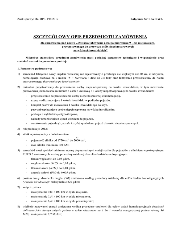 Załącznik Nr 1 do SIWZ Znak sprawy: Dz. DPS. 198.2012 SZCZEGÓŁOWY OPIS PRZEDMIOTU ZAMÓWIENIA dla zamówienia pod nazwą „Dostawa fabrycznie nowego mikrobusu 9 - cio miejscowego, przystosowanego do przewozu osób niepełnosprawnych na wózkach inwalidzkich" Mikrobus stanowiący przedmiot zamówienia musi posiadać parametry techniczne i wyposażenie oraz spełniać warunki wymienione poniżej: 1. Parametry podstawowe: 1) samochód fabryczne nowy, nigdzie wcześniej nie rejestrowany o przebiegu nie większym niż 50 km, z fabryczną homologacją osobową na 9 miejsc (8 + kierowca) i dmc do 3,5 tony oraz fabrycznie przystosowany do ruchu prawostronnego (kierownica po lewej stronie); 2) mikrobus przystosowany do przewożenia osoby niepełnosprawnej na wózku inwalidzkim, w tym możliwość przewożenia jednocześnie minimum 6 osób z kierowcą + 1 osoby niepełnosprawnej na wózku inwalidzkim: - przystosowanie do przewiezienia osoby niepełnosprawnej z homologacją, - szyny wzdłuż mocujące 1 wózek inwalidzki w podłodze pojazdu, - komplet pasów do mocowania 1 wózka inwalidzkiego do szyn, - pasy zabezpieczające osobę niepełnosprawną na wózku inwalidzkim, - podłoga z wykładziną antypoślizgową, - najazdy umożliwiające wjazd wózkiem do pojazdu, - oznakowanie pojazdu (z przodu i z tyłu) symbolem: pojazd dla osób niepełnosprawnych; 3) rok produkcji: 2012; 4) silnik wysokoprężny z doładowaniem: 33 - pojemność silnika od 1750 cm3 do 2000 cm3, - moc silnika minimum 100 KM; 5) samochód musi spełniać minimum normę dopuszczalnych emisji spalin dla pojazdów z silnikiem wysokoprężnym EURO 5 zmierzonych według procedury ustalonej dla celów badań homologacyjnych: - tlenku węgla (CO) do 0,05 g/km, - węglowodorów ( H C ) do 0,05 g/km, - tlenków azotu ( NOx ) do 0,18 g/km, - cząstek stałych (PM) do 0,005 g/km; 6) poziom emisji dwutlenku węgla (CO2) zmierzona według procedury ustalonej dla celów badań homologacyjnych (wartość uśredniona): maksymalnie 220 g/km; 7) zużycie paliwa: - maksymalnie 9,8 l / 100 km w cyklu miejskim, - maksymalnie 7,5 l / 100 km w cyklu mieszanym, - maksymalnie 6,4 l / 100 km w cyklu pozamiejskim; 8) wielkość zużywanej energii zmierzona według procedury ustalonej dla celów badań homologacyjnych (wielkość obliczona jako iloczyn zużycia paliwa w cyklu mieszanym na 1 km i wartości energetycznej paliwa równej 36 MJ/l): maksymalnie 2,7 MJ/km; 9) nadwozie: - liczba miejsc (siedzących): 9 (8 + kierowca), - siedzenia w części pasażerskiej szybko demontowane, - drzwi boczne (do części pasażerskiej) prawe przesuwne, - stopień wejściowy drzwi bocznych wewnątrz z oświetleniem, - Drzwi tylne dwuskrzydłowe, - Drzwi tylne z wycieraczką szyby i spryskiwaczem, - wszystkie szyby atermiczne (termoizolacyjne), - fabrycznie montowana pełna tapicerka części pasażerskiej i bagażowej (komfortowe wyłożenie wewnątrz ścian bocznych i dachu), - kolor lakieru jasny metalik (srebrny, beżowy, popielaty); 10) wymiary samochodu: - wysokość zewnętrzna: maksimum 2 000 mm, - długość zewnętrzna: minimum 5 150 mm, - szerokość zewnętrzna (bez lusterek): minimum 1 800 mm, - rozstaw osi minimum 3 300 mm, - długość części pasażerskiej wraz z częścią bagażową: minimum 2 800 mm, (mierzona po podłodze) - maksymalna szerokość części pasażerskiej: minimum 1 600 mm, - długość części bagażowej za ostatnim rzędem siedzeń: minimum 1 000 mm; 11) ogumienie letnie na felgach stalowych minimum 16 cali + kołpaki z logo producenta samochodu (oryginalne) plus 4 opony zimowe; 12) skrzynia biegów: manualna minimum 5-cio biegowa (5 + 1), mechaniczna; 13) sprzęgło jednotarczowe suche; 14) napęd na koła przednie; 15) układ hamulcowy tarczowy wentylowany z przodu oraz tarczowy wentylowany z tyłu; 16) niezależne zawieszenie przód i tył. 2. Wyposażenie: 1) system zapobiegający blokowaniu kół podczas hamowania; 2) system zapobiegający poślizgowi kół napędzanych podczas hamowania silnikiem; 3) elektroniczny system stabilizacji toru jazdy z asystentem hamowania; 4) elektroniczna blokada mechanizmu różnicowego zapobiegająca poślizgowi napędzanego koła tracącego przyczepność podczas ruszania; 5) system zapobiegający poślizgowi kół przekazywanego przez silnik w czasie jazdy; napędzanych poprzez zmniejszenie momentu obrotowego 6) wspomaganie układu kierowniczego; 7) kolumna kierownicza z możliwością regulacji ustawień w dwóch płaszczyznach; 8) poduszki powietrzne przednie dla kierowcy i pasażera/ów (zależnie od ilości przednich foteli); 9) fotel kierowcy z regulacją wysokości oraz regulacją podparcia odcinka lędźwiowego; 10) wszystkie siedzenia wyposażone w pasy bezpieczeństwa i zagłówki z regulacją wysokości; 11) uchwyty do mocowania ładunku w części pasażerskiej + bagażowej: minimum 4 szt.; 12) schowek na pasy do mocowania wózka inwalidzkiego; 13) fabrycznie zamontowana klimatyzacja z minimum półautomatyczną regulacją, z nawiewem w kabinie kierowcy i przewietrzaniem przestrzeni pasażerskiej poprzez nawiew powietrza w przestrzeni pasażerskiej kanałami wentylacyjnymi; 14) listwy w podsufitce części pasażerskiej z oświetleniem; 15) drugi wymiennik ciepła umieszczony z tyłu, ogrzewanie przestrzeni pasażerskiej; 16) elektrycznie opuszczane i podnoszone szyby w kabinie kierowcy; 17) elektrycznie sterowane i ogrzewane lusterka zewnętrzne; 18) automatycznie przyciemniane wewnętrzne lusterko wsteczne; 19) fabrycznie zamontowany centralny zamek sterowany drogą radiową (na pilota); 20) fabrycznie zamontowany autoalarm; 21) fabrycznie zamontowana blokada uruchomienia (immobiliser); 22) radioodbiornik z odtwarzaczem CD MP3 oraz zamontowana antena radiowa i głośniki; 23) zamontowany system/zestaw głośnomówiący; 24) fabrycznie zamontowane światła do jazdy dziennej; 25) fabrycznie zamontowane trzecie światło „STOP"; 26) fabrycznie zamontowany czujnik deszcz