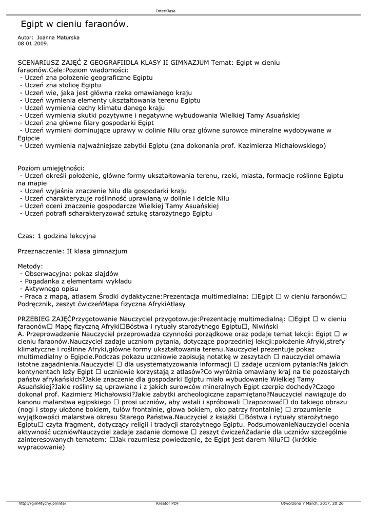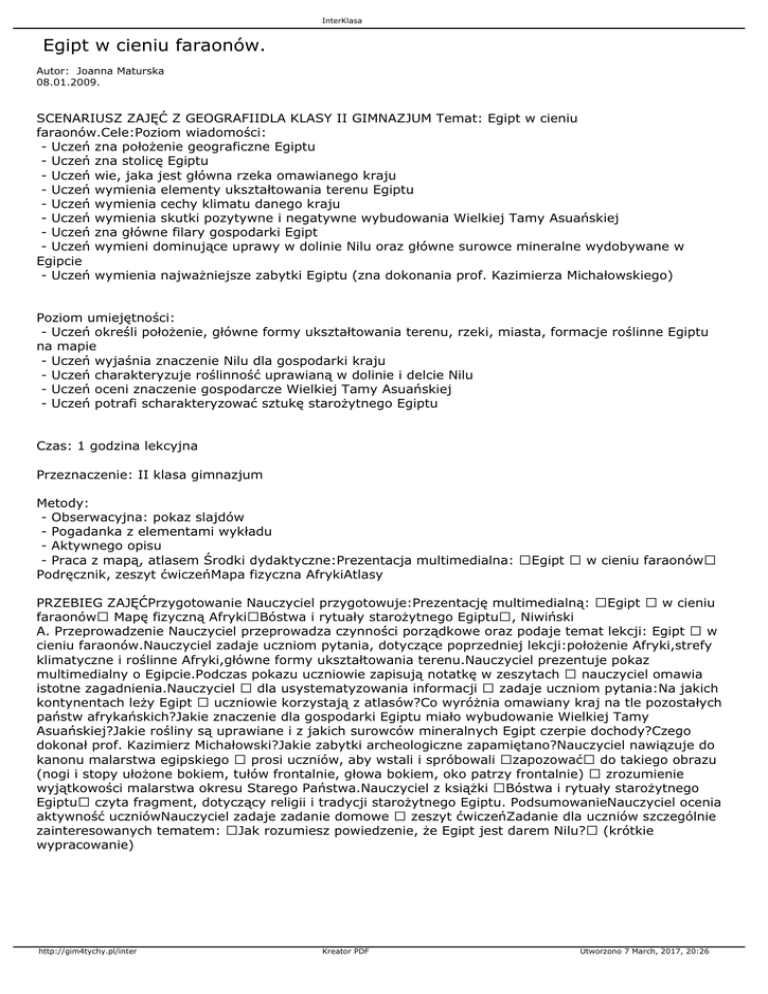 InterKlasa Egipt w cieniu faraonów. Autor: Joanna Maturska 08.01.2009. SCENARIUSZ ZAJĘĆ Z GEOGRAFIIDLA KLASY II GIMNAZJUM Temat: Egipt w cieniu faraonów.Cele:Poziom wiadomości: - Uczeń zna położenie geograficzne Egiptu - Uczeń zna stolicę Egiptu - Uczeń wie, jaka jest główna rzeka omawianego kraju - Uczeń wymienia elementy ukształtowania terenu Egiptu - Uczeń wymienia cechy klimatu danego kraju - Uczeń wymienia skutki pozytywne i negatywne wybudowania Wielkiej Tamy Asuańskiej - Uczeń zna główne filary gospodarki Egipt - Uczeń wymieni dominujące uprawy w dolinie Nilu oraz główne surowce mineralne wydobywane w Egipcie - Uczeń wymienia najważniejsze zabytki Egiptu (zna dokonania prof. Kazimierza Michałowskiego) Poziom umiejętności: - Uczeń określi położenie, główne formy ukształtowania terenu, rzeki, miasta, formacje roślinne Egiptu na mapie - Uczeń wyjaśnia znaczenie Nilu dla gospodarki kraju - Uczeń charakteryzuje roślinność uprawianą w dolinie i delcie Nilu - Uczeń oceni znaczenie gospodarcze Wielkiej Tamy Asuańskiej - Uczeń potrafi scharakteryzować sztukę starożytnego Egiptu Czas: 1 godzina lekcyjna Przeznaczenie: II klasa gimnazjum Metody: - Obserwacyjna: pokaz slajdów - Pogadanka z elementami wykładu - Aktywnego opisu - Praca z mapą, atlasem Środki dydaktyczne:Prezentacja multimedialna: Egipt w cieniu faraonów Podręcznik, zeszyt ćwiczeńMapa fizyczna AfrykiAtlasy PRZEBIEG ZAJĘĆPrzygotowanie Nauczyciel przygotowuje:Prezentację multimedialną: Egipt w cieniu faraonów Mapę fizyczną AfrykiBóstwa i rytuały starożytnego Egiptu, Niwiński A. Przeprowadzenie Nauczyciel przeprowadza czynności porządkowe oraz podaje temat lekcji: Egipt w cieniu faraonów.Nauczyciel zadaje uczniom pytania, dotyczące poprzedniej lekcji:położenie Afryki,strefy klimatyczne i roślinne Afryki,główne formy ukształtowania terenu.Nauczyciel prezentuje pokaz multimedialny o Egipcie.Podczas pokazu uczniowie zapisują notatkę w zeszytach nauczyciel omawia istotne zagadnienia.Nauczyciel dla usystematyzowania informacji zadaje uczniom pytania:Na jakich kontynentach leży Egipt uczniowie korzystają z atlasów?Co wyróżnia omawiany kraj na tle pozostałych państw afrykańskich?Jakie znaczenie dla gospodarki Egiptu miało wybudowanie Wielkiej Tamy Asuańskiej?Jakie rośliny są uprawiane i z jakich surowców mineralnych Egipt czerpie dochody?Czego dokonał prof. Kazimierz Michałowski?Jakie zabytki archeologiczne zapamiętano?Nauczyciel nawiązuje do kanonu malarstwa egipskiego prosi uczniów, aby wstali i spróbowali zapozować do takiego obrazu (nogi i stopy ułożone bokiem, tułów frontalnie, głowa bokiem, oko patrzy frontalnie) zrozumienie wyjątkowości malarstwa okresu Starego Państwa.Nauczyciel z książki Bóstwa i rytuały starożytnego Egiptu czyta fragment, dotyczący religii i tradycji starożytnego Egiptu. PodsumowanieNauczyciel ocenia aktywność uczniówNauczyciel zadaje zadanie domowe zeszyt ćwiczeńZadanie dla uczniów szczególnie zainteresowanych tematem: Jak rozumiesz powiedzenie, że Egipt jest darem Nilu? (krótkie wypracowanie) http://gim4tychy.pl/inter Kreator PDF Utworzono 7 March, 2017, 20:26