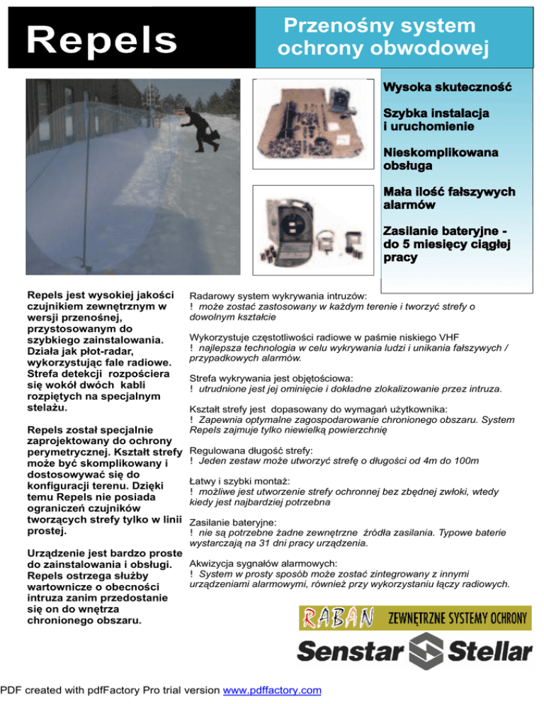 Przenośny system ochrony obwodowej Repels jest wysokiej jakości czujnikiem zewnętrznym w wersji przenośnej, przystosowanym do szybkiego zainstalowania. Działa jak płot-radar, wykorzystując fale radiowe. Strefa detekcji rozpościera się wokół dwóch kabli rozpiętych na specjalnym stelażu. Repels został specjalnie zaprojektowany do ochrony perymetrycznej. Kształt strefy może być skomplikowany i dostosowywać się do konfiguracji terenu. Dzięki temu Repels nie posiada ograniczeń czujników tworzących strefy tylko w linii prostej. Radarowy system wykrywania intruzów: ! może zostać zastosowany w każdym terenie i tworzyć strefy o dowolnym kształcie Wykorzystuje częstotliwości radiowe w paśmie niskiego VHF ! najlepsza technologia w celu wykrywania ludzi i unikania fałszywych / przypadkowych alarmów. Strefa wykrywania jest objętościowa: ! utrudnione jest jej ominięcie i dokładne zlokalizowanie przez intruza. Kształt strefy jest dopasowany do wymagań użytkownika: ! Zapewnia optymalne zagospodarowanie chronionego obszaru. System Repels zajmuje tylko niewielką powierzchnię Regulowana długość strefy: ! Jeden zestaw może utworzyć strefę o długości od 4m do 100m Łatwy i szybki montaż: ! możliwe jest utworzenie strefy ochronnej bez zbędnej zwłoki, wtedy kiedy jest najbardziej potrzebna Zasilanie bateryjne: ! nie są potrzebne żadne zewnętrzne źródła zasilania. Typowe baterie wystarczają na 31 dni pracy urządzenia. Urządzenie jest bardzo proste Akwizycja sygnałów alarmowych: do zainstalowania i obsługi. ! System w prosty sposób może zostać zintegrowany z innymi Repels ostrzega służby urządzeniami alarmowymi, również przy wykorzystaniu łączy radiowych. wartownicze o obecności intruza zanim przedostanie się on do wnętrza chronionego obszaru. PDF created with pdfFactory Pro trial version www.pdffactory.com Repels Przenośny system ochrony obwodowej ZASTOSOWANIE Repels znajduje zastosowanie przy ochronie: ! instalacji militarnych (stanowisk broni artyleryjskiej, wyrzutni pocisków rakietowych, składów amunicji) ! zaparkowanych pojazdów, samolotów, helikopterów ! tymczasowych Specyfikacja Przełaczniki: Składniki: Jednostka sterująca oraz bęben z kablami w jednej obudowie, nadajnik, odbiornik, zestaw prętów do wykonania stelażu z odciągami i młotkiem (lub opcjonalnie zestaw prętów z akcesoriami do montażu na twardej powierzchni), instrukcja, dwie torby do transportu. Długość strefy: Dowolna w granicach od 4 do 100m. Można łączyć systemy w celu ochrony większego obszaru. rezydencji VIP-ów Przekrój strefy: ! składowanych kontenerów ! obiektów w budowie ! urządzeń telekomunikacyjnych Szerokość około 2m wysokość około 2m. Sprawność: Prawdopodobieństwo wykrycia intruza <0,96 , odporność na zakłócenia wywołane obecnością małych zwierząt i zmiennymi warunkami atmosferycznymi Zasilanie: Zasilanie/reset Przełącznik czułości na sterowniku. Zasilanie/test baterii na nadajniku. Wskaźniki: 3 diody LED na sterowniku (intruz, uszkodzenie/sabotaż, słabe baterie), 1 dioda na nadajniku -test baterii Przekaźniki alarmowe: Typ NC i NO 30Vst, 1A. Osobne przekaźniki dla sygnalizacji wtargnięcia intruza i stanu czujnika (sabotaż). Wymiary i waga: Zapakowany sterownik z kablami: 41cm x 43cm x 18cm, 8kg. Stelaż do montażu w gruncie miękkim: 173cm x 25cm x 25cm, 12kg Stelaż do montażu na twardym podłożu: 128cm x 44cm x 19cm, 60kg Temperatura pracy: -40st C do +68st C. Baterie alkaliczne R20 Sterownik 5 bat., nadajnik 2 bat. Baterie dobrej jakości wystarczają na 5 miesięcy ciągłej pracy sterownika i 15 miesięcy nadajnika (przy 20st C) NATO Stock No.: 6350-21-910-3976 (zestaw A) 6350-21-910-3977 (zestaw B) 6350-21-910-3978 (zestaw C) (zestawy różnią się pasmem VHF) RABAN P.H.U. 67-558 Poznań Ul.. Wierzbięcice 37A/6 ISO 9002 CGSB 95711 TEL./FAX: +48 61 833-1999, TEL.: +48 61 833-1675, e-mail: [email protected] www.raban.com.pl PDF created with pdfFactory Pro trial version www.pdffactory.com Senstar-Stellar is represented by dealers in over 75 countries.