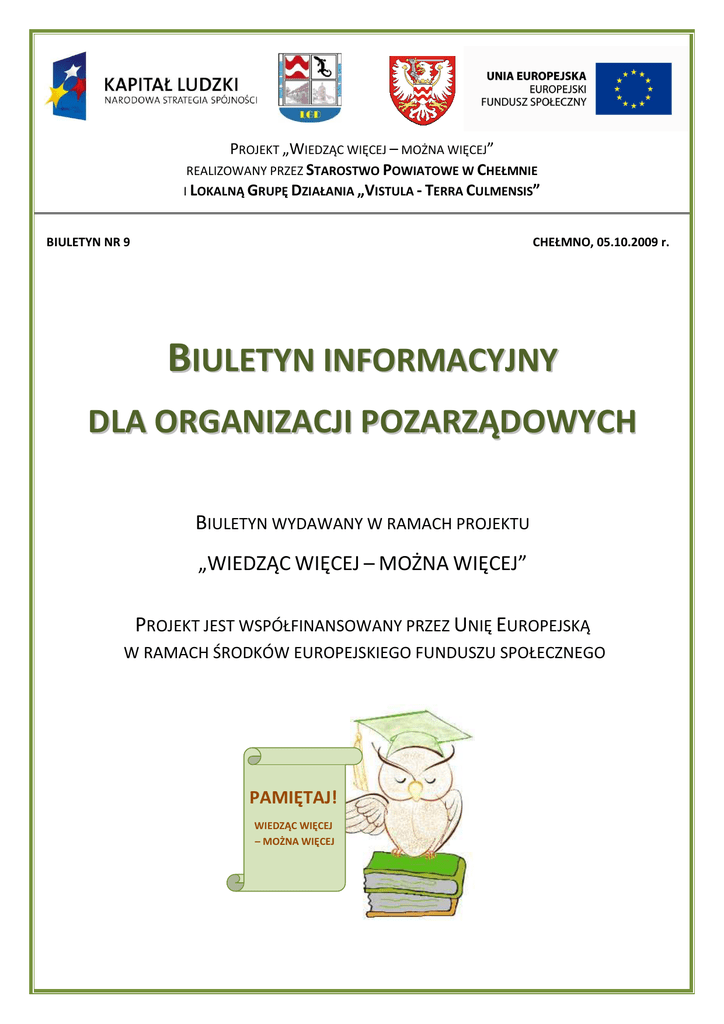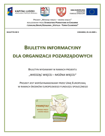 PROJEKT „WIEDZĄC WIĘCEJ – MOŻNA WIĘCEJ” REALIZOWANY PRZEZ STAROSTWO POWIATOWE W CHEŁMNIE I LOKALNĄ GRUPĘ DZIAŁANIA „VISTULA - TERRA CULMENSIS” BIULETYN NR 9 CHEŁMNO, 05.10.2009 r. BIULETYN INFORMACYJNY DLA ORGANIZACJI POZARZĄDOWYCH BIULETYN WYDAWANY W RAMACH PROJEKTU „WIEDZĄC WIĘCEJ – MOŻNA WIĘCEJ” PROJEKT JEST WSPÓŁFINANSOWANY PRZEZ UNIĘ EUROPEJSKĄ W RAMACH ŚRODKÓW EUROPEJSKIEGO FUNDUSZU SPOŁECZNEGO PAMIĘTAJ! WIEDZĄC WIĘCEJ – MOŻNA WIĘCEJ BIULETYN INFORMACYJNY DLA ORGANIZACJI POZARZĄDOWYCH WYDAWANY W RAMACH PROJEKTU „WIEDZĄC WIĘCEJ – MOŻNA WIĘCEJ” Projekt w realizacji: „Wiedząc Wiedząc więcej – można więcej” II tura szkoleń W ramach projektu „Wiedząc więcej – można więcej” współfinansowanego ze środków Europejskiego Funduszu Społecznego, realizowanego przez Lokalną Grupę Działania „Vistula-Terra „Vistula Culmensis-Rozwój Rozwój przez Tradycję” wspólnie z Partnerem – Powiat Chełmno w ramach Priorytetu IX Rozwój wykształcenia i komkom petencji w regionach, Działania 9.5. „Oddolne inicjatywy edukacyjne kacyjne na obszarach wiejskich” Operacyjnego Kapitał Programu Ludzki rozpoczęło się przeprowadzenie drugiego z zaplanowanych szkoleń z zakresu księgowości i rozliczania dotacji. Szkolenia rozpoczęły się 17 września br. i potrwają do 9 października tego roku. Celem szkoleń uczestników jest przeszkolenie projektu z zakresu pozyskiwania środków dla organizacji pozarządowych, rozliczania dotacji ze środków publicznych, zarządzania finansami w organizacji, księgowości i zatrudnieniaa w organizacji. Zajęcia prowadzone są w godzinach popołudniowych. Głównymi metoda-mi pracy z uczestnikami będą metody aktywizujące, Strona 2 BIULETYN INFORMACYJNY DLA ORGANIZACJI POZARZĄDOWYCH WYDAWANY W RAMACH PROJEKTU „WIEDZĄC WIĘCEJ – MOŻNA WIĘCEJ” takie jak: praktyczne rozwiązy rozwiązywanie ćwiczenia – grupowe problemów, wykonywanie zadań wskazanych przez prowadząprowadzą cego szkolenia, wykonywanie zadań wskaz wskazanych prowadzącego przez szkolenia, dyskusja, w której uczestnicy wymienia się wiedzą, pomysłami i uwagami na dany temat. Zajęcia te prowadzone są po to, by udzielić jak najwięcej informacji, informacji, zarówno teoretycznych, jak i praktycznych, raktycznych, wszystkim uczestnikom projektu, by w efekcie końcowym nabyli oni odpowiednią wiedzę i umiejętności związane z zarządzaniem i sprawnym funkcjonowaniem organizacji. Szczegółowych informacji dotyczących realizowanego projektu można uzyskać w biurze LGD mieszczącym się w przy budynku Gminy Stolno, w Starostwie Powiatowym w Chełmnie (p. nr 20) oraz na stronie ie internetowej www.lgdvistula.org, [email protected], zzp@powiat chelmno.pl, jak i pod numerami telefonu: 056 677-24-45 45 (Starostwo), 056 677-09-07 (biuro LGD). Zapraszamy wszystkie organizacje, stowarzyszenia, kluby do współpracy polegającej na wymianie doświadczeń, informowaniu o realizowanych projektach oraz prowadzonych prowadzony rekrutacjach do projektów. Informacje te zamieszczane będą Stronana 3 łamach niniejszego biuletynu. Strona 3 BIULETYN INFORMACYJNY DLA ORGANIZACJI POZARZĄDOWYCH WYDAWANY W RAMACH PROJEKTU „WIEDZĄC WIĘCEJ – MOŻNA WIĘCEJ” Możliwe źródła dofinansowania działań statutowych organizacji pozarządowych Polska Fundacja Dzieci i MłodzieŜy Celem działań fundacji jest wszechstronny rozwój dzieci i młodzieży. Pomaganie w formowaniu się pokolenia odpowiedzialnych, twórczych ludzi, aktywnie kształtujących własne życie i środowisko lokalne. Fundacja wspiera rozwój intelektualny, społeczny oraz fizyczny dzieci i młodzieży, w celu zwiększyć ich szanse na sukces edukacyjny i życiowy. Wsparcie realizowane jest w postaci dotacji, szkoleń, seminariów konferencji, publikacji, badań. W formie dotacji wspierane są szkolenia dla przedstawicieli władz samorządowych , liderów organizacji pozarządowych i liderów nieformalnych grup młodzieżowych. Prowadzone są programy szkoleniowe dla wychowawców prezentujące nowe metody pracy z młodymi ludźmi. Fundacja działa od roku 1992 przy wsparciu International Youth Foundation. Środki na działanie fundacji pochodzą z dotacji i darowizn instytucji oraz osób prywatnych. Fundacja realizuje min takie programy jak: • Program „Równać Szanse”, • Biblioteka – centrum informacji lokalnej, • Dbajmy o rozwój dzieci z nestle aquarel • Program “Edukacja Konsumencka”, • Lokalne fundusze młodych, • oraz inne. Więcej informacji można znaleźć na stronie internetowej fundacji: http://www.pcyf.org.pl/index.php?s1=fundacja Osoby redagujące: Anna Wojnowska, Grzegorz Piątkowski Starostwo Powiatowe w Chełmnie Zespół Zarządzania Projektami ul. Harcerska 1 86-200 Chełmno pok. nr 20 Strona 4 Dane kontaktowe: [email protected], 056 677 24 45 509 687 875