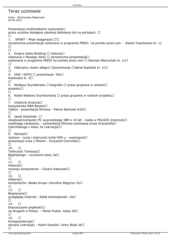 InterKlasa Teraz uczniowie Autor: Stachowska Małgorzata 20.06.2012. Prezentacje multimedialne wykonane przez uczniów dostępne szkolnej bibliotece lub na portalach. 1. SPORT - Moje osiągnięcia dynamiczna prezentacja wykonana w programie PREZI na portalu prezi.com - Daniel Twardowski kl. 1c 2. Empire State Building historia wieżowca z Nowego Jorku dynamiczna prezentacja wykonana w programie PREZI na portalu prezi.com Damian Mleczyński kl. 1c 3. Odkryjmy razem allegro prezentacja Jakub Kądziela kl. 1c 4. ONZ i NATO prezentacja Ola Kielewska kl. 3 5. Wisława Szymborska biografia praca grupowa w ramach projektu 6. Nobel Wisławy Szymborskiej praca grupowa w ramach projektu 7. Ulubiona drużyna koszykarska NBA-Boston Celtics - prezentacja filmowa - Patryk Bartosik kl1b 8. Jacek Karpiński - zbudował komputer PC wyprzedzając IBM o 10 lat - realia w POLSCE zniszczyły wybitnego naukowca. - prezentacja filmowa wykonana przez Krzysztofa Ciarcińskiego z klasy 3a /narracja/ 9. Michael Jackson - życie i twórczośc króla POP-u - wykonanie prezentacji wraz z filmem - Krzysztof Ciarciński 10. Twórczośc Tomasza Bagińskiego - uczniowie klasy 3a 11. Historia rozwoju komputerów - Cezary Kakowski 12. Historia komputerów -Beata Krupa i Karolina Węgrzyn 3c 13. Bezpieczne przeglądaj Internet - Rafał Andrzejewski -3a 14. Dopuszczane prędkości na drogach w Polsce - Marta Fiutek- klasa 3d 15. Korespondencja seryjna (narracja) - Kamil Szostek i Artur Biela 3b http://gim4tychy.pl/inter Kreator PDF Utworzono 7 March, 2017, 20:26 InterKlasa 16. Pamięci masowe (narracja) - (24MB) - Damian Wójcik, Bartek Pawłowski, Marek Wróbel -3b 17. Zwierzęta żwakowskiego lasu (5MB) - Monika Błaszczyk 3c 18. Zwierzęta tyskich lasów (15MB) - Dominika Wagner 3c 19. Historia komputerów i Internetu - Magdalena Kopycińska i Barbara Pieszko 3c 20. Algorytmy - Judyta Wawrzykiewicz 3b 21. Rodzaje algorytmów - Magda Kopycińska -3c 22. Przystań Ocalenie - Monika Błaszczyk i Paulina Kałużna 2c 23. Zjawisko nadprzewodnictwa - Marta Szuplak i Marta Sornek kl.2c 24. Grafika wektorowa i bitmapy - (0,3MB) - Piotr Danielczyk 3d 25. Odwzorowanie figur w przestrzeni - izometria i dimetria ukośna - Mariusz Januszewicz - klasa 2e 26. Prawo OHMA. Połączenia równoległe i szeregowe rezystorów. (0,3 MB) - Aneta Nicpoń - klasa 2d 27. Bryły obrotowe i graniastosłupy (0,4 Mb) - Beata Dziedzic - klasa 3a 28. Połączenia rezystrów - zadanie- Kinga Nowakowska - 3b 29. Graniastosłupy i ostrosłupy. Obliczanie objętości. (0,2Mb) - Katarzyna Fil - klasa 3a 30. Blok prezentacji multimedialnych dot. obsługi programu Total Commander - Paweł Niemiec klasa 3a http://gim4tychy.pl/inter Kreator PDF Utworzono 7 March, 2017, 20:26 InterKlasa a. Ogólny wygląd programu b. Kopiowanie i przesuwanie plików c. Pakowanie i rozpakowywanie d. Wyszukiwanie plików e. Dodawanie skrótów do paska narzędzi f. Dodatki http://gim4tychy.pl/inter Kreator PDF Utworzono 7 March, 2017, 20:26