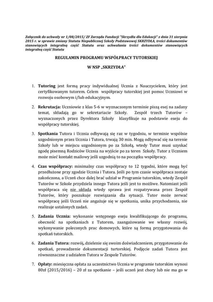 Załącznik do uchwały nr 1/08/2015/ ZF Zarządu Fundacji "Skrzydła dla Edukacji" z dnia 31 sierpnia 2015 r. w sprawie zmiany Statutu Niepublicznej Szkoły Podstawowej SKRZYDŁA, treści dokumentów stanowiących integralną część Statutu oraz uchwalania treści dokumentów stanowiących integralną część Statutu REGULAMIN PROGRAMU WSPÓŁPRACY TUTORSKIEJ W NSP „SKRZYDŁA” 1. Tutoring jest formą pracy indywidualnej Ucznia z Nauczycielem, który jest certyfikowanym tutorem. Celem współpracy tutorskiej jest pomoc Uczniowi w rozwoju osobowym i/lub edukacyjnym. 2. Rekrutacja: Uczniowie z klas 5-6 w wyznaczonym terminie piszą esej na zadany temat, składają go w sekretariacie Szkoły. Zespół trzech Tutorów – wyznaczonych przez Dyrektora Szkoły klasyfikuje na podstawie eseju do współpracy tutorskiej. 3. Spotkania Tutora i Ucznia odbywają się raz w tygodniu, w terminie wspólnie uzgodnionym przez Ucznia i Tutora, trwają 30 min. Mogą odbywać się na terenie Szkoły lub w miejscu uzgodnionym po za Szkołą, wtedy Tutor musi uzyskać zgodę pisemną Rodziców Ucznia na wyjście po za teren Szkoły. Tutor z Uczniem może mieć kontakt mailowy jeśli uzgodnią to na początku współpracy. 4. Czas współpracy: minimalny czas współpracy to 12 tygodni, które mogą być przedłużone przy zgodzie Ucznia i Tutora. Jeśli po tym czasie współpraca zostaje zakończona, a Uczeń chce dalej brać udział w Programie tutorskim, wtedy Zespół Tutorów w Szkole przydziela innego Tutora jeśli jest to możliwe. Natomiast jeśli współpraca się nie układa wtedy sprawa jest rozpatrywana przez Zespół Tutorów, który poszukuje rozwiązania dla sytuacji. Tutor może zerwać współpracę jeśli Uczeń nie angażuje się w spotkania, unika przychodzenia, nie realizuje ustalonych zadań. 5. Zadania Ucznia: wykonanie wstępnego eseju kwalifikującego do programu, obecność na spotkaniach z Tutorem, zaangażowanie we własny rozwój, wykonywanie poleconych prac domowych, które są formą przygotowania do spotkań tutorskich. 6. Zadania Tutora: rozwój, dzielenie się swoim doświadczeniem, przygotowanie do spotkań, prowadzenie dokumentacji turtorskiej. Podjęcie zadań Tutora jest równoznaczne z udziałem Tutora w Zespole Tutorów. 7. Opłaty: miesięczna opłata za uczestnictwo Ucznia w programie tutorskim wynosi 80zł (2015/2016) – 20 zł za spotkanie – jeśli uczeń jest chory lub nie ma go w szkole z powodów usprawiedliwionych, ferii to spotkanie jest odrabiane/ lub odliczane od miesięcznej opłaty w kolejnym miesiącu; jeśli uczeń omija spotkanie (zapomina, „nie chce mu się” itp.) spotkanie nie jest odrabiane i nie zostaje odliczone od kwoty miesięcznej. Uczniowie, będący laureatami ogólnopolskich, wojewódzkich konkursów i olimpiad pod patronatem MEN lub Kuratorium zostają zwolnieni z 50% opłaty. Rodzice Ucznia po zakwalifikowaniu Go do Programu Tutorskiego podpisują zgodę na udział Dziecka w Programie co jest równoznaczne z zobowiązaniem do uiszczania płaty miesięcznej. DOKUMENTACJA TUTORA 1. Zasady współpracy – ustalone wspólnie z Dzieckiem i podpisane przez Turtora i Dziecko; 2. Karta spotkania tutorskiego – opis celów i zadań przed spotkaniem oraz opis spotkania, tego co się zadziało, pracy domowej, swoich spostrzeżeń. 3. Karta ewaluacji pracy – wypełniona przez Podopiecznego. 4. Dokumentację przechowuje Tutor, prowadzenie jej ma na celu doskonalenie warsztatu tutorskiego i uzyskiwanie informacji zwrotnej dla podniesienia jakości pracy.