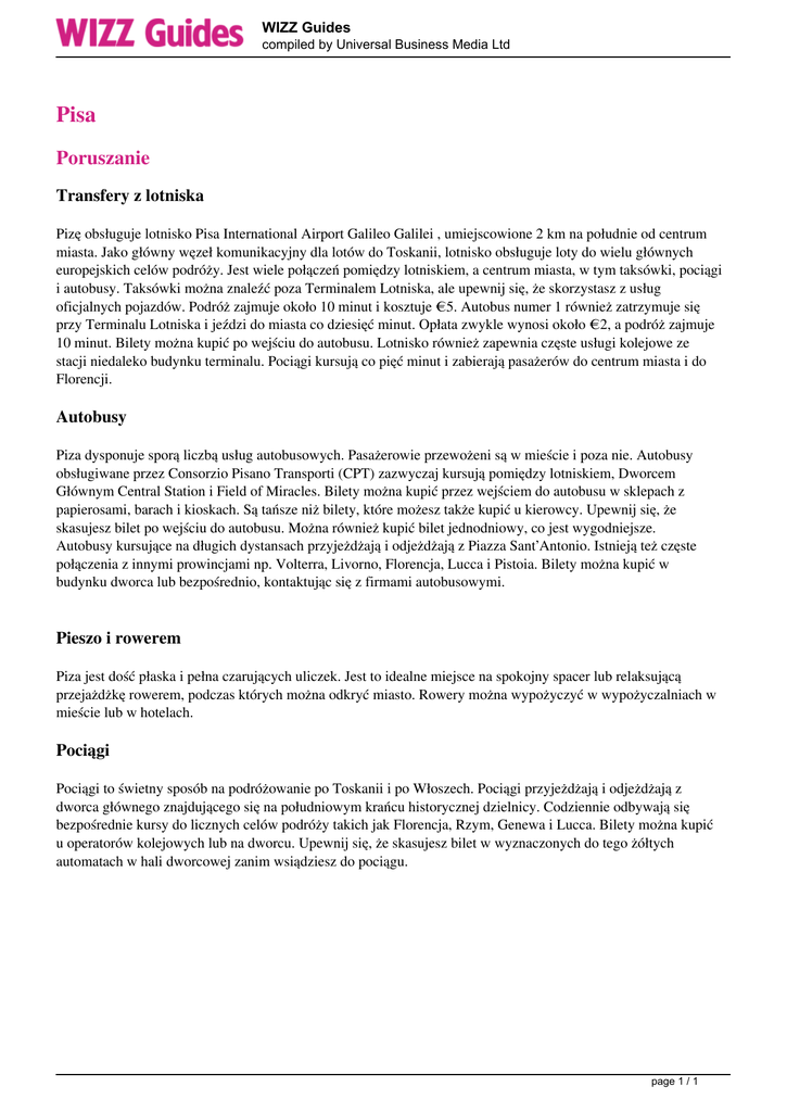 WIZZ Guides compiled by Universal Business Media Ltd Pisa Poruszanie Transfery z lotniska Pizę obsługuje lotnisko Pisa International Airport Galileo Galilei , umiejscowione 2 km na południe od centrum miasta. Jako główny węzeł komunikacyjny dla lotów do Toskanii, lotnisko obsługuje loty do wielu głównych europejskich celów podróży. Jest wiele połączeń pomiędzy lotniskiem, a centrum miasta, w tym taksówki, pociągi i autobusy. Taksówki można znaleźć poza Terminalem Lotniska, ale upewnij się, że skorzystasz z usług oficjalnych pojazdów. Podróż zajmuje około 10 minut i kosztuje €5. Autobus numer 1 również zatrzymuje się przy Terminalu Lotniska i jeździ do miasta co dziesięć minut. Opłata zwykle wynosi około €2, a podróż zajmuje 10 minut. Bilety można kupić po wejściu do autobusu. Lotnisko również zapewnia częste usługi kolejowe ze stacji niedaleko budynku terminalu. Pociągi kursują co pięć minut i zabierają pasażerów do centrum miasta i do Florencji. Autobusy Piza dysponuje sporą liczbą usług autobusowych. Pasażerowie przewożeni są w mieście i poza nie. Autobusy obsługiwane przez Consorzio Pisano Transporti (CPT) zazwyczaj kursują pomiędzy lotniskiem, Dworcem Głównym Central Station i Field of Miracles. Bilety można kupić przez wejściem do autobusu w sklepach z papierosami, barach i kioskach. Są tańsze niż bilety, które możesz także kupić u kierowcy. Upewnij się, że skasujesz bilet po wejściu do autobusu. Można również kupić bilet jednodniowy, co jest wygodniejsze. Autobusy kursujące na długich dystansach przyjeżdżają i odjeżdżają z Piazza Sant’Antonio. Istnieją też częste połączenia z innymi prowincjami np. Volterra, Livorno, Florencja, Lucca i Pistoia. Bilety można kupić w budynku dworca lub bezpośrednio, kontaktując się z firmami autobusowymi. Pieszo i rowerem Piza jest dość płaska i pełna czarujących uliczek. Jest to idealne miejsce na spokojny spacer lub relaksującą przejażdżkę rowerem, podczas których można odkryć miasto. Rowery można wypożyczyć w wypożyczalniach w mieście lub w hotelach. Pociągi Pociągi to świetny sposób na podróżowanie po Toskanii i po Włoszech. Pociągi przyjeżdżają i odjeżdżają z dworca głównego znajdującego się na południowym krańcu historycznej dzielnicy. Codziennie odbywają się bezpośrednie kursy do licznych celów podróży takich jak Florencja, Rzym, Genewa i Lucca. Bilety można kupić u operatorów kolejowych lub na dworcu. Upewnij się, że skasujesz bilet w wyznaczonych do tego żółtych automatach w hali dworcowej zanim wsiądziesz do pociągu. page 1 / 1