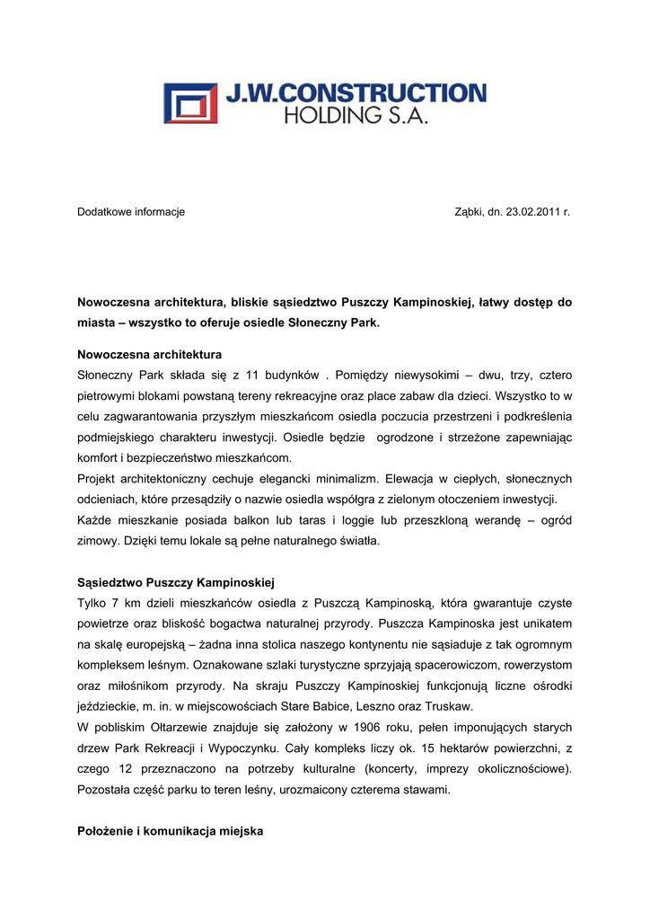 Dodatkowe informacje Ząbki, dn. 23.02.2011 r. Nowoczesna architektura, bliskie sąsiedztwo Puszczy Kampinoskiej, łatwy dostęp do miasta – wszystko to oferuje osiedle Słoneczny Park. Nowoczesna architektura Słoneczny Park składa się z 11 budynków . Pomiędzy niewysokimi – dwu, trzy, cztero pietrowymi blokami powstaną tereny rekreacyjne oraz place zabaw dla dzieci. Wszystko to w celu zagwarantowania przyszłym mieszkańcom osiedla poczucia przestrzeni i podkreślenia podmiejskiego charakteru inwestycji. Osiedle będzie ogrodzone i strzeżone zapewniając komfort i bezpieczeństwo mieszkańcom. Projekt architektoniczny cechuje elegancki minimalizm. Elewacja w ciepłych, słonecznych odcieniach, które przesądziły o nazwie osiedla współgra z zielonym otoczeniem inwestycji. Każde mieszkanie posiada balkon lub taras i loggie lub przeszkloną werandę – ogród zimowy. Dzięki temu lokale są pełne naturalnego światła. Sąsiedztwo Puszczy Kampinoskiej Tylko 7 km dzieli mieszkańców osiedla z Puszczą Kampinoską, która gwarantuje czyste powietrze oraz bliskość bogactwa naturalnej przyrody. Puszcza Kampinoska jest unikatem na skalę europejską – żadna inna stolica naszego kontynentu nie sąsiaduje z tak ogromnym kompleksem leśnym. Oznakowane szlaki turystyczne sprzyjają spacerowiczom, rowerzystom oraz miłośnikom przyrody. Na skraju Puszczy Kampinoskiej funkcjonują liczne ośrodki jeździeckie, m. in. w miejscowościach Stare Babice, Leszno oraz Truskaw. W pobliskim Ołtarzewie znajduje się założony w 1906 roku, pełen imponujących starych drzew Park Rekreacji i Wypoczynku. Cały kompleks liczy ok. 15 hektarów powierzchni, z czego 12 przeznaczono na potrzeby kulturalne (koncerty, imprezy okolicznościowe). Pozostała część parku to teren leśny, urozmaicony czterema stawami. Położenie i komunikacja miejska Osiedle Słoneczny Park położone jest zaledwie 10 minut drogi od ul. Lazurowej na wysokości dzielnicy Bemowo. Sieć połączeń komunikacyjnych zapewnia szybki i łatwy dojazd do centrum Warszawy. Linia autobusowa nr 713 kursuje z miejscowości Koprki (przystanek końcowy: Agricoop), przez Ołtarzew, Ożarów Mazowiecki – do pętli Cmentarz Wolski (przy Forcie Wola). Czas przejazdu z Ożarowa do końca trasy w Warszawie zajmuje około 25 minut. Tutaj można się przesiąść np. do tramwaju nr 27 (trasa: ul. Wolska, al. Solidarności, Okopowa, Rondo "Radosława", Metro Marymont). Przy Cmentarzu Wolskim pętlę mają także autobusy linii: 189 (kursuje na Sadybę) i 194 (trasa po Ursusie, do pętli Gołąbki). Na żądanie zatrzymują się również autobusy: 105 (Nowe Bemowo – pl. Trzech Krzyży), 125 (Os. Górczewska – Międzylesie), 129 (Koło – PKP Ursus), 155 (Karolin – Torwar), 184 (Huta – Szczęśliwice) oraz nocna linia N42 (Dw. Centralny – Os. Górczewska). Możliwy jest także alternatywny dojazd z Ożarowa Mazowieckiego do Warszawy autokarem PKS lub pociągiem PKP. Inwestycja znajduje się w pobliżu miejscowości Umiastów w gminie Ożarów Mazowiecki, w powiecie warszawskim – zachodnim. Oprócz Warszawy (od wschodu) gmina Ożarów Mazowiecki sąsiaduje także: od południa z gminami Piastów, Pruszków, Brwinów, od zachodu z gminą Błonie, natomiast od północy z gminami Leszno i Babice Stare, które położone są już w granicach Puszczy Kampinoskiej. Z Umiastowa do pobliskiego Ożarowa Mazowieckiego kursuje bus, którego godziny odjazdów aktualizowane są na stronie internetowej gminy. Spacerem odcinek ten zajmie około 20 minut. Drogi Osiedle Słoneczny Park zlokalizowano przy ul. Żyznej, biegnącej prostopadle od ul. Sochaczewskiej (trasa Borzęcin-Strzykuły), 6 minut jazdy od Ożarowa Mazowieckiego w kierunku północnym. Przez gminę przebiega szlak drogowy Warszawa – Poznań oraz trakt kolejowy Warszawa – Berlin. Z Umiastowa można dojechać samochodem do stolicy co najmniej na dwa sposoby. Trasą Warszawa – Poznań, kierując się ul. Umiastowską do Ożarowa Mazowieckiego, a następnie Poznańską. Na terenie Warszawy przechodzi ona w ul. Połczyńską, po czym w dzielnicy Wola rozwidla się w ul. Wolską oraz Kasprzaka. Stąd jest już bardzo blisko do dowolnej części Centrum. Druga trasa wiedzie z Umiastowa w kierunku północnym, do trasy Warszawskiej. Można nią dotrzeć do Bemowa, gdzie przechodzi w ul. Górczewską. Ta trasa spodoba się również niezmotoryzowanym. Wzdłuż całej drogi, aż do skrzyżowania z ul. Lazurową biegnie ścieżka rowerowa. Rekreacja i edukacja W Ożarowie Mazowieckim funkcjonuje wiele klubów sportowych oraz Gminny Ośrodek Sportu i Rekreacji, który organizuje wiele imprez o charakterze sportowo-rekreacyjnym dla dzieci i młodzieży. Poza tym w mieście znajduje się również pływalnia miejska, która oferuje możliwość korzystania z basenu sportowego, basenu do nauki pływania, zespołu basenów rekreacyjnych wyposażonych w prądy wodne, gejzerów, ławki napowietrzające oraz zjeżdżalni. Basen sąsiaduje z zespołem szkół, na terenie którego znajdują się: hala sportowa, odkryte boiska do gier zespołowych ze sztuczną nawierzchnią oraz korty tenisowe. W pobliżu inwestycji powstają nowe obiekty, które służyć będą mieszkańcom osiedla Słoneczny Park. Między innymi nowoczesny ośrodek sportowo – rekreacyjny. Kompleks składać się będzie między innymi z 4 boisk piłkarskich, 1 boiska krytego wielofunkcyjnego, 15 zadaszonych kortów tenisowych, ścieżki rowerowo – rolkowej, górki saneczkowej, boisk do siatkówki oraz do piłki koszykowej. Na terenie gminy znajdują się przedszkola państwowe i prywatne, publiczne szkoły podstawowe, gimnazjum oraz zespołu szkół ponadgimnazjalnych. Sklepy i punkty usługowe Usługi oferują salony fryzjerskie, kosmetyczne, optyczne, pralnie, banki czy też operatorzy telefonii komórkowych. Działają tu kina, punkty gastronomiczne oraz miejsca zabaw dla dzieci. W Kaputach koło Umiastowa mie