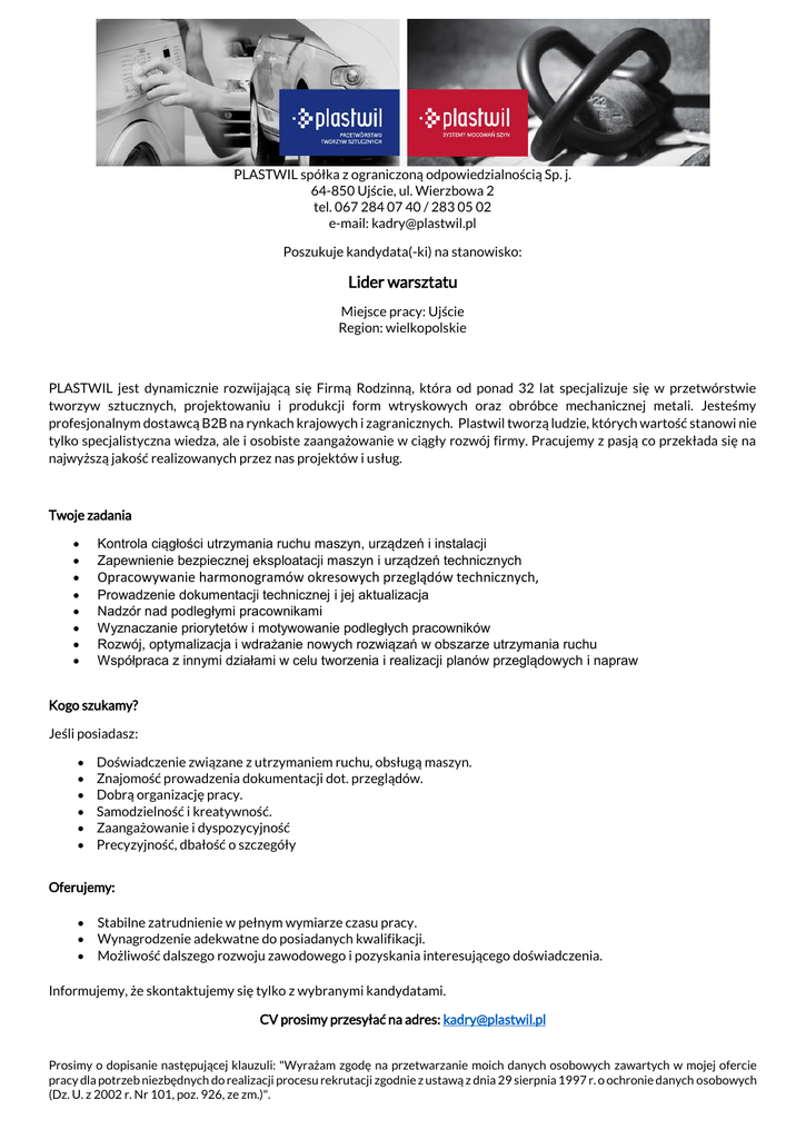 PLASTWIL spółka z ograniczoną odpowiedzialnością Sp. j. 64-850 Ujście, ul. Wierzbowa 2 tel. 067 284 07 40 / 283 05 02 e-mail: [email protected] Poszukuje kandydata(-ki) na stanowisko: Lider warsztatu Miejsce pracy: Ujście Region: wielkopolskie PLASTWIL jest dynamicznie rozwijającą się Firmą Rodzinną, która od ponad 32 lat specjalizuje się w przetwórstwie tworzyw sztucznych, projektowaniu i produkcji form wtryskowych oraz obróbce mechanicznej metali. Jesteśmy profesjonalnym dostawcą B2B na rynkach krajowych i zagranicznych. Plastwil tworzą ludzie, których wartość stanowi nie tylko specjalistyczna wiedza, ale i osobiste zaangażowanie w ciągły rozwój firmy. Pracujemy z pasją co przekłada się na najwyższą jakość realizowanych przez nas projektów i usług. Twoje zadania Kontrola ciągłości utrzymania ruchu maszyn, urządzeń i instalacji Zapewnienie bezpiecznej eksploatacji maszyn i urządzeń technicznych Opracowywanie harmonogramów okresowych przeglądów technicznych, Prowadzenie dokumentacji technicznej i jej aktualizacja Nadzór nad podległymi pracownikami Wyznaczanie priorytetów i motywowanie podległych pracowników Rozwój, optymalizacja i wdrażanie nowych rozwiązań w obszarze utrzymania ruchu Współpraca z innymi działami w celu tworzenia i realizacji planów przeglądowych i napraw Kogo szukamy? Jeśli posiadasz: Doświadczenie związane z utrzymaniem ruchu, obsługą maszyn. Znajomość prowadzenia dokumentacji dot. przeglądów. Dobrą organizację pracy. Samodzielność i kreatywność. Zaangażowanie i dyspozycyjność Precyzyjność, dbałość o szczegóły Oferujemy: Stabilne zatrudnienie w pełnym wymiarze czasu pracy. Wynagrodzenie adekwatne do posiadanych kwalifikacji. Możliwość dalszego rozwoju zawodowego i pozyskania interesującego doświadczenia. Informujemy, że skontaktujemy się tylko z wybranymi kandydatami. CV prosimy przesyłać na adres: [email protected] Prosimy o dopisanie następującej klauzuli: "Wyrażam zgodę na przetwarzanie moich danych osobowych zawartych w mojej ofercie pracy dla potrzeb niezbędnych do realizacji procesu rekrutacji zgodnie z ustawą z dnia 29 sierpnia 1997 r. o ochronie danych osobowych (Dz. U. z 2002 r. Nr 101, poz. 926, ze zm.)".