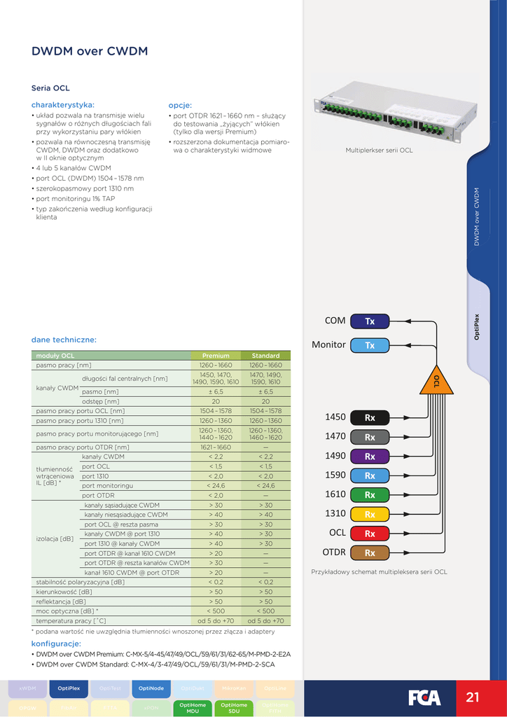 DWDM over CWDM Seria OCL charakterystyka: opcje: ĆŘukład pozwala na transmisje wielu sygnałów o różnych długościach fali przy wykorzystaniu pary włókien ĆŘpozwala na równoczesną transmisję CWDM, DWDM oraz dodatkowo w II oknie optycznym ĆŘport OTDR 1621 – 1660 nm – służący do testowania „żyjących” włókien (tylko dla wersji Premium) ĆŘrozszerzona dokumentacja pomiarowa o charakterystyki widmowe Multiplerkser serii OCL ĆŘ4 lub 5 kanałów CWDM ĆŘport OCL (DWDM) 1504 – 1578 nm DWDM over CWDM ĆŘszerokopasmowy port 1310 nm dane techniczne: moduły OCL Standard 1260 – 1660 1260 – 1660 1450, 1470, 1490, 1590, 1610 1470, 1490, 1590, 1610 pasmo [nm] ± 6,5 ± 6,5 odstęp [nm] 20 20 pasmo pracy portu OCL [nm] 1504 – 1578 1504 – 1578 pasmo pracy portu 1310 [nm] 1260 – 1360 1260 – 1360 pasmo pracy portu monitorującego [nm] 1260 – 1360, 1440 – 1620 1260 – 1360, 1460 – 1620 pasmo pracy portu OTDR [nm] 1621 – 1660 — kanały CWDM < 2,2 < 2,2 port OCL < 1,5 < 1,5 pasmo pracy [nm] długości fal centralnych [nm] kanały CWDM tłumienność wtrąceniowa IL [dB] * izolacja [dB] port 1310 < 2,0 < 2,0 port monitoringu < 24,6 < 24,6 port OTDR < 2,0 — kanały sąsiadujące CWDM > 30 > 30 kanały niesąsiadujące CWDM > 40 > 40 port OCL @ reszta pasma > 30 > 30 kanały CWDM @ port 1310 > 40 > 30 port 1310 @ kanały CWDM > 40 > 30 port OTDR @ kanał 1610 CWDM > 20 — port OTDR @ reszta kanałów CWDM > 30 — > 20 — stabilność polaryzacyjna [dB] kanał 1610 CWDM @ port OTDR < 0,2 < 0,2 kierunkowość [dB] > 50 > 50 reflektancja [dB] > 50 > 50 < 500 < 500 od 5 do +70 od 5 do +70 moc optyczna [dB] * temperatura pracy [˚C] Tx Monitor Tx 1450 Rx 1470 Rx 1490 Rx 1590 Rx 1610 Rx 1310 Rx OCL Rx OTDR Rx OCL Premium COM OptiPlex OptiNode de ĆŘport monitoringu 1% TAP ĆŘtyp zakończenia według konfiguracji klienta Przykładowy schemat multipleksera serii OCL * podana wartość nie uwzględnia tłumienności wnoszonej przez złącza i adaptery konfiguracje: ąŗDWDM over CWDM Premium: C-MX-5/4-45/47/49/OCL/59/61/31/62-65/M-PMD-2-E2A ąŗDWDM over CWDM Standard: C-MX-4/3-47/49/OCL/59/61/31/M-PMD-2-SCA xWDM OptiPlex OptiTest OptiNode OptiDukt MikroKan OptiLine FibAir FTTA xPON OptiHome MDU OptiHome SDU OptiHome FITH 21