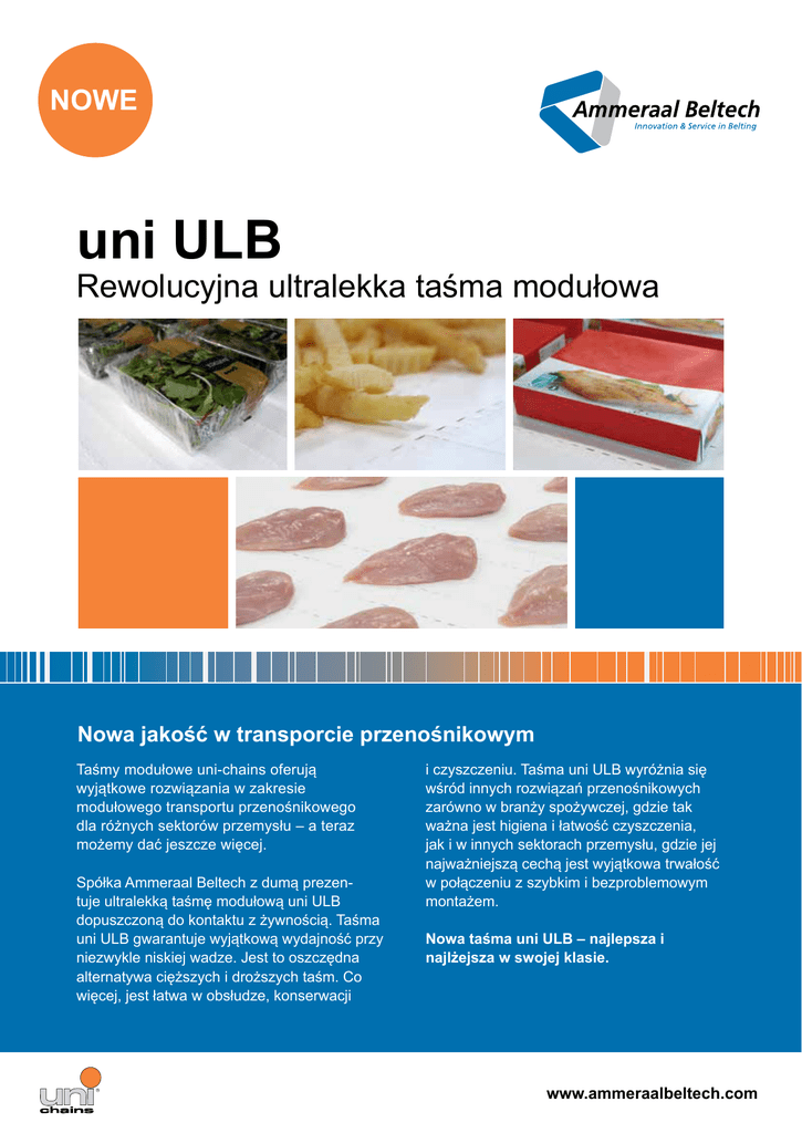 NOWE uni ULB Rewolucyjna ultralekka taśma modułowa Nowa jakość w transporcie przenośnikowym Taśmy modułowe uni-chains oferują wyjątkowe rozwiązania w zakresie modułowego transportu przenośnikowego dla różnych sektorów przemysłu – a teraz możemy dać jeszcze więcej. Spółka Ammeraal Beltech z dumą prezentuje ultralekką taśmę modułową uni ULB dopuszczoną do kontaktu z żywnością. Taśma uni ULB gwarantuje wyjątkową wydajność przy niezwykle niskiej wadze. Jest to oszczędna alternatywa cięższych i droższych taśm. Co więcej, jest łatwa w obsłudze, konserwacji i czyszczeniu. Taśma uni ULB wyróżnia się wśród innych rozwiązań przenośnikowych zarówno w branży spożywczej, gdzie tak ważna jest higiena i łatwość czyszczenia, jak i w innych sektorach przemysłu, gdzie jej najważniejszą cechą jest wyjątkowa trwałość w połączeniu z szybkim i bezproblemowym montażem. Nowa taśma uni ULB – najlepsza i najlżejsza w swojej klasie. www.ammeraalbeltech.com Spółka Ammeraal Beltech, członek Europejskiego Stowarzyszenia Inżynierów, Projektantów i Konstruktorów (EHEDG). Taśma uni ULB jest godną uwagi innowacją. Jest to jedyna taśma na rynku o tak niskiej wadze. Potrzebują Państwo więcej informacji? Dopuszczone do kontaktu z żywnością taśmy są zgodne z normami WE 1935/2004, UE 10/2011 i przepisami FDA. Zapraszamy do kontaktu z najbliższym oddziałem sprzedaży spółki Ammeraal Beltech lub na stronę www.ammeraalbeltech.com, gdzie znajdą Państwo lokalne centrum obsługi. Z przyjemnością Państwu pomożemy. Taśma uni ULB zmniejszy wagę Państwa ładunku i w dodatku go przeniesie! Po co płacić za wagę większą, niż to potrzebne? Rozwiązanie przenośnikowe powinno oferować dokładnie to, czego Państwo potrzebują. Taśma uni ULB pozwoli obniżyć koszty inwestycji kapitałowych oraz zużycie energii, zapewniając przy tym najwyższe standardy wydajności. Rewolucyjna konstrukcja •Pierwsza ultralekka taśma zdolna przenosić ładunek o wadze do 1000 kg przy standardowej szerokości 1 m • Niższa waga gwarantująca konkurencyjne koszty • Trwała konstrukcja zapewniająca długą żywotność •Brak konieczności zapewnienia siły naciągu podczas konfiguracji lub regulacji w trakcie eksploatacji, by zapewnić maksymalny czas pracy •Lepsza sterowalność podczas montażu i demontażu niż w przypadku taśm standardowych, mniejsze obciążenie dla personelu Ulubione rozwiązanie w przemyśle spożywczym •Najlepsze właściwości i standardy w przemyśle spożywczym, higieniczna konstrukcja, biało-niebieski kolor •Konstrukcja z „odsłoniętym sworzniem”, zapewniająca szybkie i bezproblemowe zmywanie •Półzamknięta konstrukcja zawiasów uniemożliwia gromadzenie żywności, kiedy taśma wygina się przy kole zębatym Najlepszy w tej klasie system zawiasów uni-chains ułatwia konserwację taśmy. Taśmę uni ULB można bez trudu i szybko czyścić przy oszczędności wody i czasu. Produkcja i obsługa Pasy transmisyjne Paski rozrządu Taśmy modułowe Taśmy bezszwowe Przenośniki taśmowe Data: 07.2016 Taśma przyjazna dla środowiska •Niższa waga – niższe zużycie energii i mniejszy ślad węglowy •Łatwość czyszczenia – niższe zużycie wody oraz środka czyszczącego •Długa żywotność oraz możliwość recyklingu najważniejszych materiałów – wyjątkowe referencje regeneracyjne Porady ekspertów, rozwiązania wysokiej jakości oraz lokalny serwis dla wszystkich Państwa potrzeb w zakresie taśm i pasów www.ammeraalbeltech.com Niniejsze informacje mogą ulec zmianie w związku z ciągłym procesem rozwoju. Spółka Ammeraal Beltech nie ponosi odpowiedzialności z tytułu nieprawidłowego wykorzystania powyższych informacji. Niniejsze informacje zastępują informacje podane wcześniej. Wszelkie działania i usługi realizowane przez spółkę Ammeraal Beltech podlegają ogólnym warunkom sprzedaży i dostawy stosowanym przez jej spółki operacyjne. Ammeraal Beltech Sp. z o.o. Tadeusza Regera 61 43-382 Bielsko-Biała Polska T +48 32 44 77 179 F +48 0324475371 [email protected]