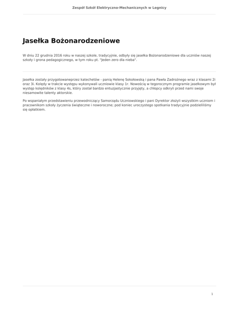 Zespół Szkół Elektryczno-Mechanicznych w Legnicy Jasełka Bożonarodzeniowe W dniu 22 grudnia 2016 roku w naszej szkole, tradycyjnie, odbyły się jasełka Bożonarodzeniowe dla uczniów naszej szkoły i grona pedagogicznego, w tym roku pt. "Jeden zero dla nieba". Jasełka zostały przygotowaneprzez katechetów - panią Helenę Sokołowską i pana Pawła Zadrożnego wraz z klasami 2i oraz 3i. Kolędy w trakcie występu wykonywali uczniowie klasy 1r. Nowością w tegorocznym programie jasełkowym był występ kolędników z klasy 4s, który został bardzo entuzjastycznie przyjęty, a chłopcy odkryli przed nami swoje niesamowite talenty aktorskie. Po wspaniałym przedstawieniu przewodniczący Samorządu Uczniowskiego i pani Dyrektor złożyli wszystkim uczniom i pracownikom szkoły życzenia świąteczne i noworoczne; pod koniec uroczystego spotkania tradycyjnie podzieliliśmy się opłatkiem. 1