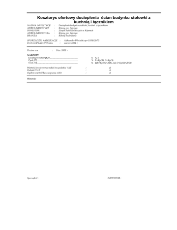 Kosztorys ofertowy docieplenia ścian budynku stołowki z kuchnią i łącznikiem NAZWA INWESTYCJI ADRES INWESTYCJI INWESTOR ADRES INWESTORA BRANŻA : : : : : Docieplenie budynku stołówki, kuchni z łącznikiem Kijany gm. Spiczyn Zespól Szkól Rolniczych w Kijanach Kijany gm. Spiczyn Roboty budowlana SPORZĄDZIŁ KALKULACJE : DATA OPRACOWANIA : Poziom cen : Aleksander Wożniak upr 1930/Lb/73 marzec 2011 r. I kw. 2011 r NARZUTY Koszty pośrednie [Kp] ................................................. Zysk [Z] ....................................................................... VAT [V] ....................................................................... Wartość kosztorysowa robót bez podatku VAT Podatek VAT Ogółem wartość kosztorysowa robót % R, S % R+Kp(R), S+Kp(S) % Σ(R+Kp(R)+Z(R), M, S+Kp(S)+Z(S)) : : : zł zł zł Słownie: Sporządził : INWESTOR : KSIĄŻKA PRZEDMIARÓW Lp. Podst Opis i wyliczenia 1 Docieplenie ścian 1 KNR-W 2- Rusztowania ramowe przyścienne RR - 1/30 wys. do 16 m d.1 02 1609-02 12.0*4.20+11.64*5.41+1.50*5.41 j.m. m2 121.487 RAZEM 121.487 121.487 RAZEM 121.487 5.902 RAZEM 5.902 94.060 RAZEM 94.060 m2 3 KNR-W 4- Uzupełnienie tynków zew gzymsów d.1 01 0726-04 29.51*0.20 5 KNNR -2 d.1 1902-04 m2 Docieplenie ścian budynków płytami styropianowymi - system KREISELprzy użyciu got. zapraw klejących wraz z przyg. podłoża i ręczne wyk. wyprawy elew. z got. suchej mieszanki - zamocowanie listwy cokołowej 11.64+17.87+15.17+12.62+11.89+24.87 m m Docieplenie ścian płytami styropianowymi gr 8 cm- system KREISEL - przy m2 użyciu got. zapraw klejących wraz z przyg. podłoża i ręczne wyk. wyprawy elew. z got. suchej mieszanki 3.73*12.87+12.0*4.46+3.87*15.17+(4.4+5.40)*0.5*12.62+3.8*11.64+5.41* m2 17.87+11.89*3.43-(0.7*1.2*2+1.56*2.25*2+2.09*1.23+1.25*0.9*4+0.9*0.9* 2+1.72*1.03+2.52*1.72*6+1.72*1.74*5+2.0*1.07+0.9*0.9+1.77*1.77*5+ 1.09*2.23+2.5*2.23*3+1.77*2.23+0.5*0.98*6+0.5*0.98*8+0.5*0.5+1.54* 0.8*2+1.81*1.54*3+1.0*1.25*2+2.0*1.0+84.339 +140) 55.137 RAZEM 6 KNNR -2 d.1 1902-04 7 KNR 0-23 d.1 2614-04 Docieplenie ścian płytami styropianowymi gr 8 cm- system KREISEL - przy m2 użyciu got. zapraw klejących wraz z przyg. podłoża i ręczne wyk. wyprawy elew. z got. suchej mieszanki - materiał inwestora /styropian/ 140 m2 Docieplenie ościeży o szer. 15 cm z gazobetonu płytami styropianowymi gr m2 2 cm- system KREISEL - przy użyciu got. zapraw klejących wraz z przyg. podłoża i ręczne wyk. wyprawy elew. z got. suchej mieszanki (0.5*2*18+0.98*18+0.5*3+1.54*2*2+0.8*2+1.54*2*3+1.81*3+1.0*2+1.25* m2 2*2+2.0*2+1.0+1.25*2*4+0.9*4+0.9*31.72*2*6+2.52*6+1.72*2*5+1.74*5+ 0.9*2+1.72*2+1.03+1.07+2.0*2+1.2*2*2+0.7*2+1.56*2*2+2.25*2+2.09+ 1.23*2+1.09*2+2.23*2+2.5*2*3+2.23+1.77*2+2.23+0.9*3+1.77*3*5)*0.15 140.000 RAZEM 9 KNR 2-02 d.1 1505-12 Docieplenie ścian budynków płytami styropianowymi - system KREISEL m przy użyciu got. zapraw klejących wraz z przyg. podłoża i ręczne wyk. wyprawy elew. z got. suchej mieszanki - ochrona narożników wypukłych kątownikiem aluminiowym 560.49+4.71+5.4*2 m Dwukrotne malowanie farbą egalizacyjną powierzchni zewnętrznych m2 55.137+140.0+84.073 m2 10 Czas pracy rusztowania d.1 kalk. własna 172 mg Wymiana rur sustowych z blachy na PCV m2 4.15*4+3.80*2 m2 3 Ocieplenie cokołu z tynkiem mozaikowym 13 KNR 0-17 Przygotowanie podłoża pod ocieplenie metodą lekką-mokrą - impregnacja d.3 2608-02 grzybobójcza jednokrotnie - cokołu 94.06*0.98-0.5*0.98*16 -2- Norma PRO Wersja 4.01, Marzec 2003 r. 140.000 84.073 576.000 RAZEM 576.000 279.210 RAZEM 279.210 172.000 RAZEM 172.000 mg 2 Obróbki blacharskie 11 KNR-W 2- Wymiana obróbek podokienników z blachy stalowej ocynkowanej na powle- m2 d.2 02 0514-01 kaną 0.98*18*0.35+(0.9+1.03+2.52*6+1.74*5+0.9*5+0.7*2+1.56*2+1.23+1.09+ m2 2.23*4+1.77*5+0.9+0.8*2+1.81*3+0.5+1.0*2)*0.4 12 KNR-W 2d.2 02 0536 01 55.137 84.073 RAZEM 8 KNNR-2 d.1 1902-11 Razem m2 2 KNR-W 2- Instalacje odgromowe na rusztowaniach zewnętrznych przyściennych o wys. m2 d.1 02 1612-03 do 20 m 121.487 m2 4 KNR 0-23 d.1 2612-09 Poszcz 32.290 RAZEM 32.290 24.200 RAZEM 24.200 84.339 RAZEM 84.339 m2 m2 KSIĄŻKA PRZEDMIARÓW Lp. Podst 14 KNR 0-17 d.3 2608-03 15 KNR 0-17 d.3 2609-01 16 KNR 0-17 d.3 2609-04 17 KNR 0-17 d.3 0930-01 18 KNR 0-17 d.3 0930-03 Opis i wyliczenia Przygotowanie podłoża pod ocieplenie metodą lekką-mokrą - gruntowanie preparatem wzmacniającym jednokrotnie - cokołu 84.339 j.m. m2 m2 Ocieplenie ścian budynków płytami styropianowymi gr 4 cm metodą lekką- m2 mokrą przy użyciu gotowych zapraw klejących - przyklejenie płyt styropianowych do ścian - cokołu 84.339 m2 Ocieplenie ścian budynków płytami styropianowymi metodą lekką-mokrą przy użyciu gotowych zapraw klejących - przymocowanie płyt styropianowych za pomocą dybli plastikowych do ścian z cegły - cokołu 342 szt. Wyprawa elewacyjna cienkowarstwowa o fakturze strukturalnej - nałożenie na podłoże farby gruntującej pierwsza warstwa - cokołu 84.339 m2 szt. m2 Wyprawa elewacyjna cienkowarstwowa o fakturze strukturalnej grubości ok. m2 2.0 mm z gotowej suchej mieszanki żywiczno-mineralnej wyk. /tynk mozaikowy/ ręcznie na uprzednio przygotowanym podłożu na ścianach płaskich i powierzchniach pionowych 84.339 m2 Razem 84.339 RAZEM 84.339 84.339 RAZEM 84.339 342.000 RAZEM 342.000 84.339 RAZEM 84.339 84.339 RAZEM 84.339 5.902 RAZEM 5.902 m2 19 KNR W 4- malowanie farbą emulsyjną gzymsu d.3 01 1204-03 5.902 m2 -3- Norma PRO Wersja 4.01, Marzec 2003 r. Poszcz Lp. Podstawa wyceny 1 2 Docieplenie KNR-W 2-02 1609-02 KNR-W 2-02 1612-03 KNR-W 4-01 0726-04 KNR 0-23 2612-09 1 1 d.1 2 d.1 3 d.1 4 d.1 5 KNNR -2 d.1 1902-04 6 KNNR -2 d.1 1902-04 7 KNR 0-23 d.1 2614-04 8 KNNR-2 d.1 1902-11 9 KNR 2-02 d.1 1505-12 10 d.1 kalk. własna Opis Klucz wy- Jedn. miakonawry czy 3 ścian Rusztowania ramowe przyścienne RR - 1/30 wys. do 16 m Instalacje odgromowe na rusztowaniach zewnętrznych przyściennych o wys. do 20 m Uzupełni