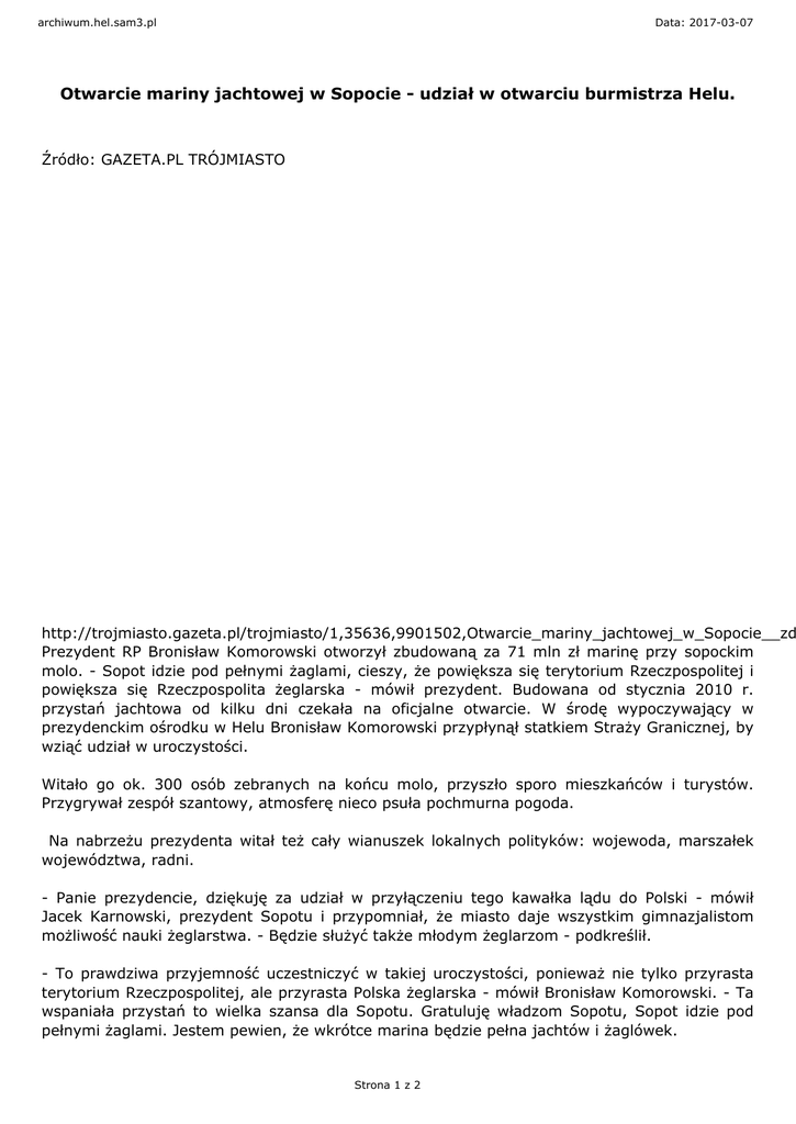 archiwum.hel.sam3.pl Data: 2017-03-07 Otwarcie mariny jachtowej w Sopocie - udział w otwarciu burmistrza Helu. Źródło: GAZETA.PL TRÓJMIASTO http://trojmiasto.gazeta.pl/trojmiasto/1,35636,9901502,Otwarcie_mariny_jachtowej_w_Sopocie__zd Prezydent RP Bronisław Komorowski otworzył zbudowaną za 71 mln zł marinę przy sopockim molo. - Sopot idzie pod pełnymi żaglami, cieszy, że powiększa się terytorium Rzeczpospolitej i powiększa się Rzeczpospolita żeglarska - mówił prezydent. Budowana od stycznia 2010 r. przystań jachtowa od kilku dni czekała na oficjalne otwarcie. W środę wypoczywający w prezydenckim ośrodku w Helu Bronisław Komorowski przypłynął statkiem Straży Granicznej, by wziąć udział w uroczystości. Witało go ok. 300 osób zebranych na końcu molo, przyszło sporo mieszkańców i turystów. Przygrywał zespół szantowy, atmosferę nieco psuła pochmurna pogoda. Na nabrzeżu prezydenta witał też cały wianuszek lokalnych polityków: wojewoda, marszałek województwa, radni. - Panie prezydencie, dziękuję za udział w przyłączeniu tego kawałka lądu do Polski - mówił Jacek Karnowski, prezydent Sopotu i przypomniał, że miasto daje wszystkim gimnazjalistom możliwość nauki żeglarstwa. - Będzie służyć także młodym żeglarzom - podkreślił. - To prawdziwa przyjemność uczestniczyć w takiej uroczystości, ponieważ nie tylko przyrasta terytorium Rzeczpospolitej, ale przyrasta Polska żeglarska - mówił Bronisław Komorowski. - Ta wspaniała przystań to wielka szansa dla Sopotu. Gratuluję władzom Sopotu, Sopot idzie pod pełnymi żaglami. Jestem pewien, że wkrótce marina będzie pełna jachtów i żaglówek. Strona 1 z 2 archiwum.hel.sam3.pl Data: 2017-03-07 Otwarcie mariny jachtowej w Sopocie - udział w otwarciu burmistrza Helu. Prezydent RP nawiązał do rywalizacji gdańsko-gdyńskiej. - Mogę też pogratulować lokalizacji w ramach Trójmiasta, bo tu nie grozi kolizja z "dużymi jednostkami" - ocenił. Były metropolita gdański abp. Tadeusz Gocłowski symbolicznie ochrzcił marinę. - To szczególne miejsce, w 1987 r. po tym molo przechodził Jan Paweł II. Przywołuję jego postać, bo ta przystań jest symbolem współczesnej Polski, cieszącej się wolnością, gospodarnością i inicjującą działania w Europie - mówi duchowny. Przystań kosztowała 70, 7 mln zł. Z Regionalnego Programu Operacyjnego Województwa Pomorskiego na lata 2007-2013 pochodziło 25 mln zł, za resztę zapłacił Sopot. Na inwestycję składa się przystań jachtowa ograniczona ostrogą mola oraz nowymi falochronami. Składająca się z trzech basenów marina pomieści 103 jednostki - to miejsce dla 40 większych łodzi (do 14 metrów długości) oraz 63 łodzi o długości do 10 m. Na molo mieści się bosmanat, zaplecze sanitarne, punkt gastronomiczny. Przy marinie cumują już pierwsze jachty i łodzie, z każdym dniem ma ich przybywać. Obiekt nie będzie miał kłopotów z frekwencją - większość miejsc została już wyprzedana. Marina nie będzie zamknięta dla turystów lądowych, którzy przy wyremontowanej ostrodze zyskali dodatkowe miejsce do spacerów i znajdujący się na piętrze punkt widokowy. Po otwarciu mariny i krótkim spacerze po dolnym Sopocie prezydent wrócił łodzią na Hel. Fot. Rafał Malko / Agencja Gazeta Prezydent Bronisław Komorowski otwiera marinę w Sopocie Tak sopocka marina ma wyglądać już latem Fot. Rafał Malko / Agencja Gazeta Abp Tadeusz Gocłowski na otwarciu mariny w Sopocie Fot. Rafał Malko / Agencja Gazeta Prezydent Bronisław Komorowski otwiera marinę w Sopocie Fot. Rafał Malko / Agencja Gazeta Prezydent Bronisław Komorowski otwiera marinę w Sopocie więcej zdjęć 08 - 07 - 2011 Marek Dykta Urz±d Miasta Helu redaktor Strona 2 z 2